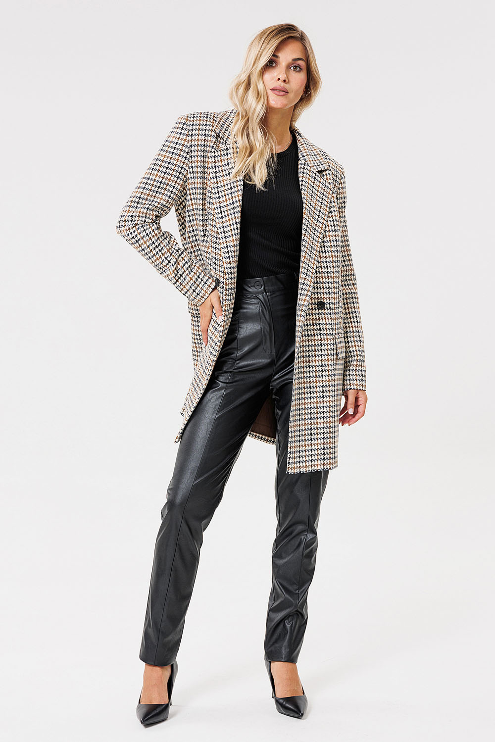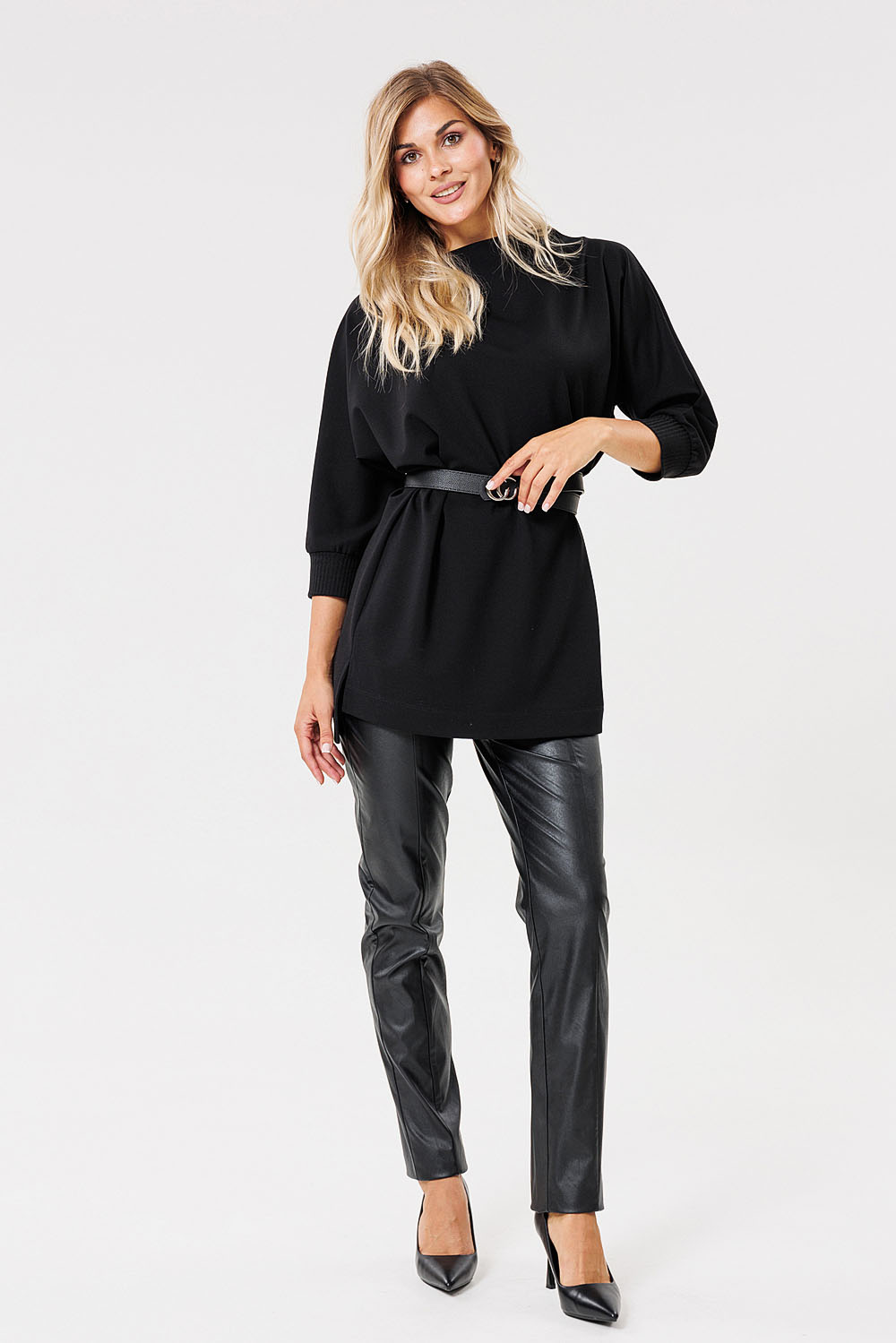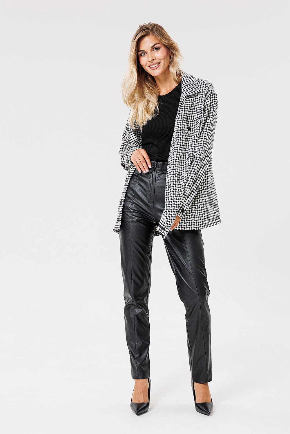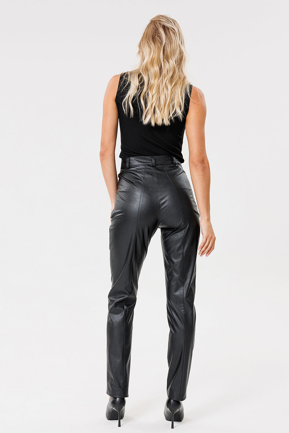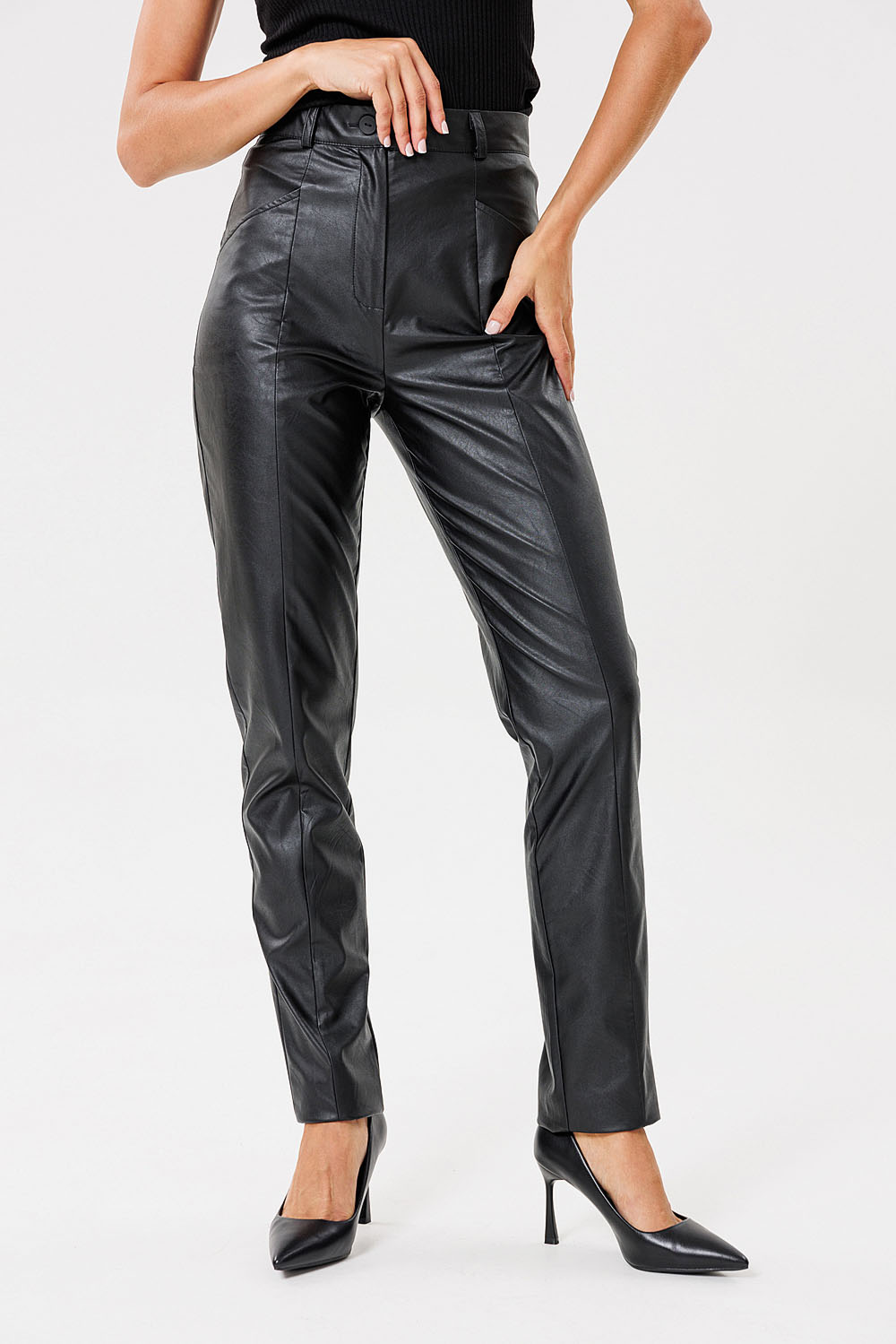 Брюки женские из эко-кожи с карманами. Изнаночная сторона кожи вискозная. По центру передней и задней половинок расположены швы. Верх брюк обработан притачным поясом со шлевками.