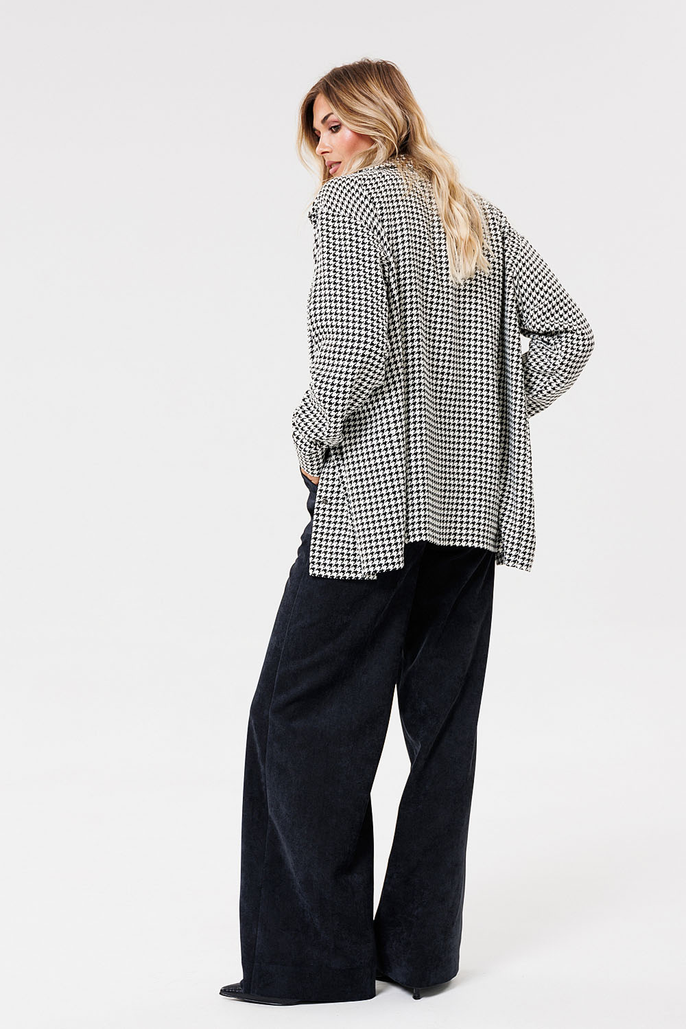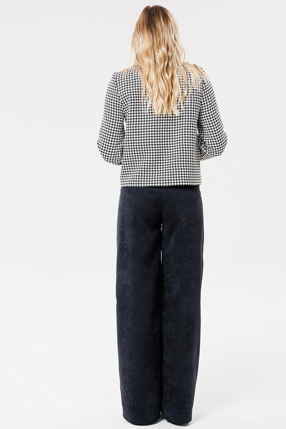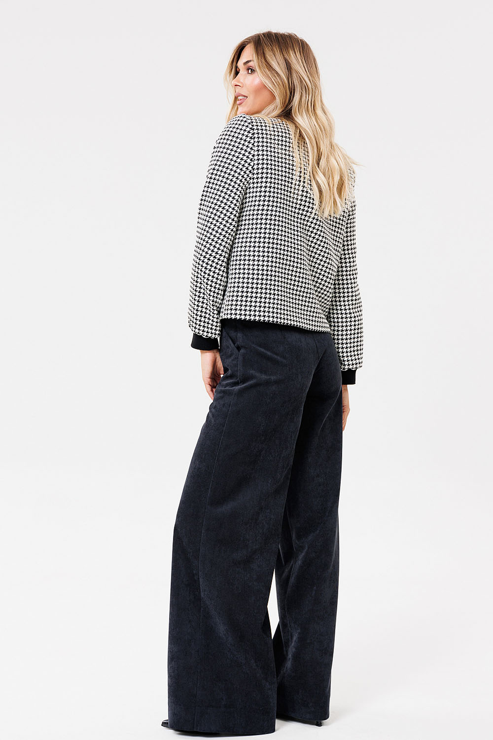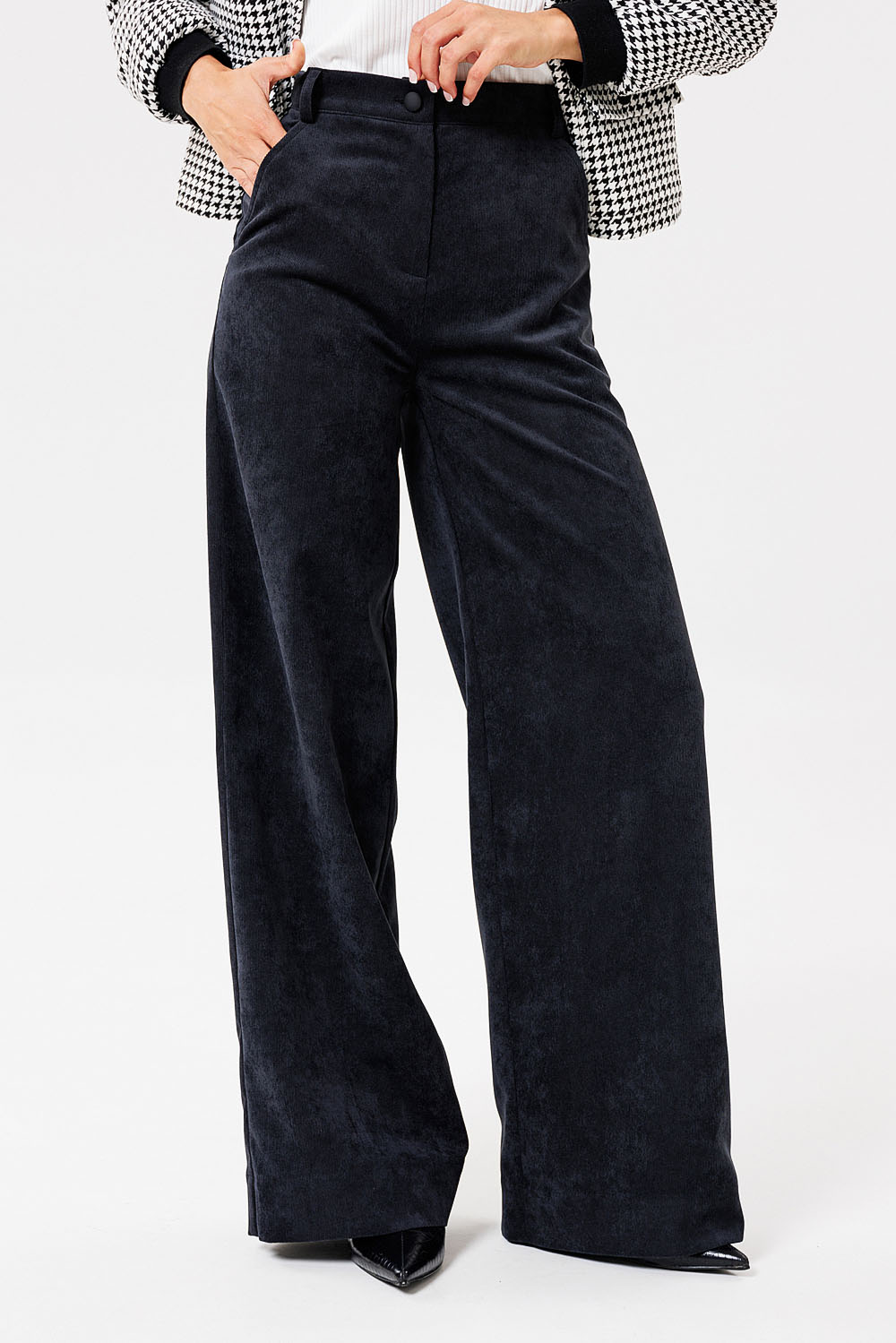 Брюки женские прямые из текстильной ткани (вельвет-штрукс). В боковых швах расположены подрезные карманы. По задним половинкам расположены талиевые вытачки. Верх брюк обработан притачным поясом со шлевками.