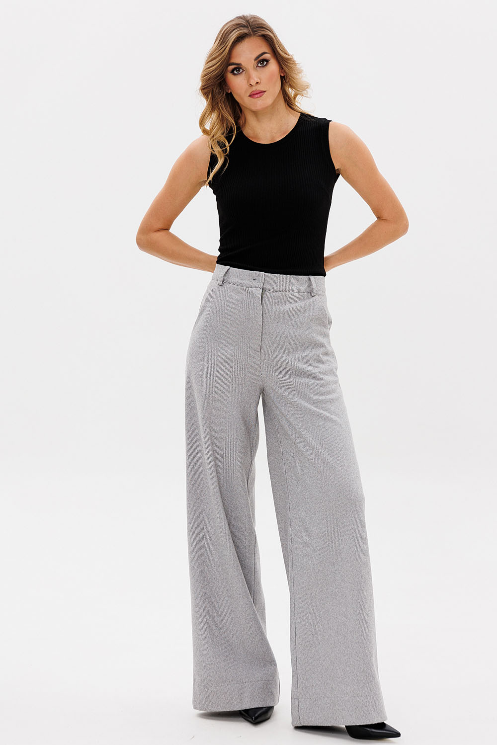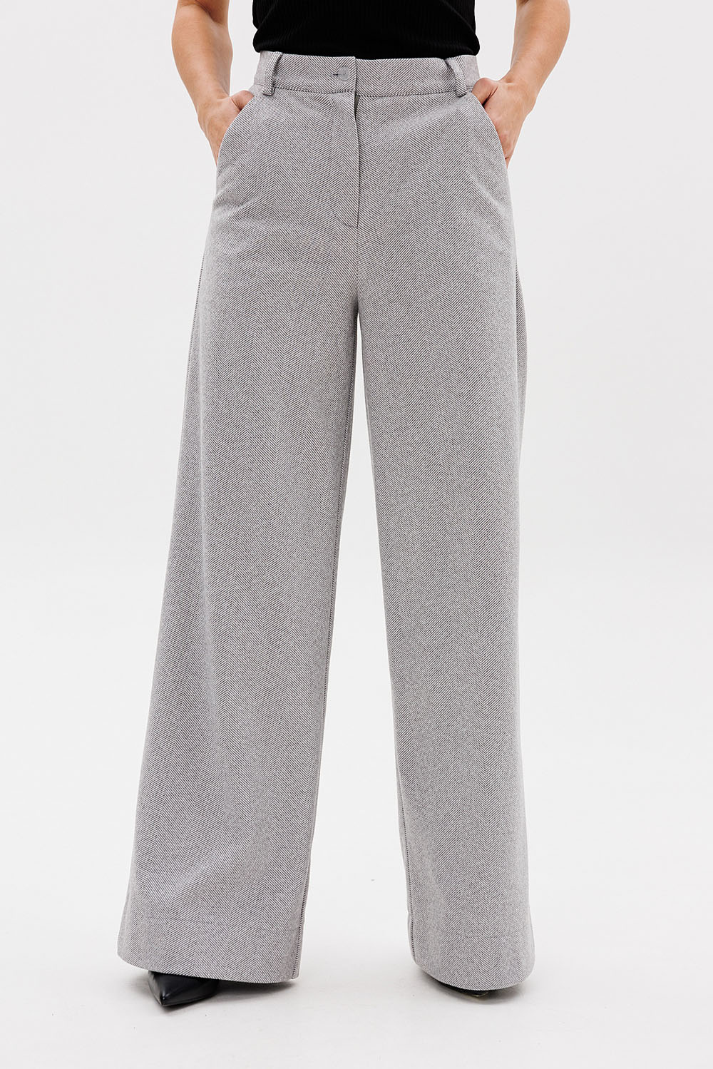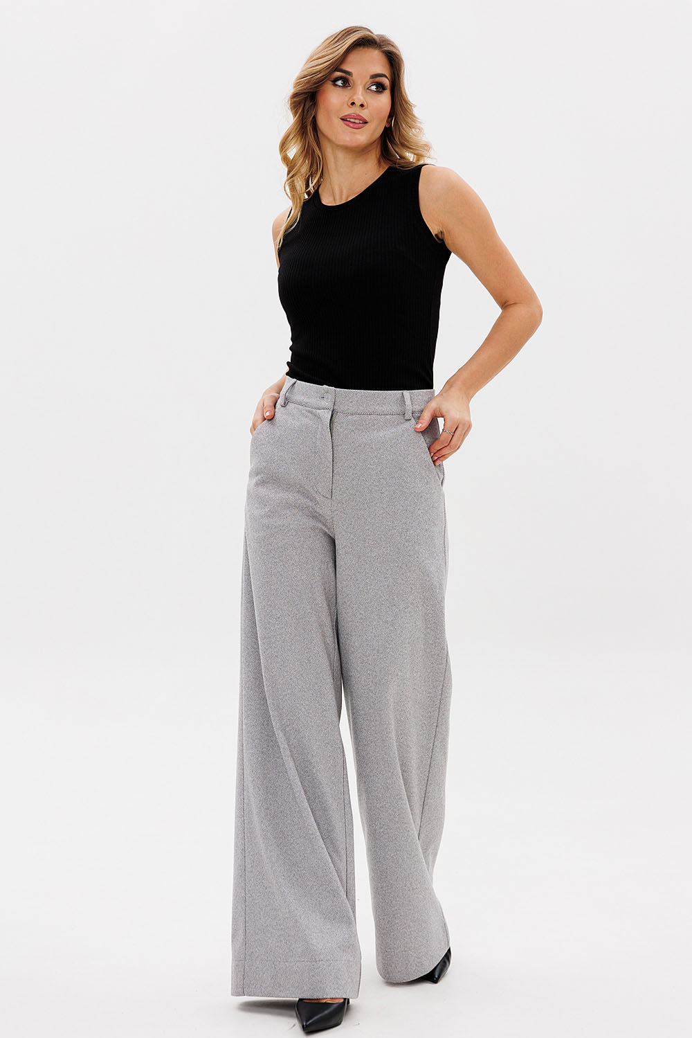 Брюки женские прямые из трикотажной ткани. В боковых швах расположены подрезные карманы. По задним половинкам расположены талиевые вытачки. Верх брюк обработан притачным поясом со шлевками.