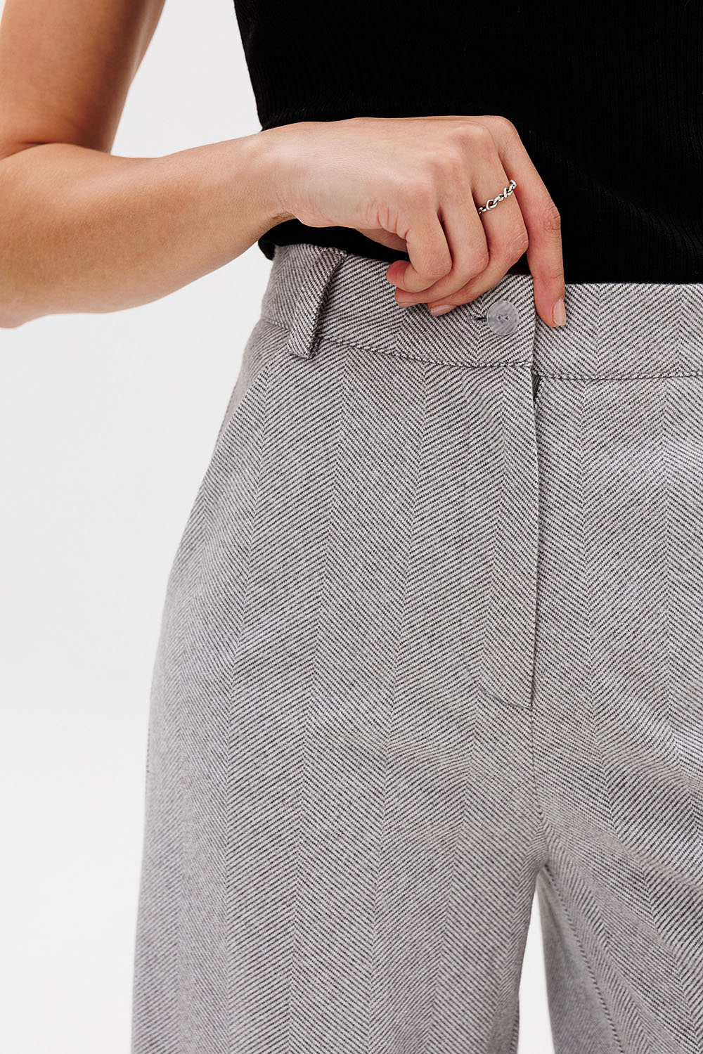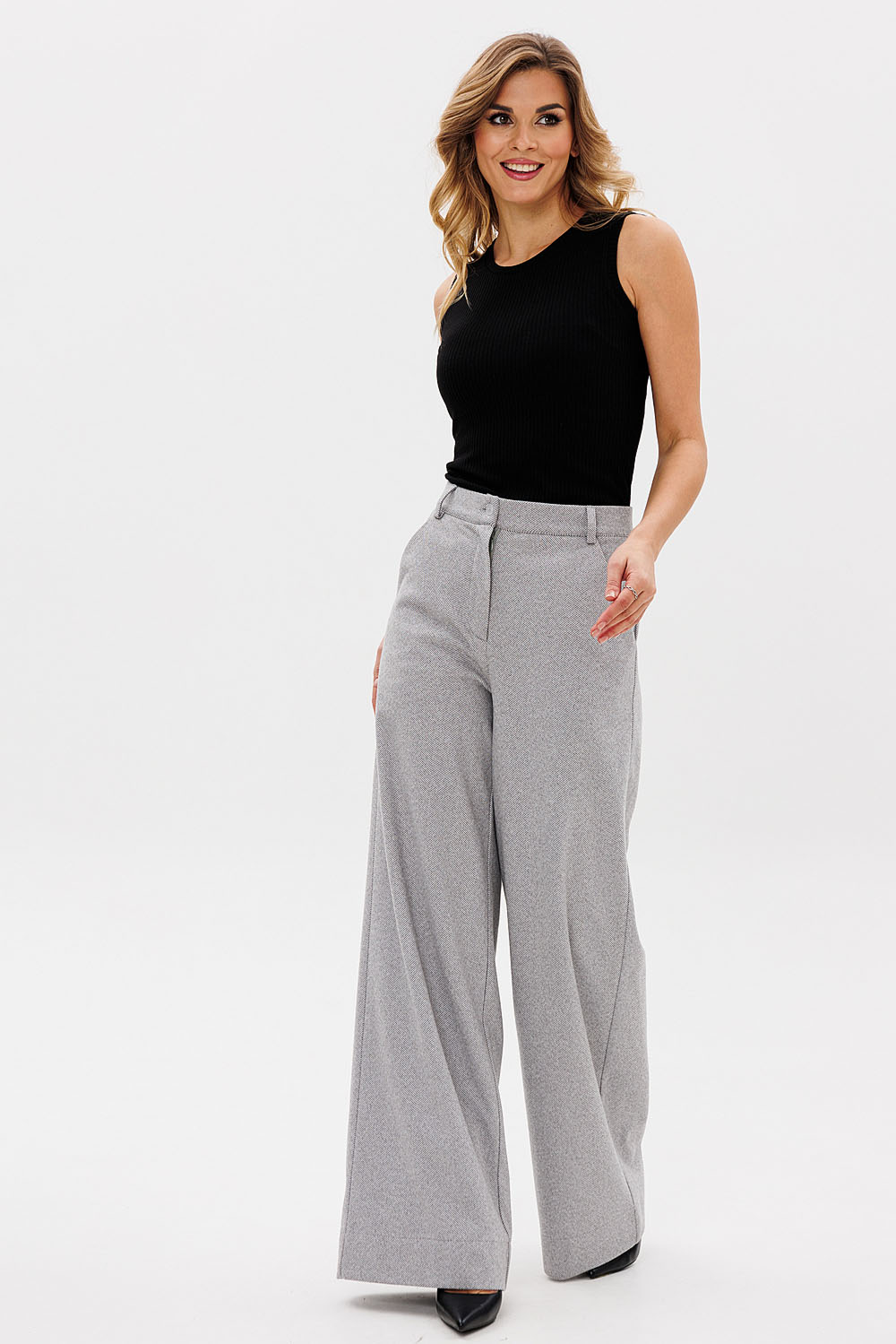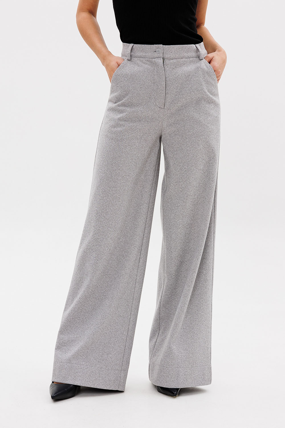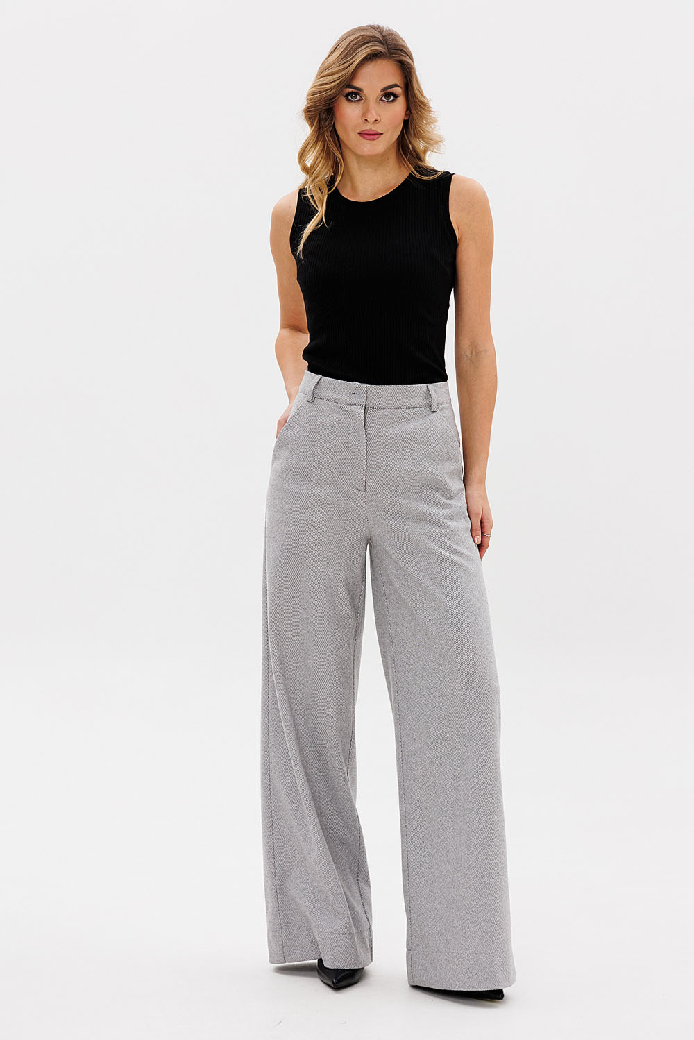 Брюки женские прямые из трикотажной ткани. В боковых швах расположены подрезные карманы. По задним половинкам расположены талиевые вытачки. Верх брюк обработан притачным поясом со шлевками.
