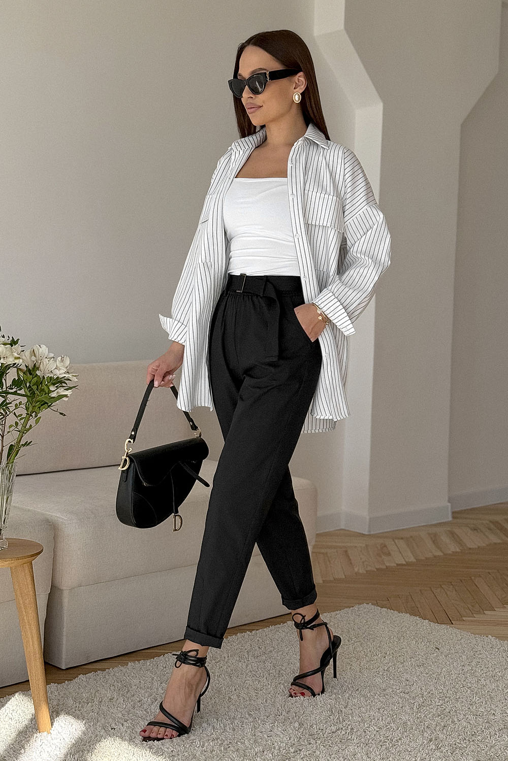 Брюки женские из текстильной ткани, слегка заужены к низу. В боковых швах расположены карманы. По низу передних половинок есть защип. Задняя половинка брюк с отрезной кокеткой и накладными карманами. Вверх брюк обработан поясом с резинкой (без молнии). ПОЯС ВХОДИТ В КОМПЛЕКТ.