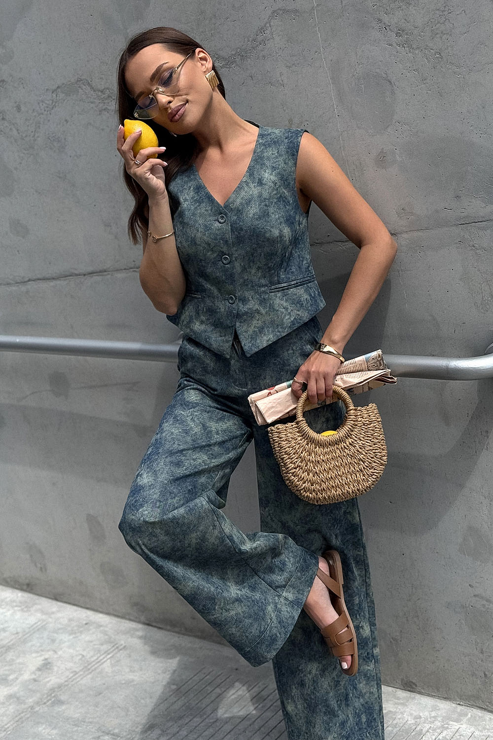 Брюки женские прямые из текстильной ткани (джинс). В боковых швах расположены подрезные карманы. По задним половинкам расположены талиевые вытачки. Верх брюк обработан притачным поясом со шлевками.