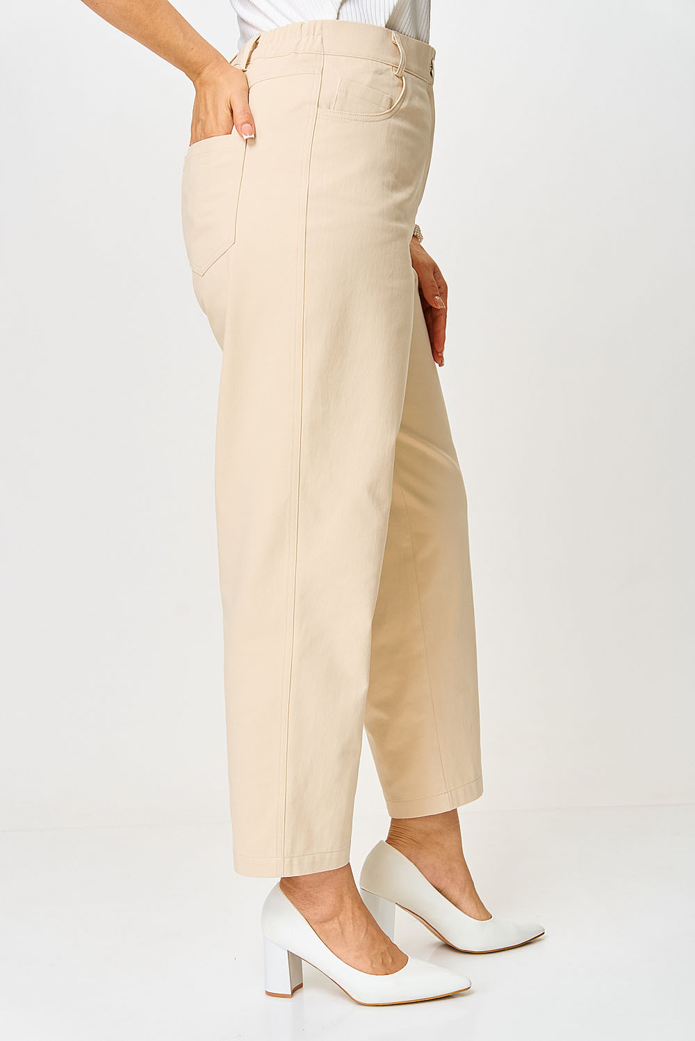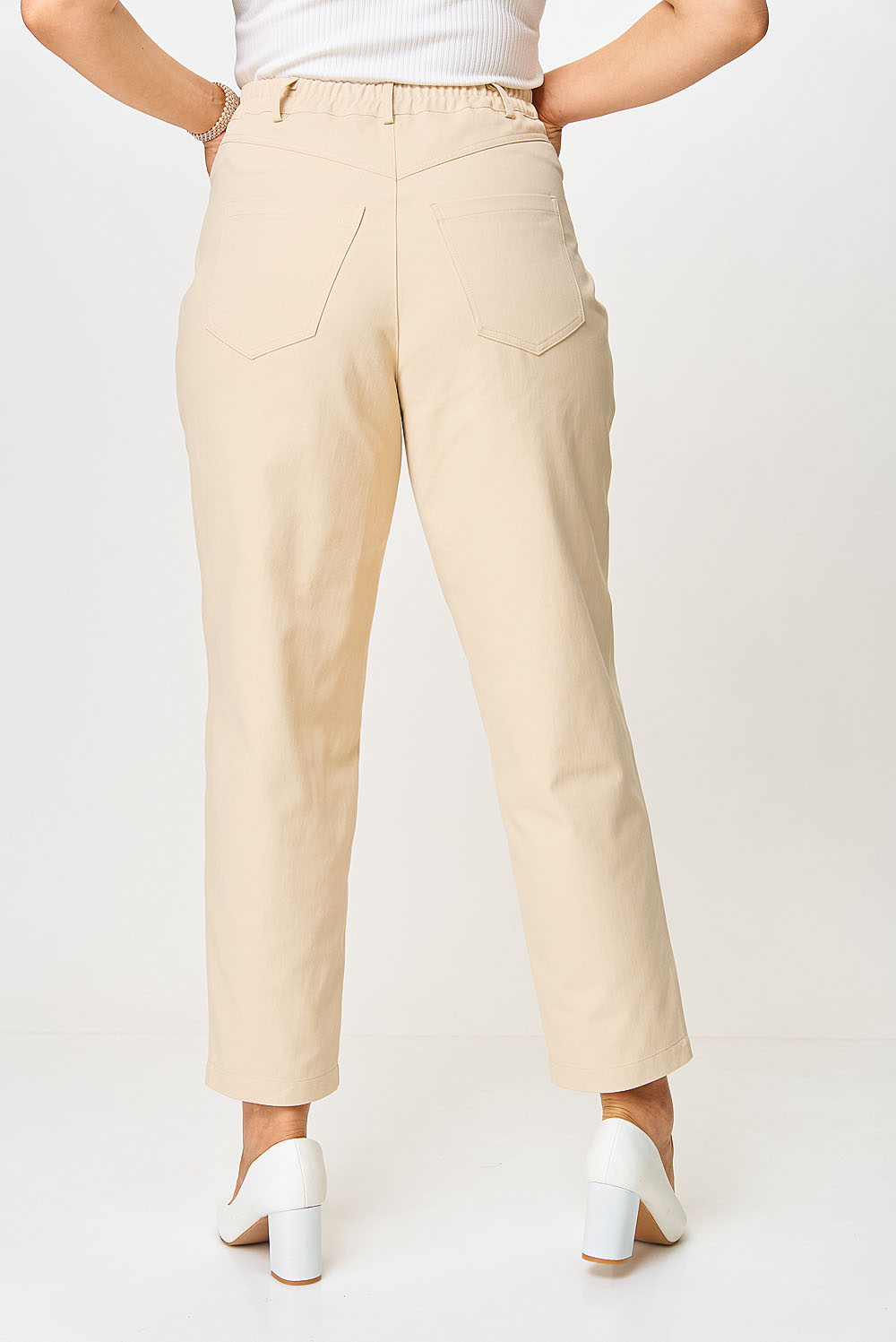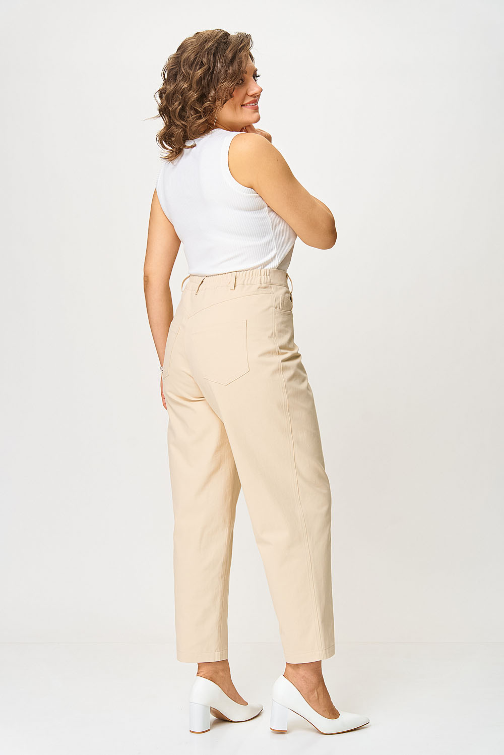 Брюки женские из джинсовой ткани свободного силуэта с высокой посадкой! (“брюки-бананы”). По переду расположены карманы. На задней половинке отрезная кокетка и накладные карманы. Пояс притачной со шлевками. По спинке вставлена резинка. Застежка-гульфик на молнию и пуговицу.