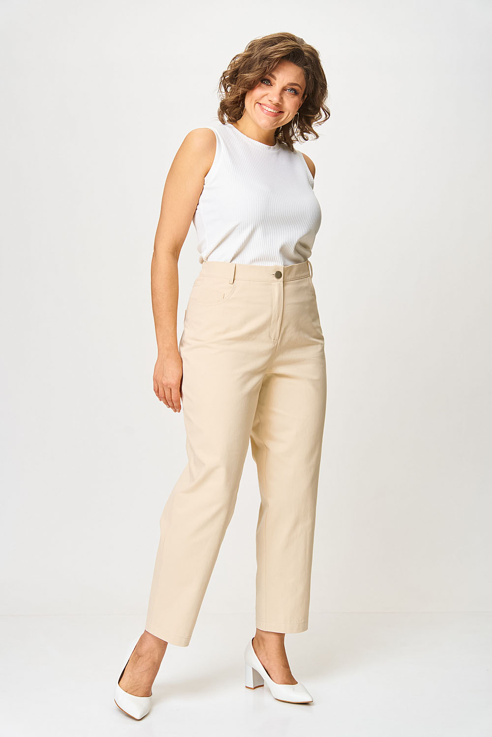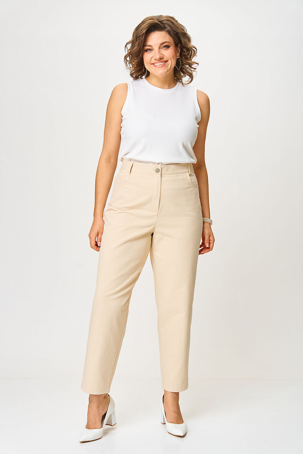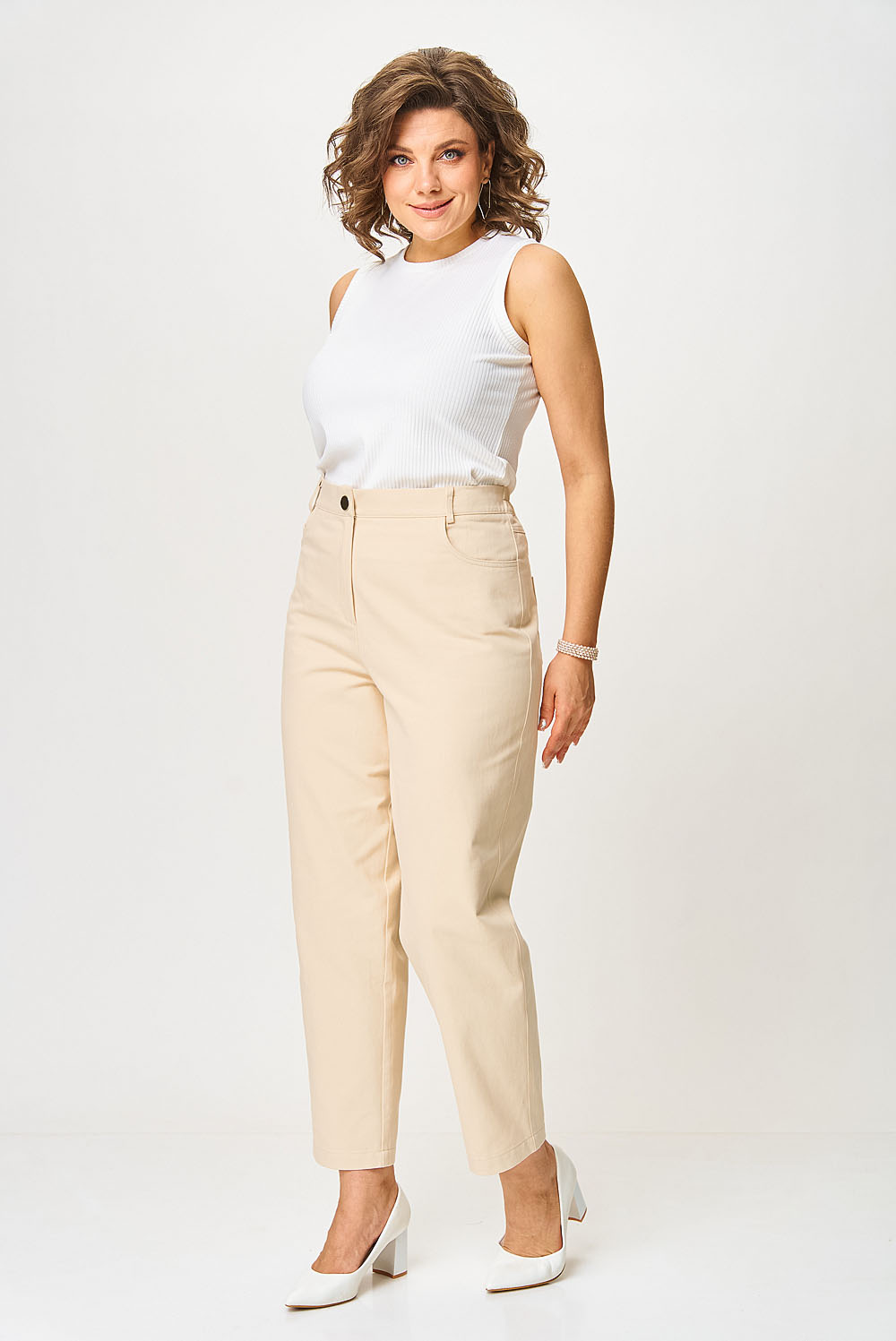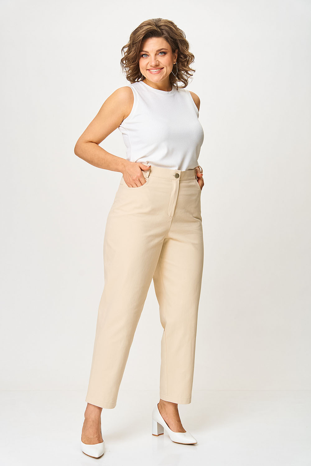 Брюки женские из джинсовой ткани свободного силуэта с высокой посадкой! (“брюки-бананы”). По переду расположены карманы. На задней половинке отрезная кокетка и накладные карманы. Пояс притачной со шлевками. По спинке вставлена резинка. Застежка-гульфик на молнию и пуговицу.