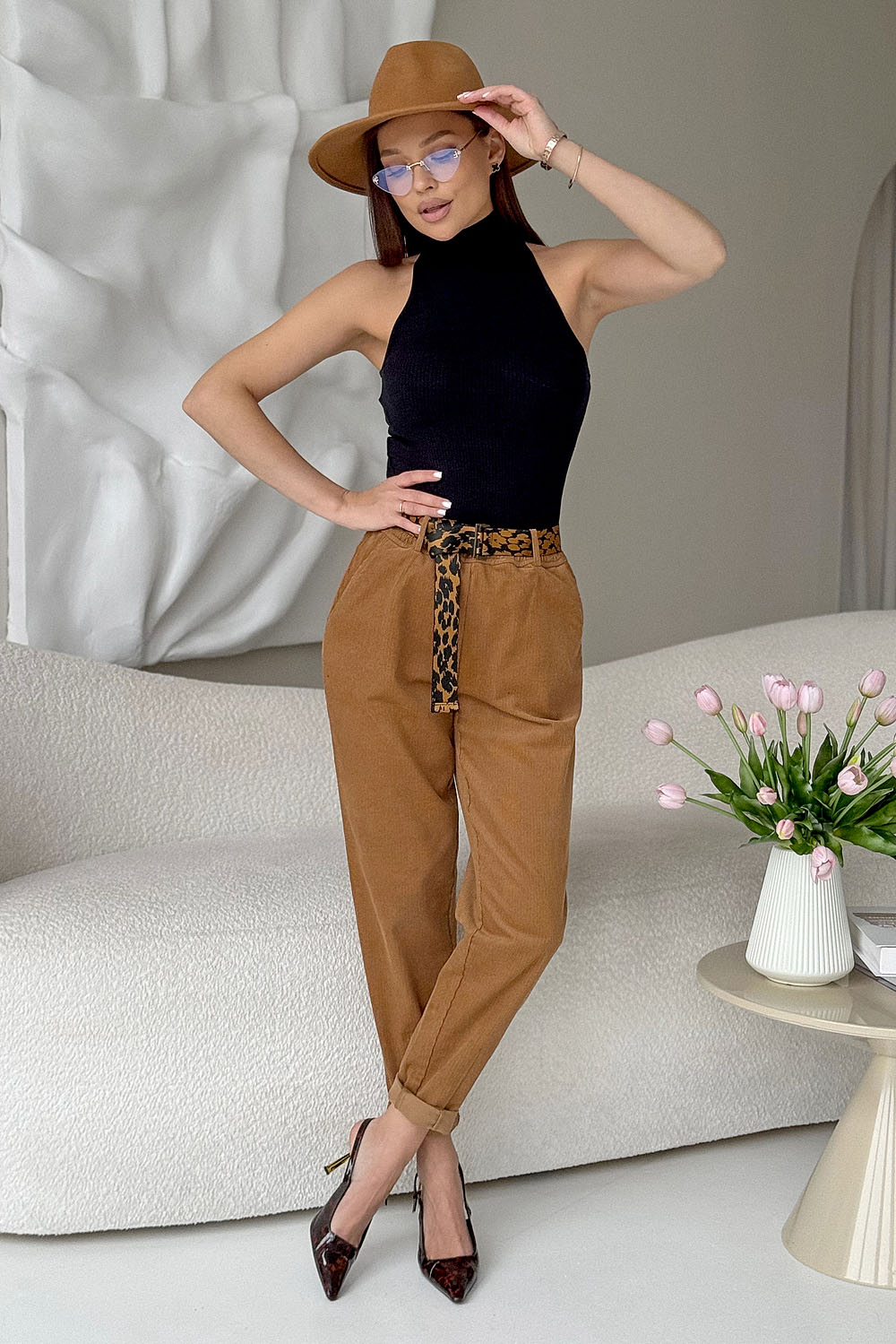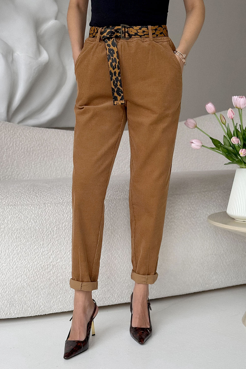 Брюки женские из текстильной ткани (вельвет-штрукс), слегка заужены к низу. В боковых швах расположены карманы. По низу передних половинок есть защип. Задняя половинка брюк с отрезной кокеткой и накладными карманами. Вверх брюк обработан поясом с резинкой (без молнии). ПОЯС ВХОДИТ В КОМПЛЕКТ.