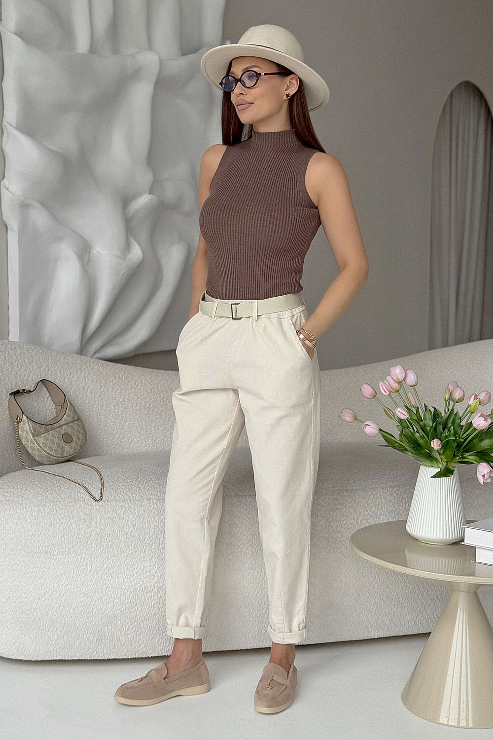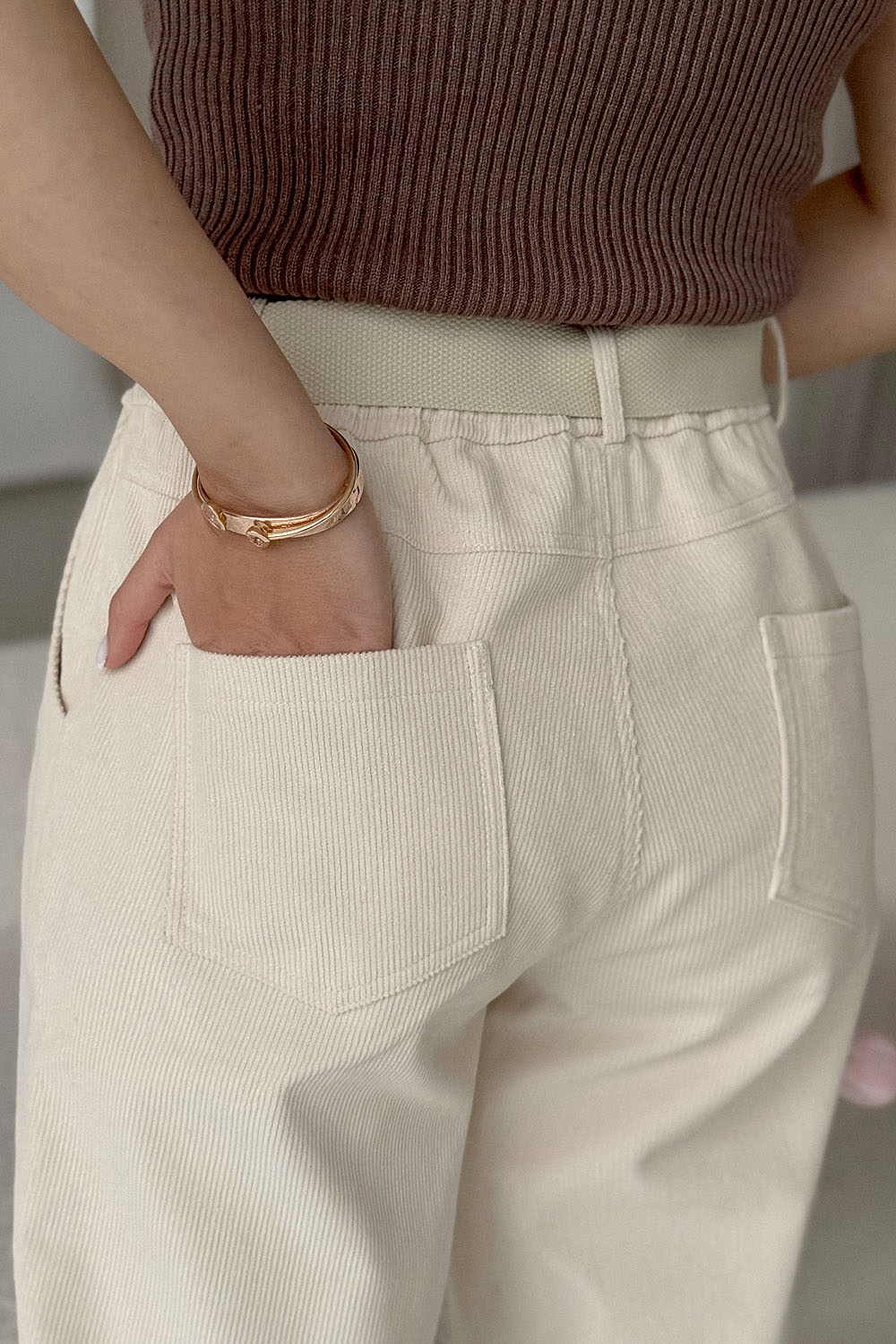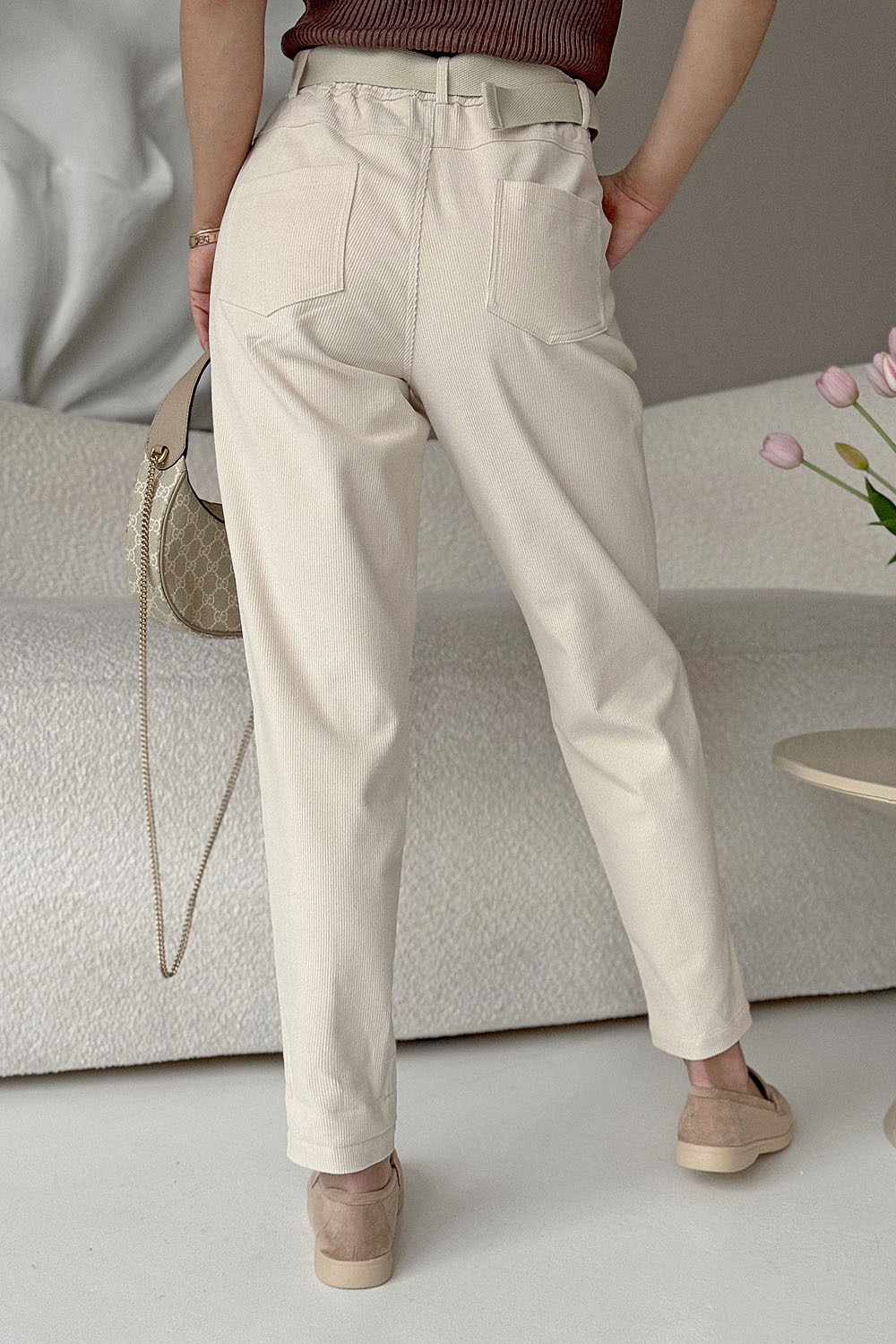 Брюки женские из текстильной ткани (вельвет-штрукс), слегка заужены к низу. В боковых швах расположены карманы. По низу передних половинок есть защип. Задняя половинка брюк с отрезной кокеткой и накладными карманами. Вверх брюк обработан поясом с резинкой (без молнии). ПОЯС ВХОДИТ В КОМПЛЕКТ.