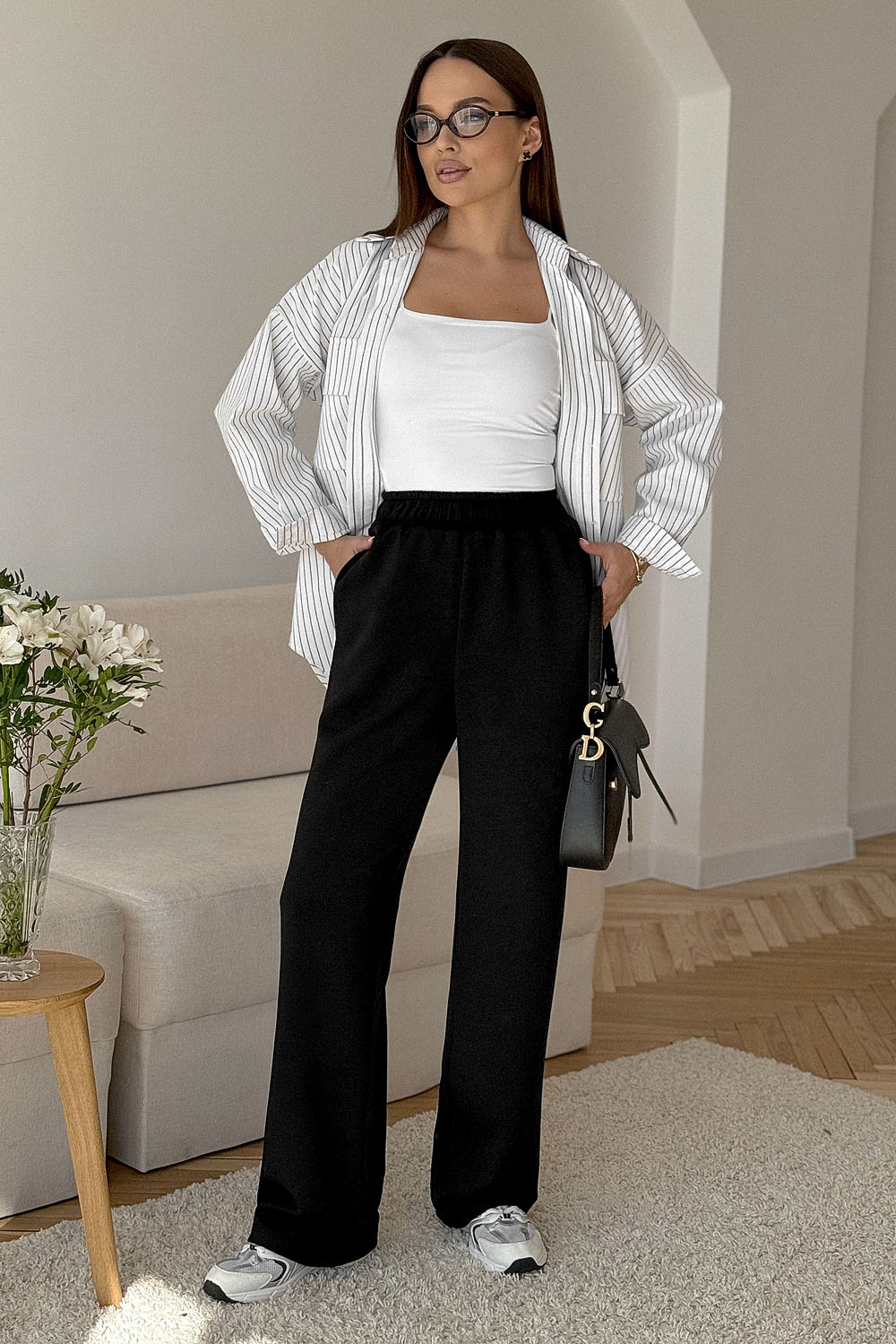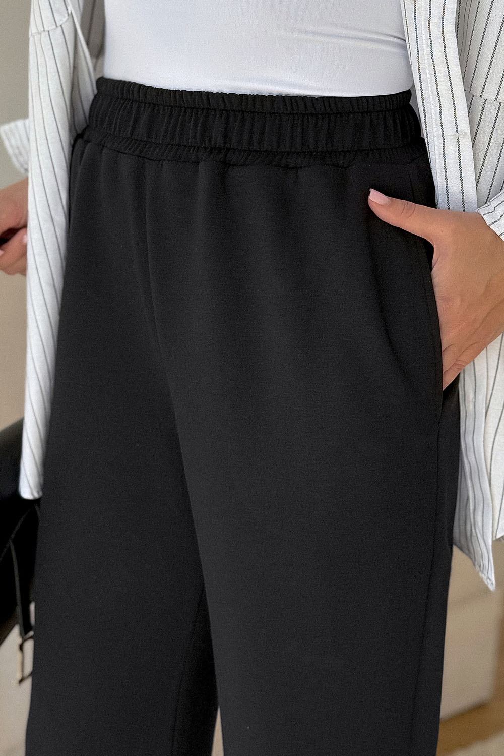 Брюки женские из трикотажной ткани. В боковых швах расположены карманы. В пояс вставлена резинка (молнии нет).