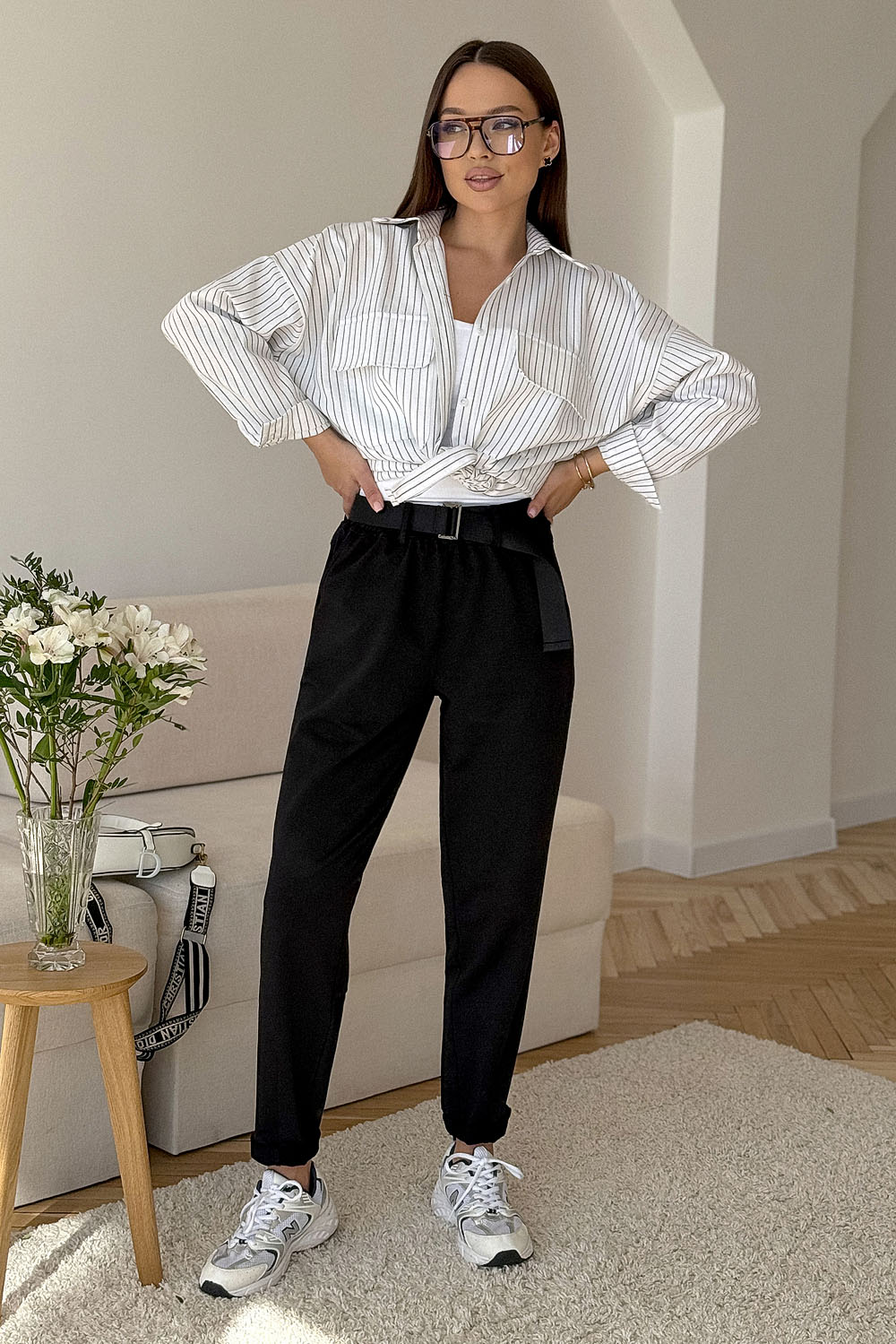 Брюки женские из трикотажной хлопковой ткани (двунитка), слегка заужены к низу. В боковых швах расположены карманы. По низу передних половинок есть защип. Задняя половинка брюк с отрезной кокеткой и накладными карманами. Вверх брюк обработан поясом с резинкой (без молнии). ПОЯС ВХОДИТ В КОМПЛЕКТ.