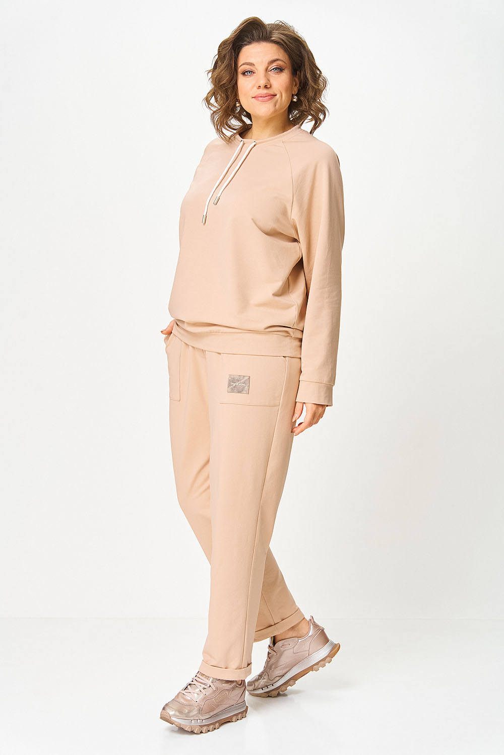 Брюки женские из трикотажной ткани (двунитка), слегка заужены к низу. По переду брюк расположены накладные карманы. На левом кармане настрочной декоративный элемент. В пояс вставлена резинка по кругу.