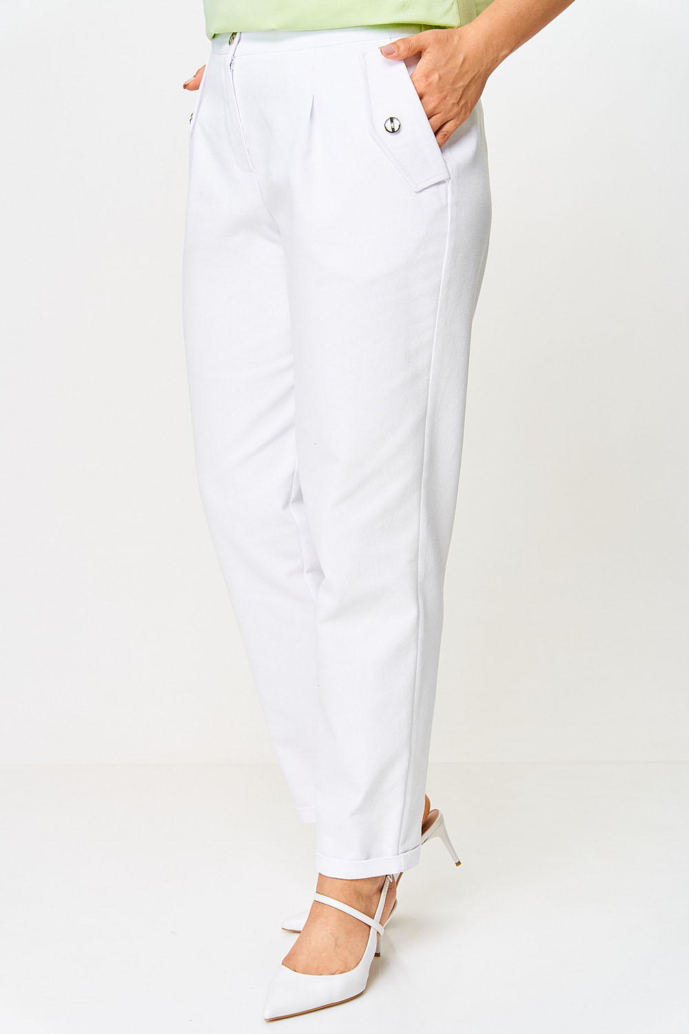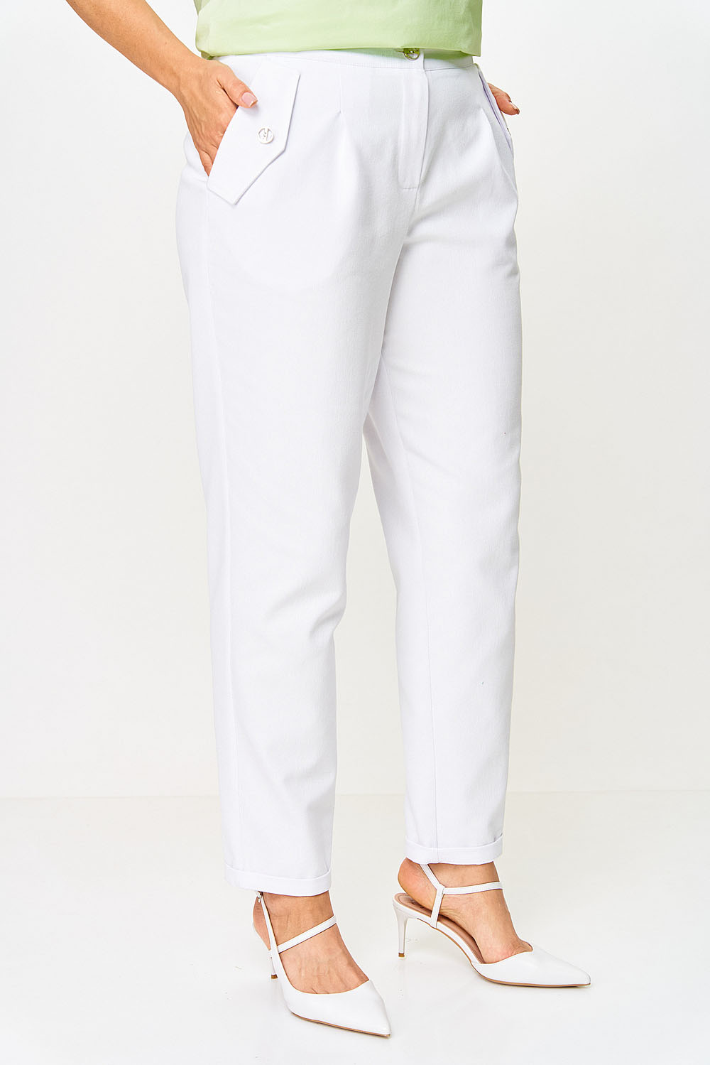 Брюки женские из джинсовой ткани, полуприлегающего силуэта, слегка заужены к низу. По переду брюк расположена складка. Карман в боковом шве оформлен клапаном. Пояс притачной, по задней части резинка. Застежка брюк на петлю-пуговицу и молнию.