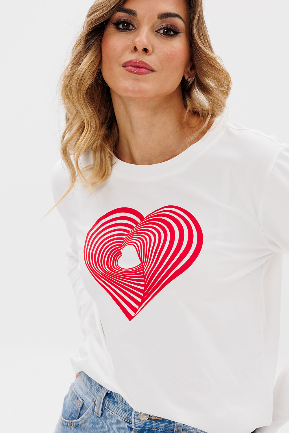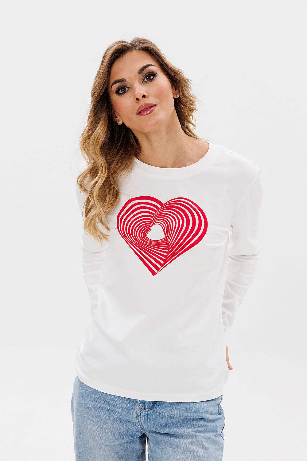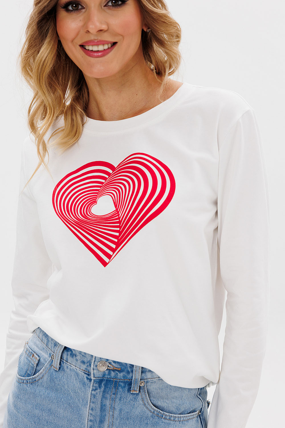 Лонгслив женский полуприлегающего силуэта из трикотажной ткани. По переду расположен принт. Рукав втачной, одношовный. Вырез горловины круглый.