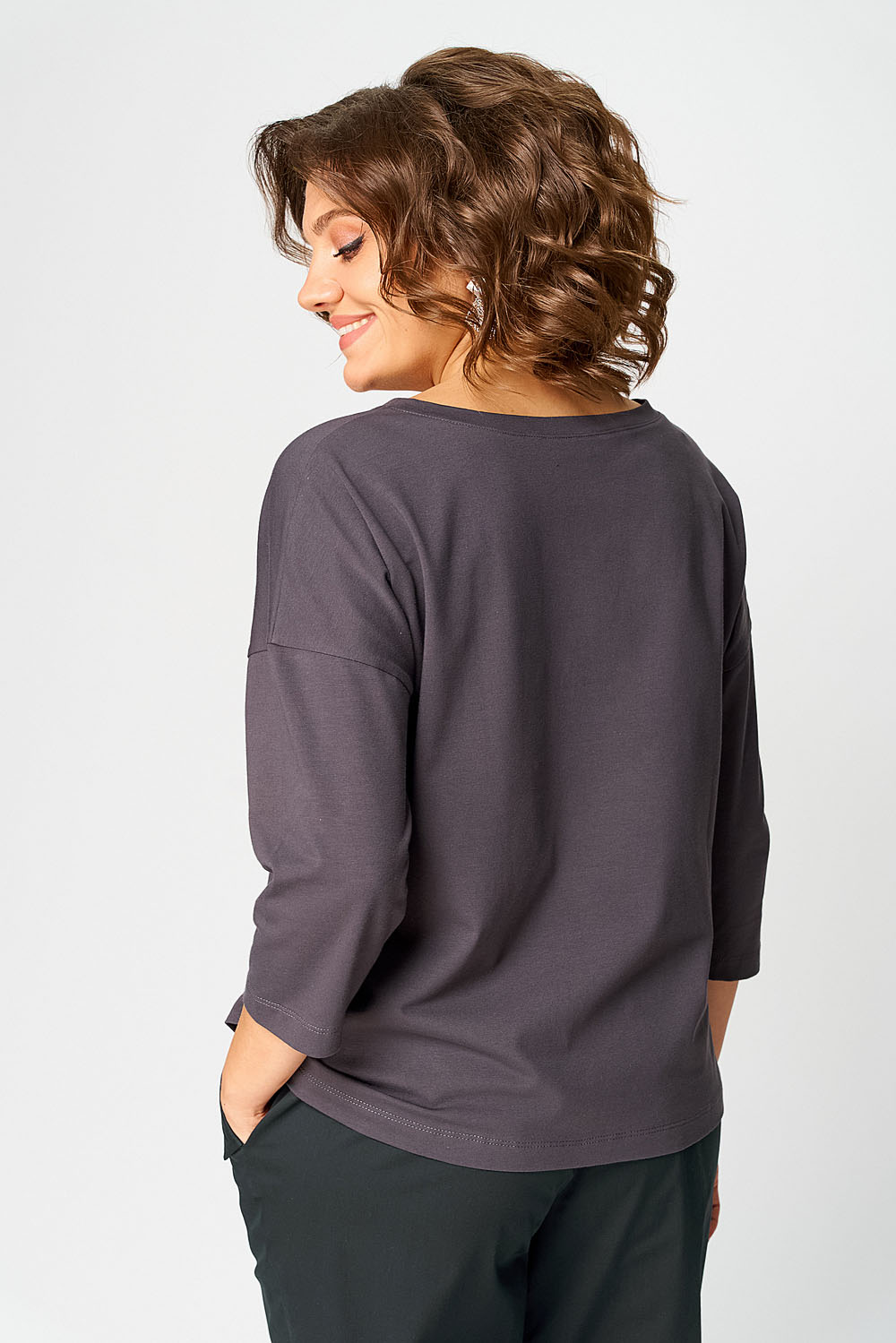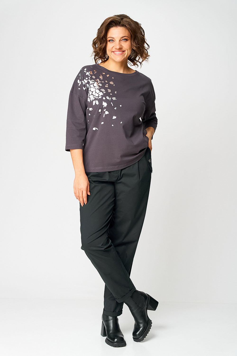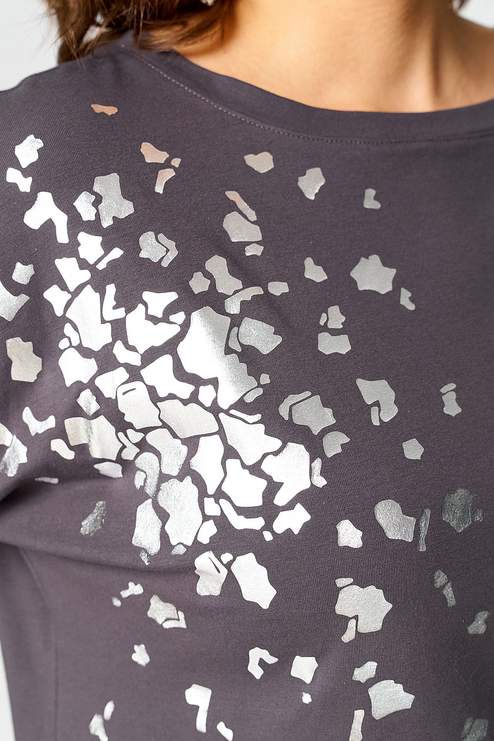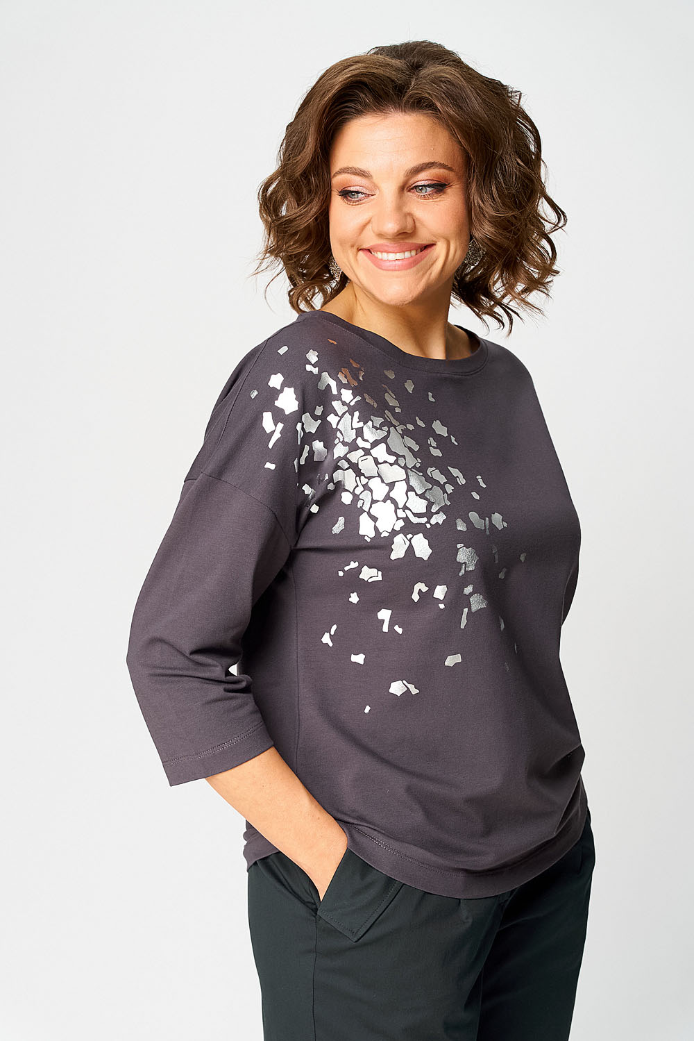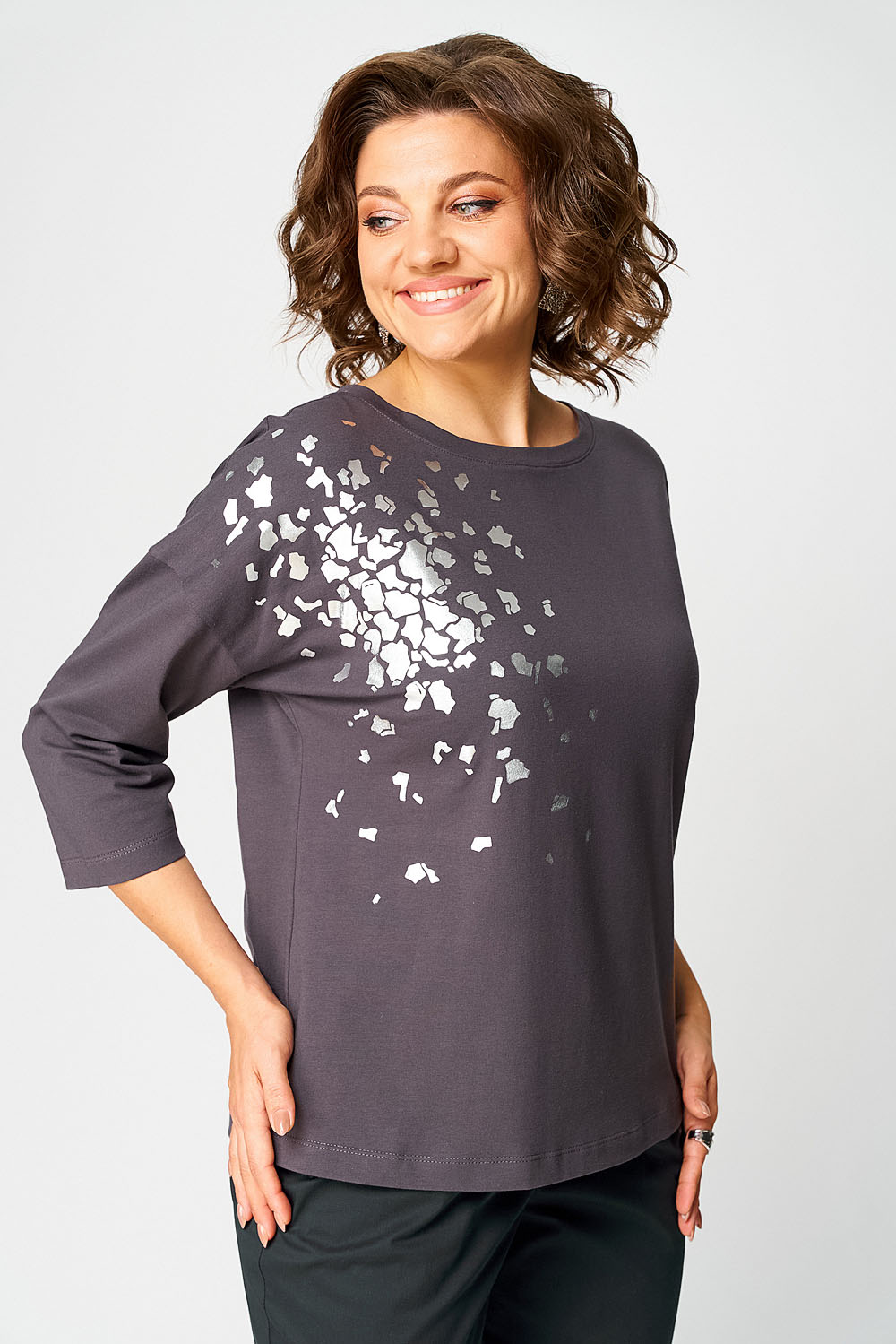 Джемпер женский из трикотажной ткани. По переду расположен принт. Спущенное плечо, рукав 3/4. Вырез горловины круглый, оформлен притачной бейкой.