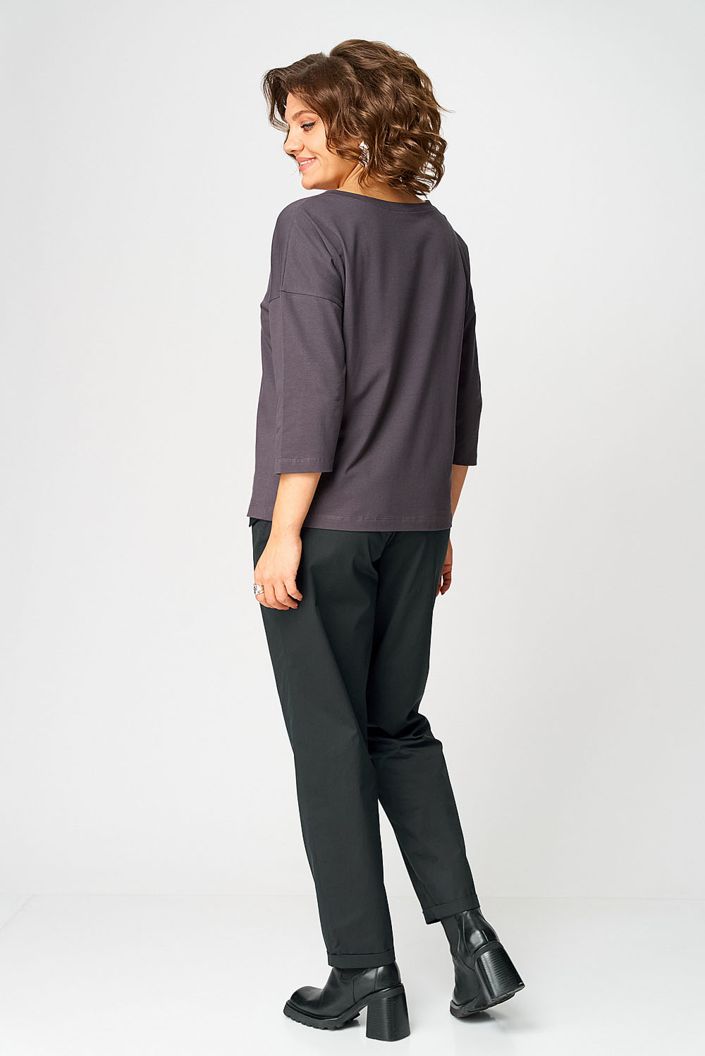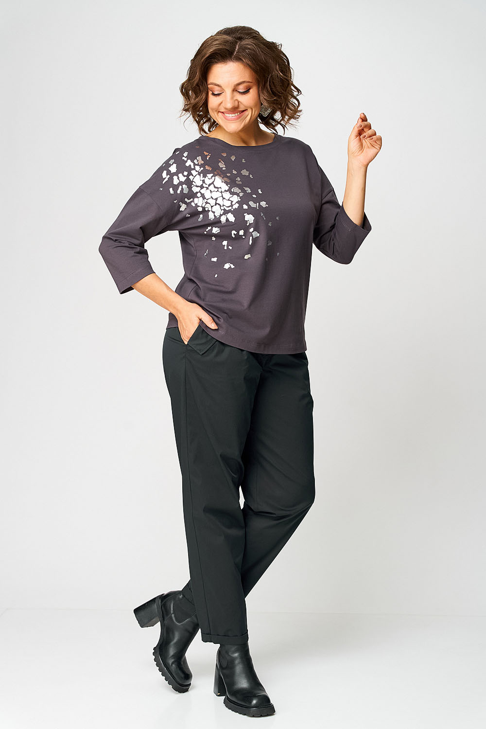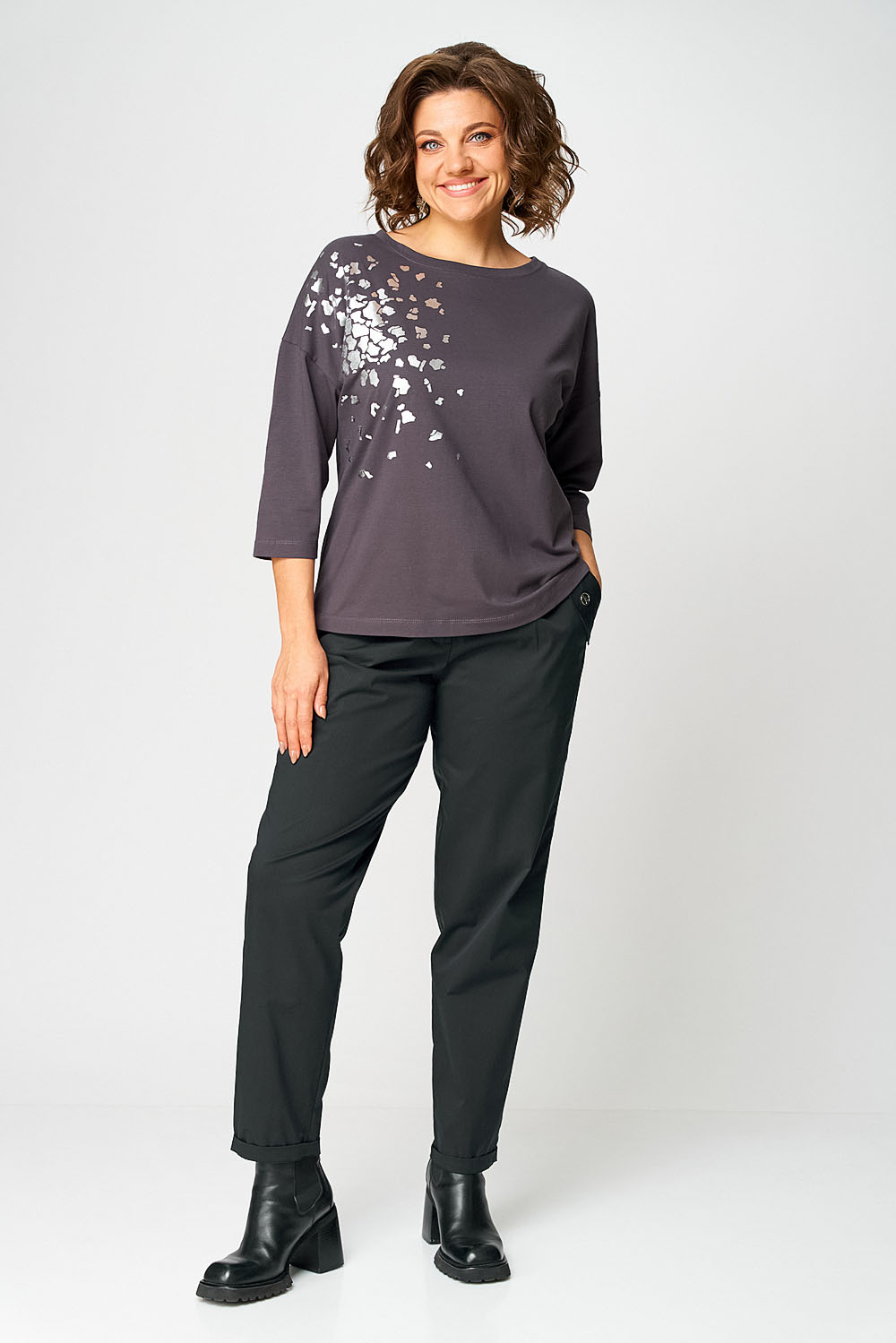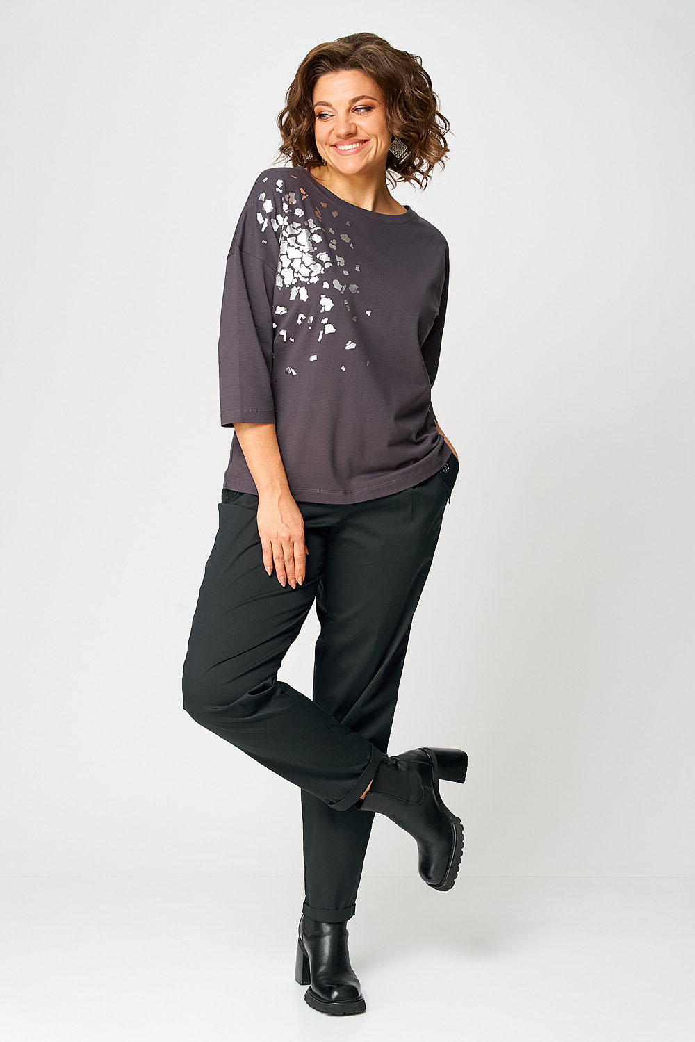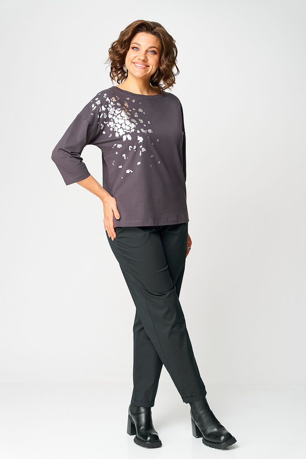 Джемпер женский из трикотажной ткани. По переду расположен принт. Спущенное плечо, рукав 3/4. Вырез горловины круглый, оформлен притачной бейкой.