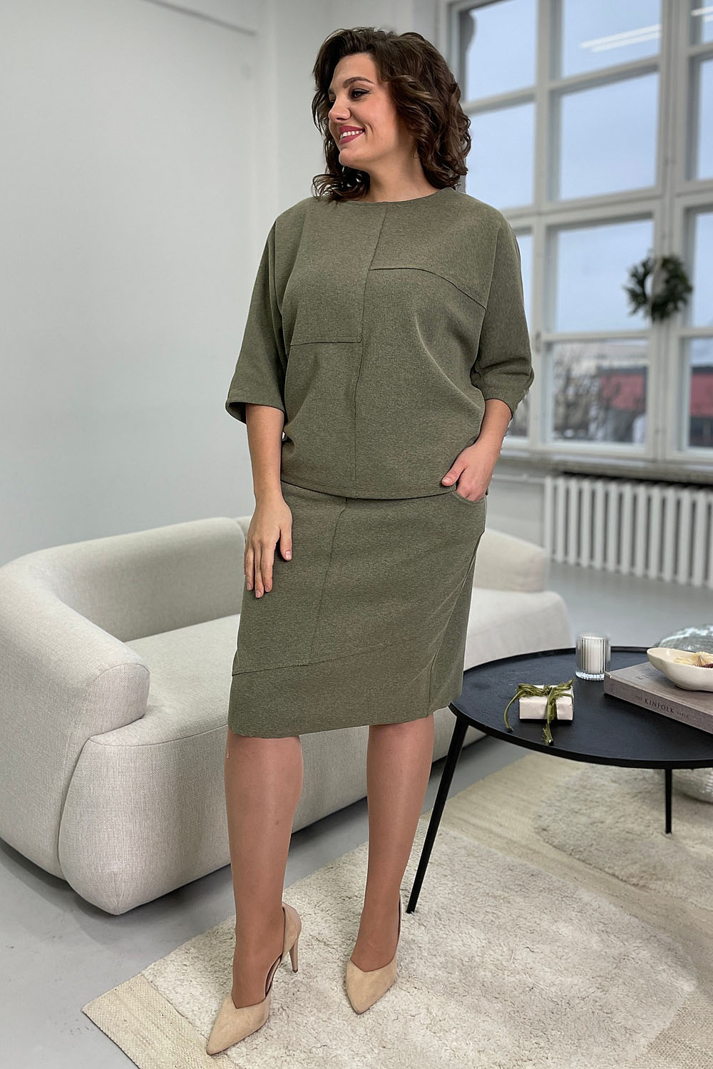Джемпер женский из трикотажной ткани, свободного силуэта. Перед и спинка джемпера оформлены настрочными швами с открытыми срезами. Рукав цельнокроенный, вырез горловины-круглый, оформлен бейкой.