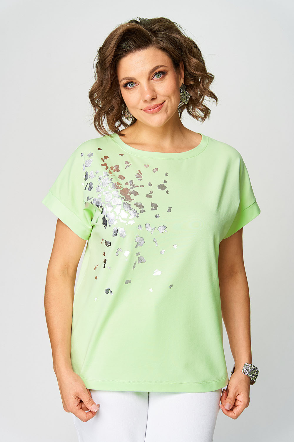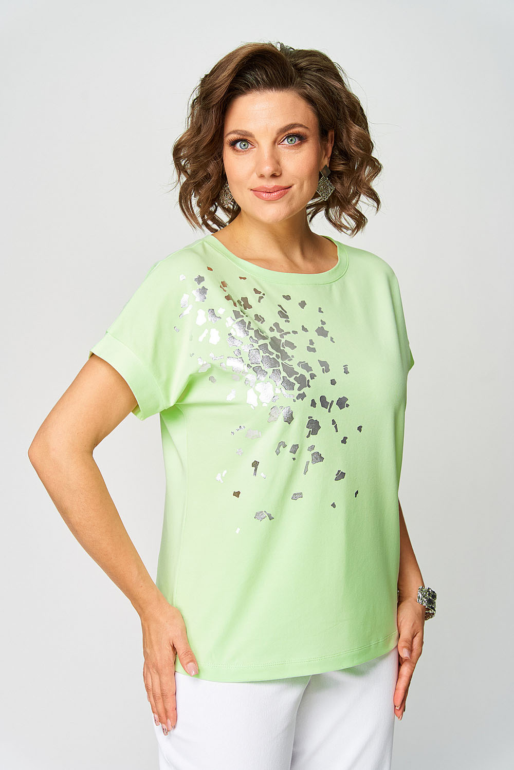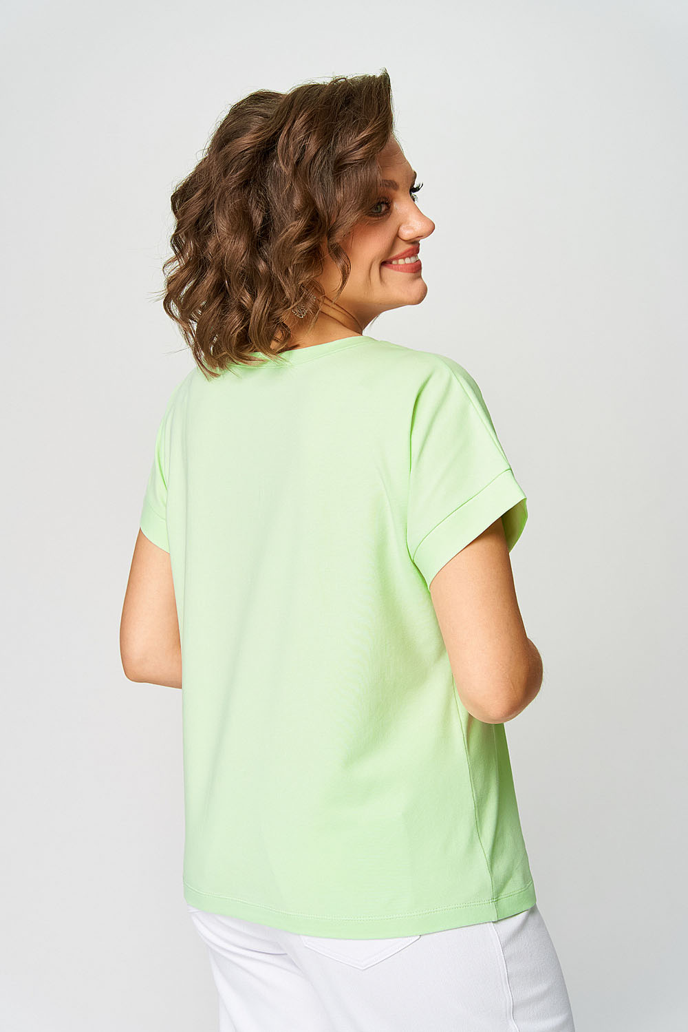 Джемпер из трикотажной хлопковой ткани, со спущенным плечом. Перед футболки с принтом. Вырез горловины круглый, оформлен бейкой. Спинка без среднего шва.