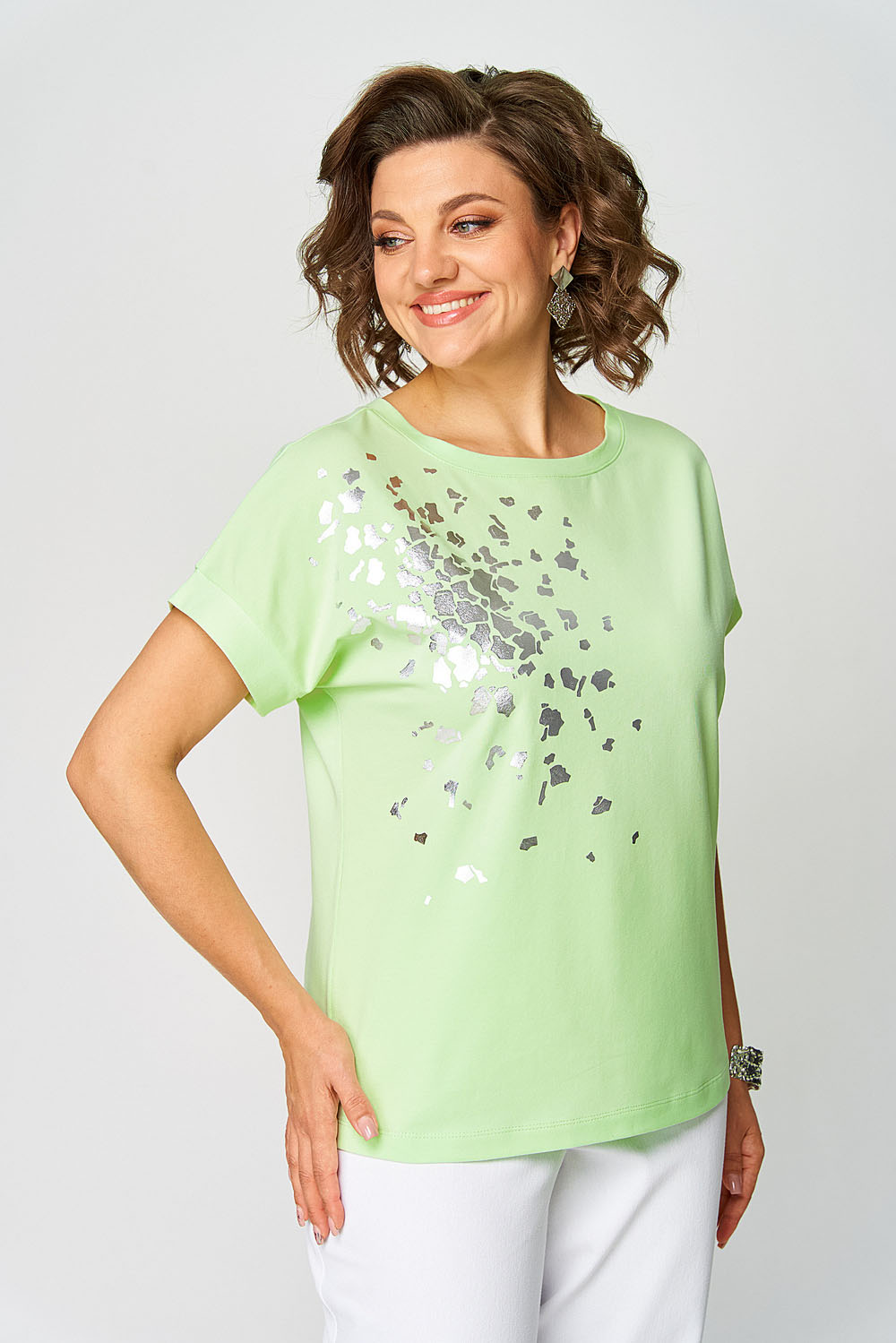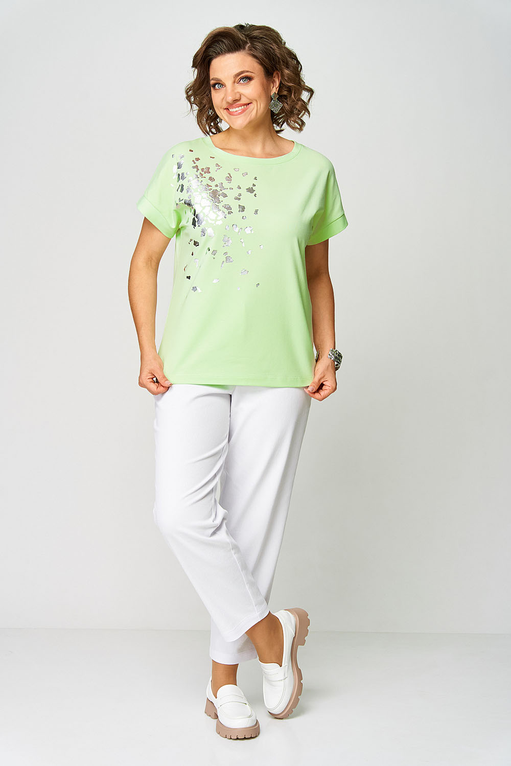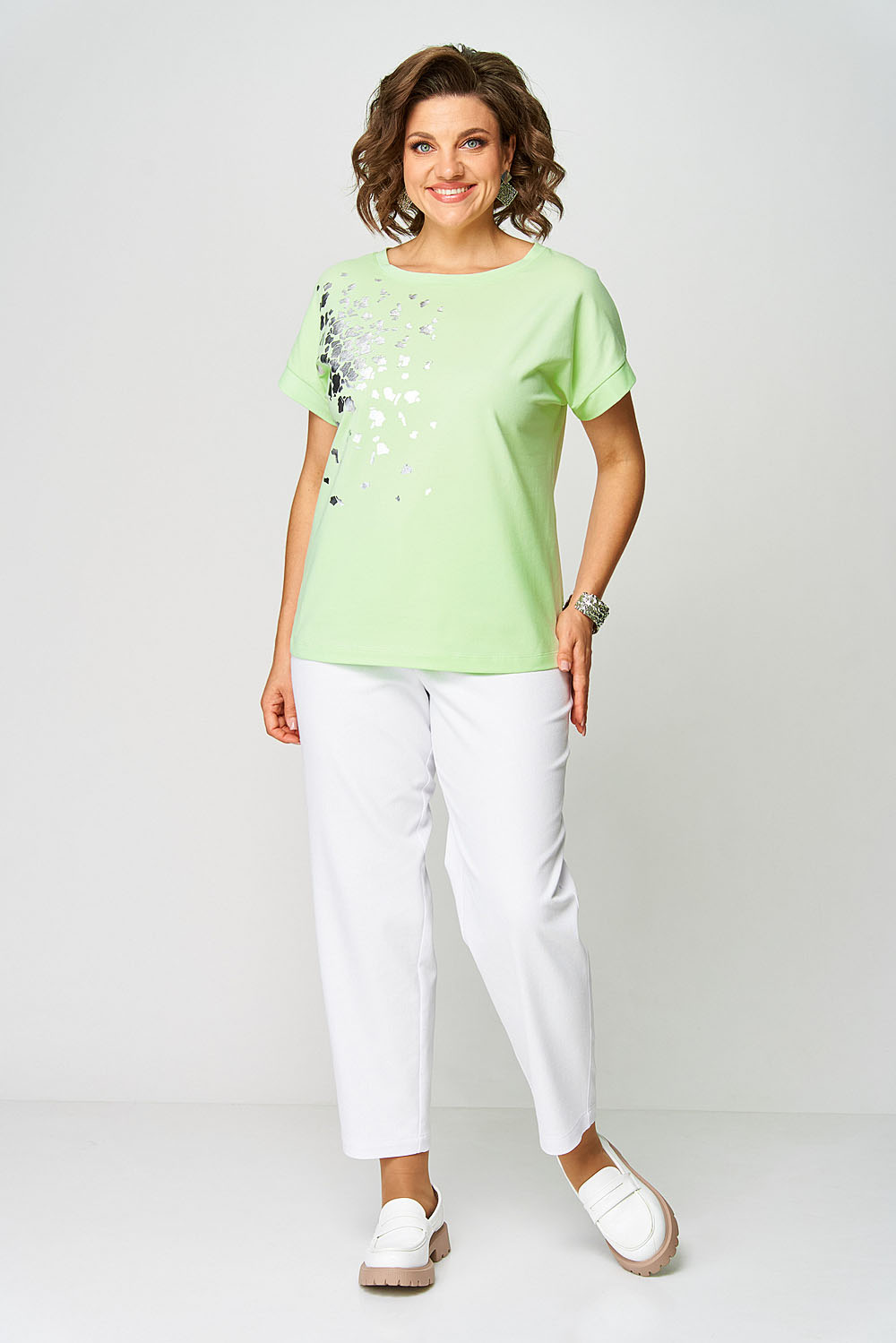Джемпер из трикотажной хлопковой ткани, со спущенным плечом. Перед футболки с принтом. Вырез горловины круглый, оформлен бейкой. Спинка без среднего шва.