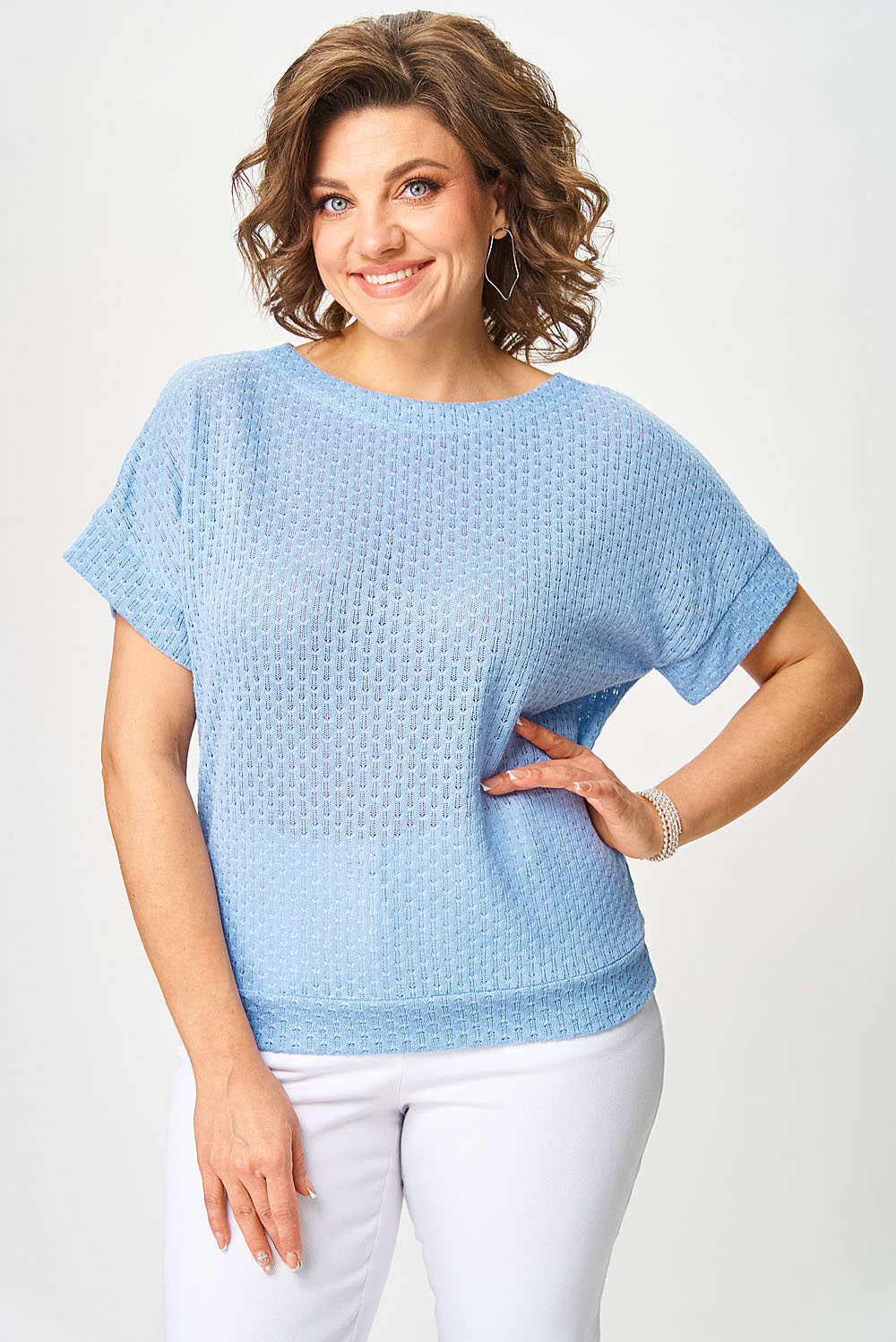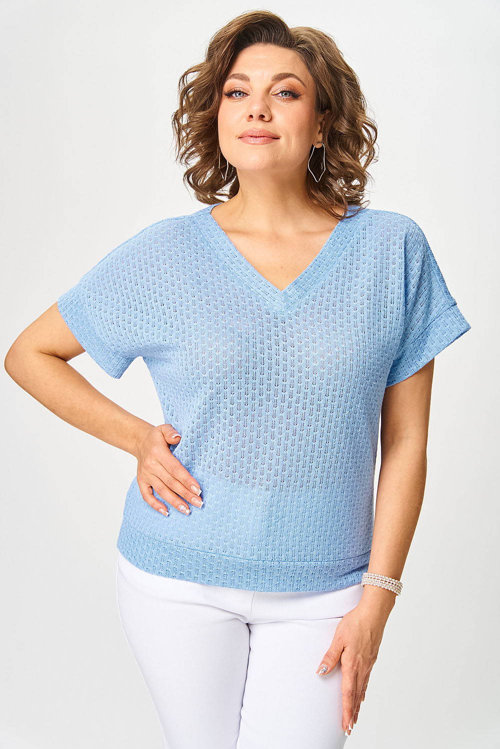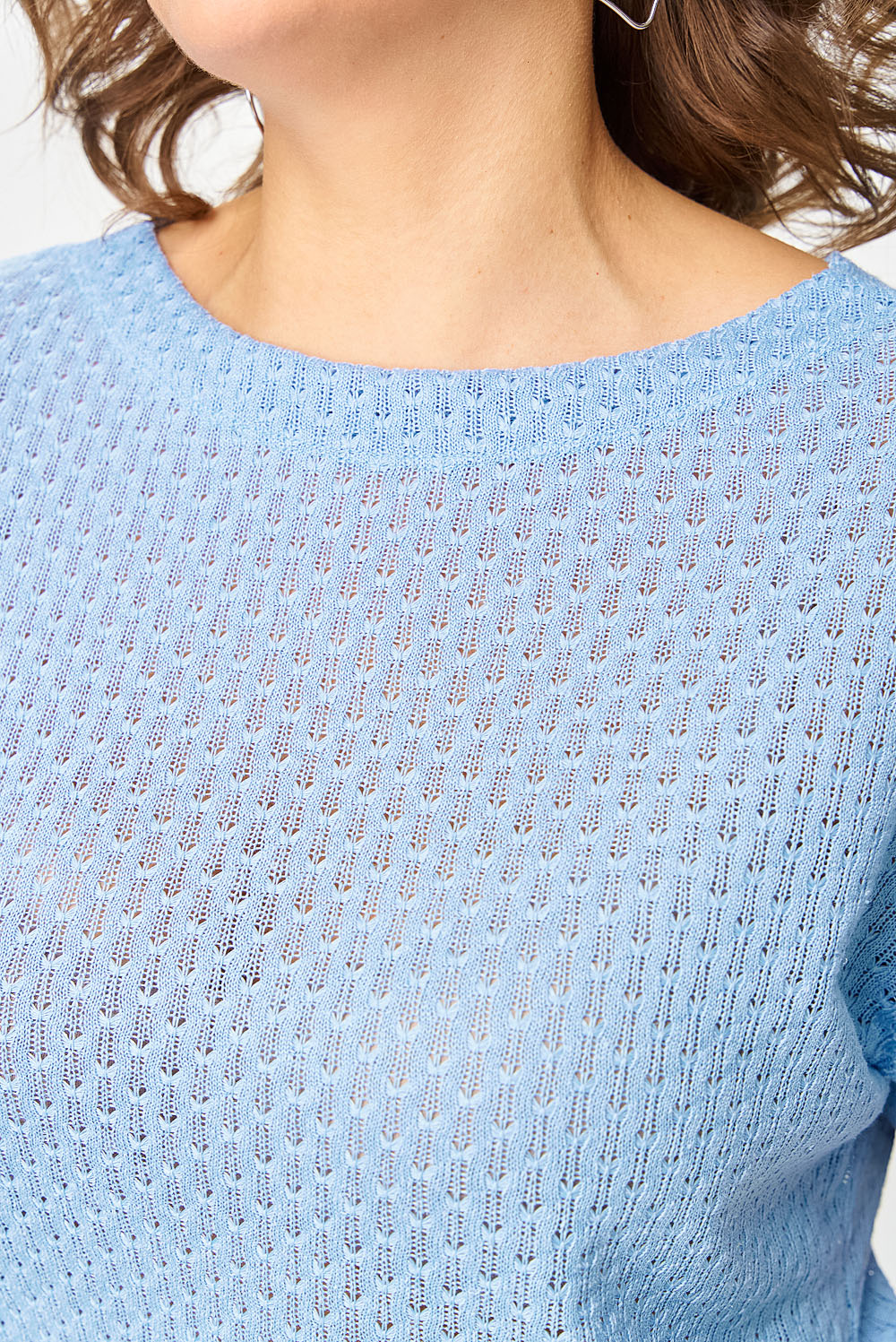 Джемпер женский из трикотажной ткани. Свободного силуэта. Спущенное плечо, оформлено притачной манжетой. Низ джемпера оформлен притачным поясом. Вырез горловины по спинке треугольный.