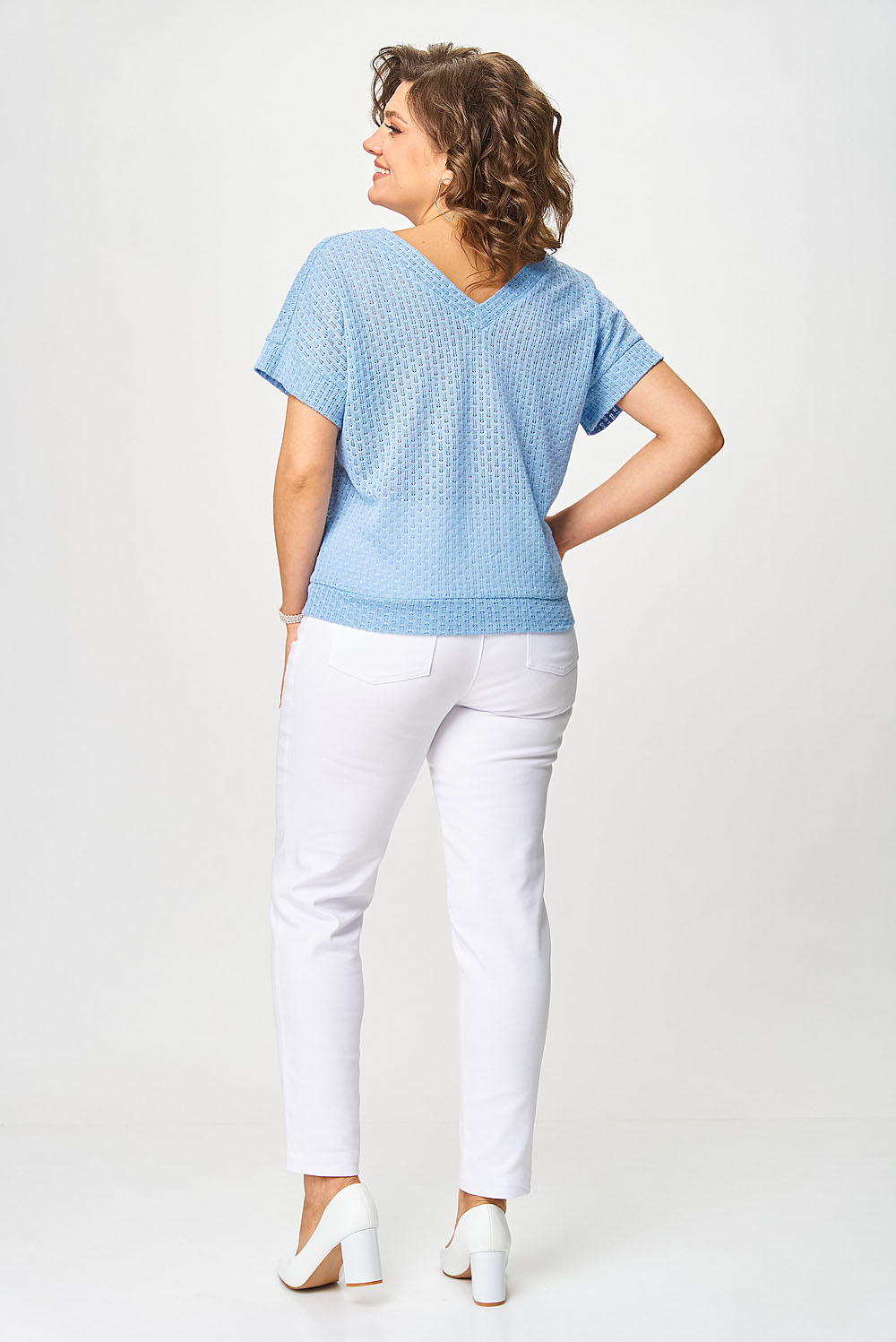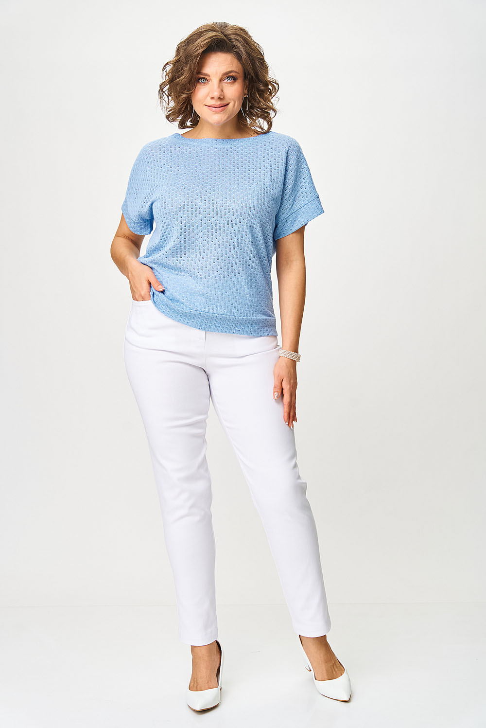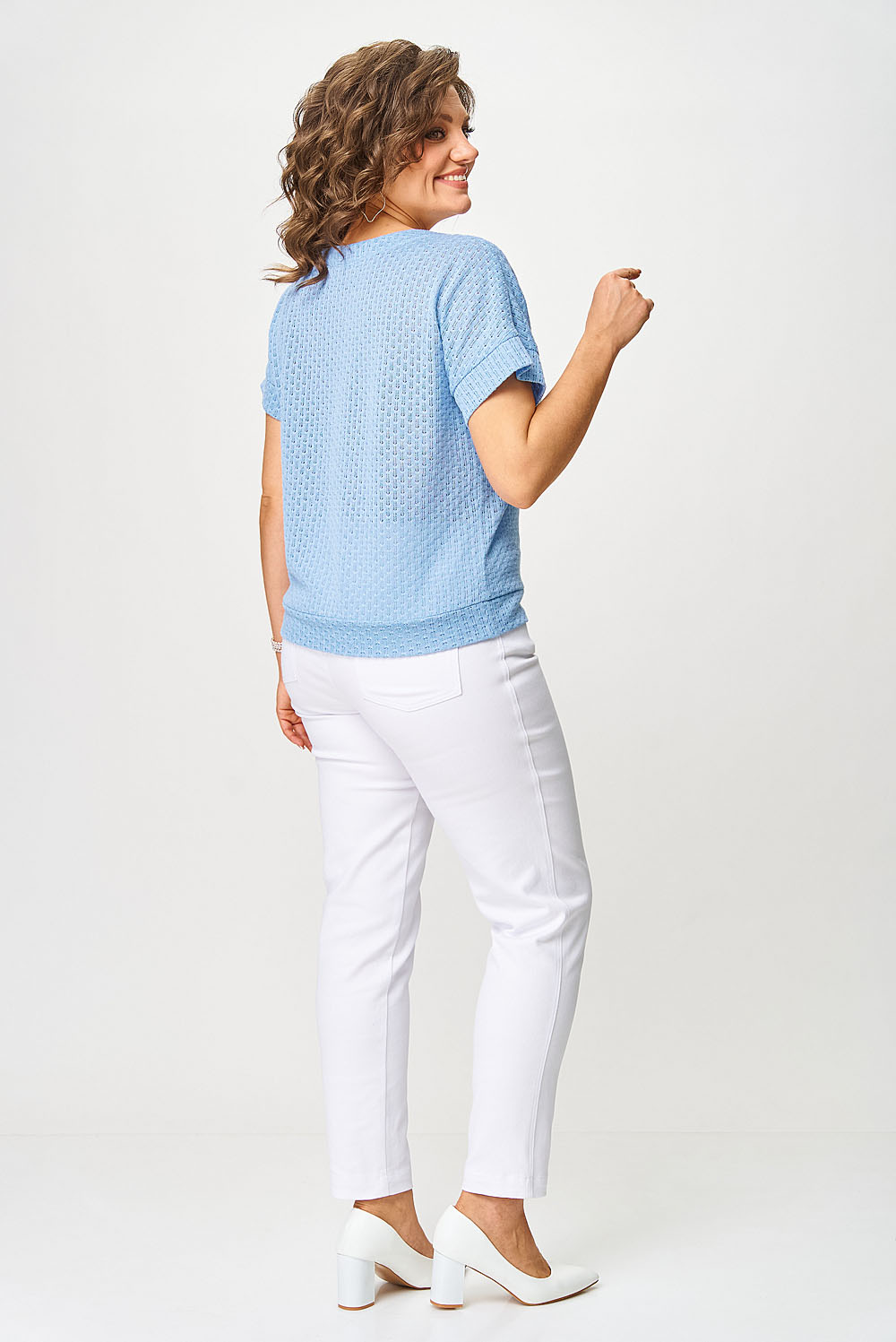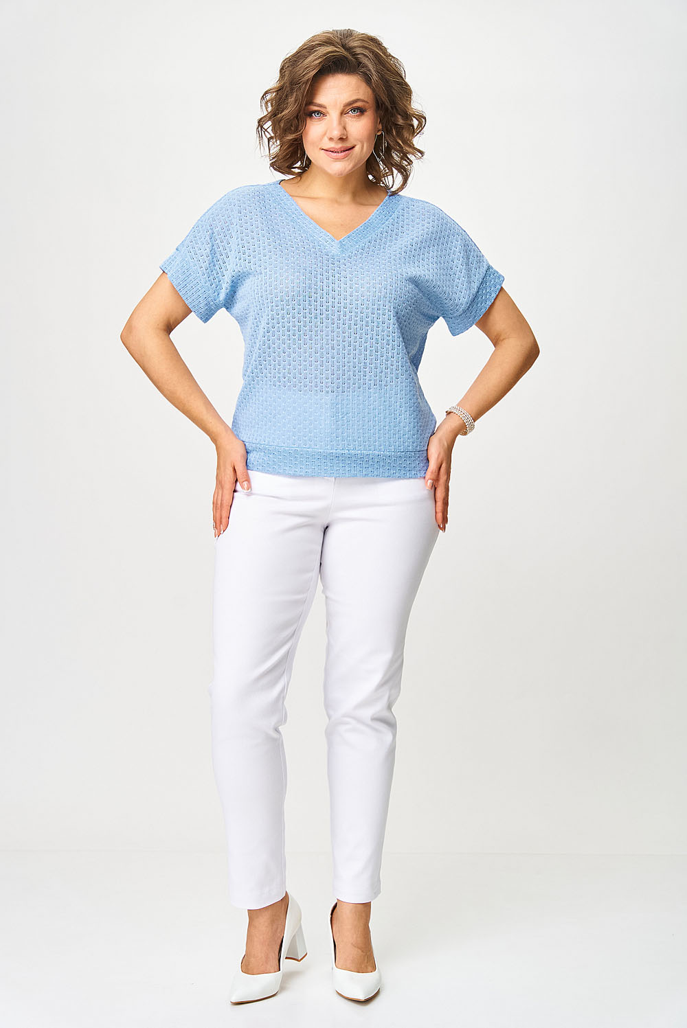 Джемпер женский из трикотажной ткани. Свободного силуэта. Спущенное плечо, оформлено притачной манжетой. Низ джемпера оформлен притачным поясом. Вырез горловины по спинке треугольный.