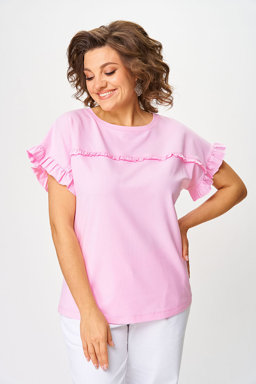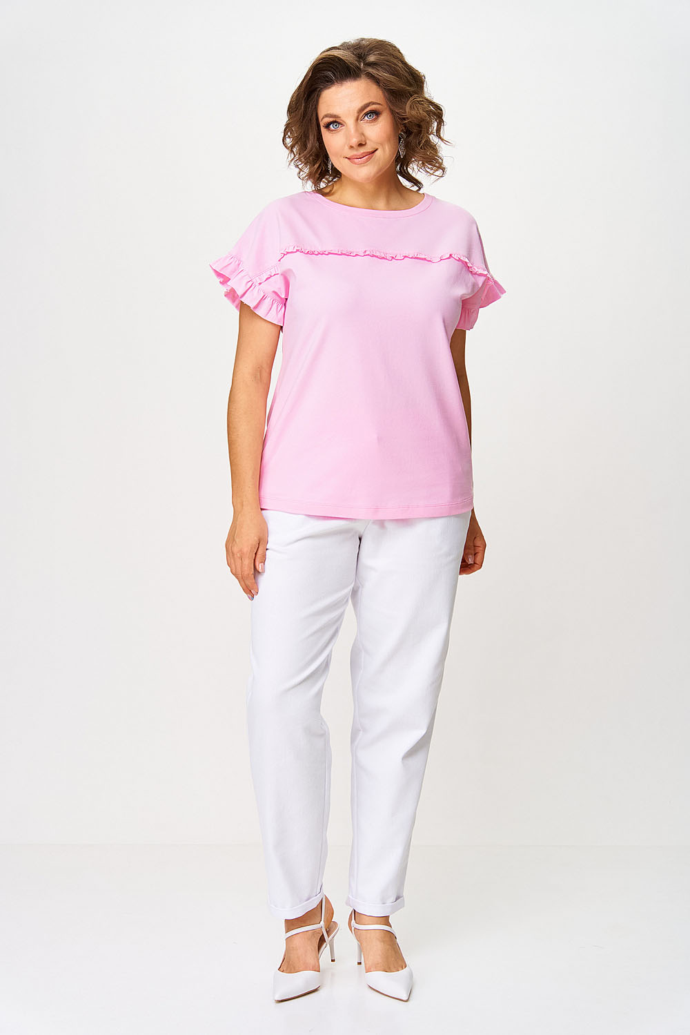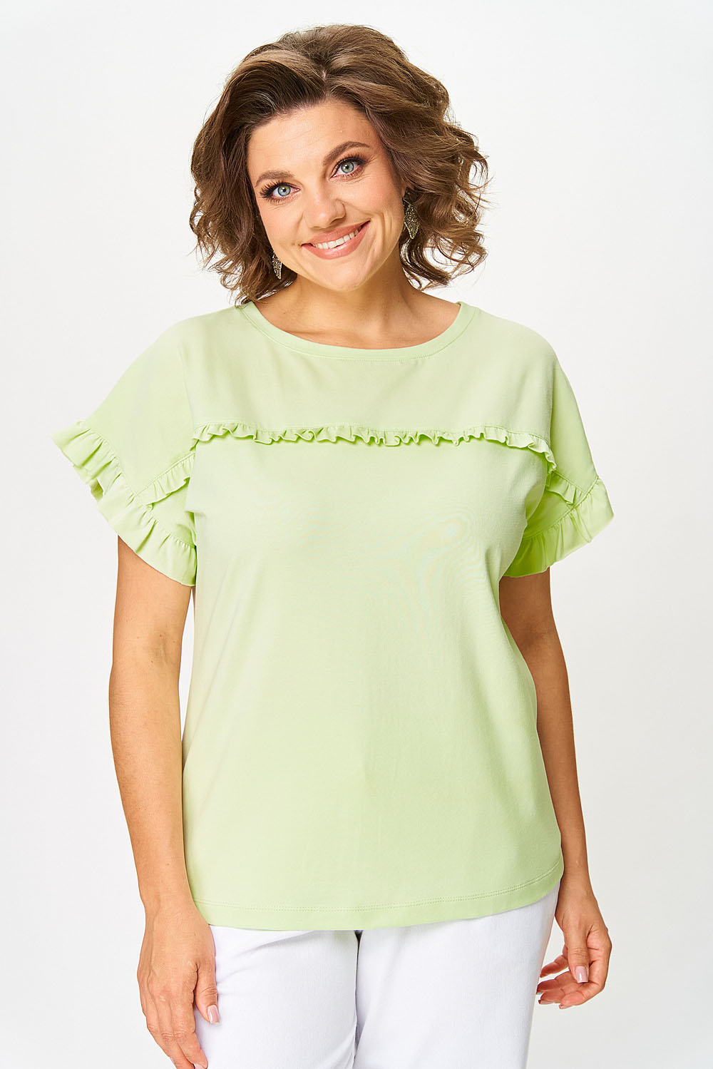 Джемпер женский прямого силуэта. Перед джемпера оформлен притачной кокеткой по полочке и спинке. В шов притачивания вставлена рюша. Спущенное плечо. Вырез горловины “круглый”, оформлен бейкой.
