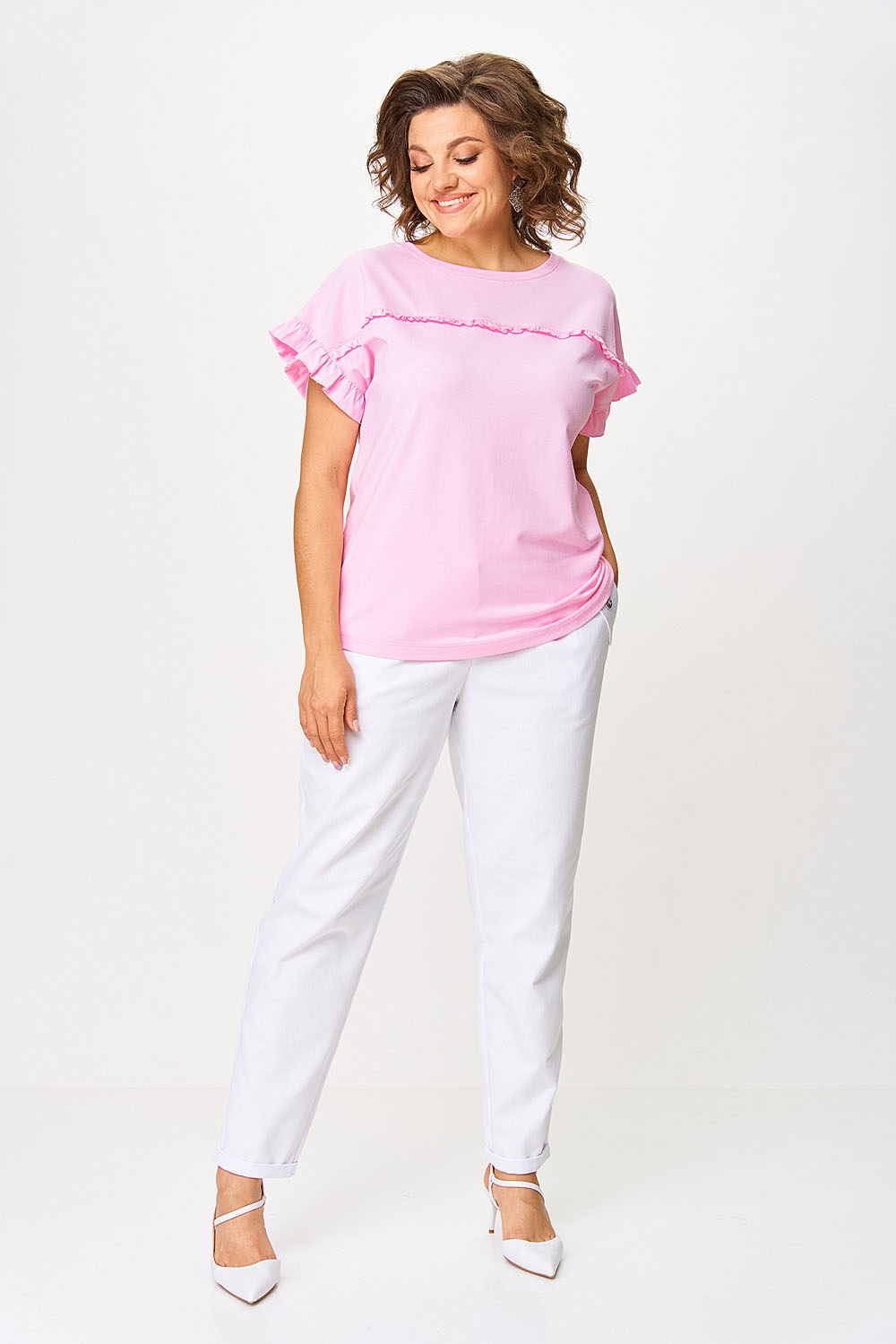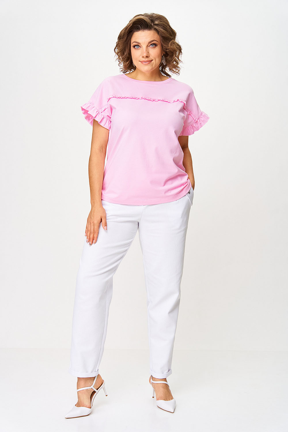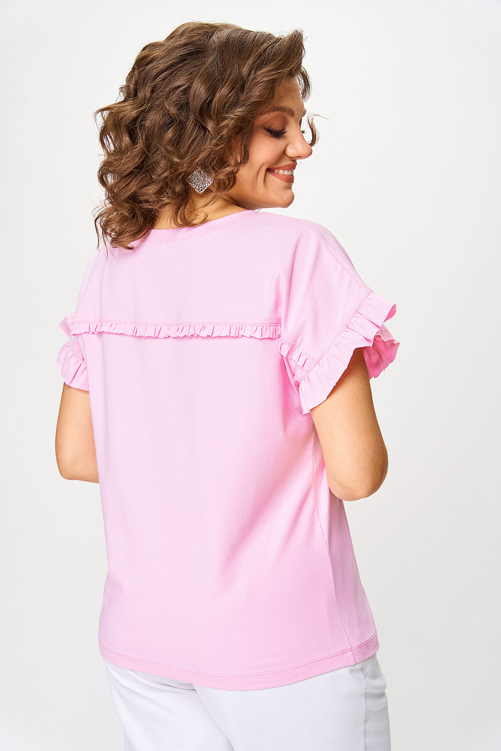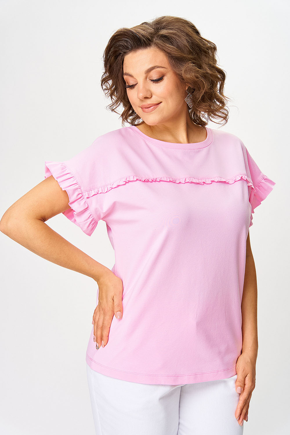 Джемпер женский прямого силуэта. Перед джемпера оформлен притачной кокеткой по полочке и спинке. В шов притачивания вставлена рюша. Спущенное плечо. Вырез горловины “круглый”, оформлен бейкой.