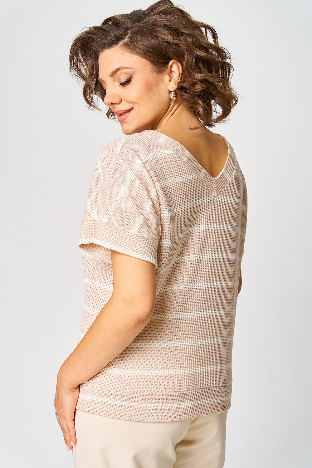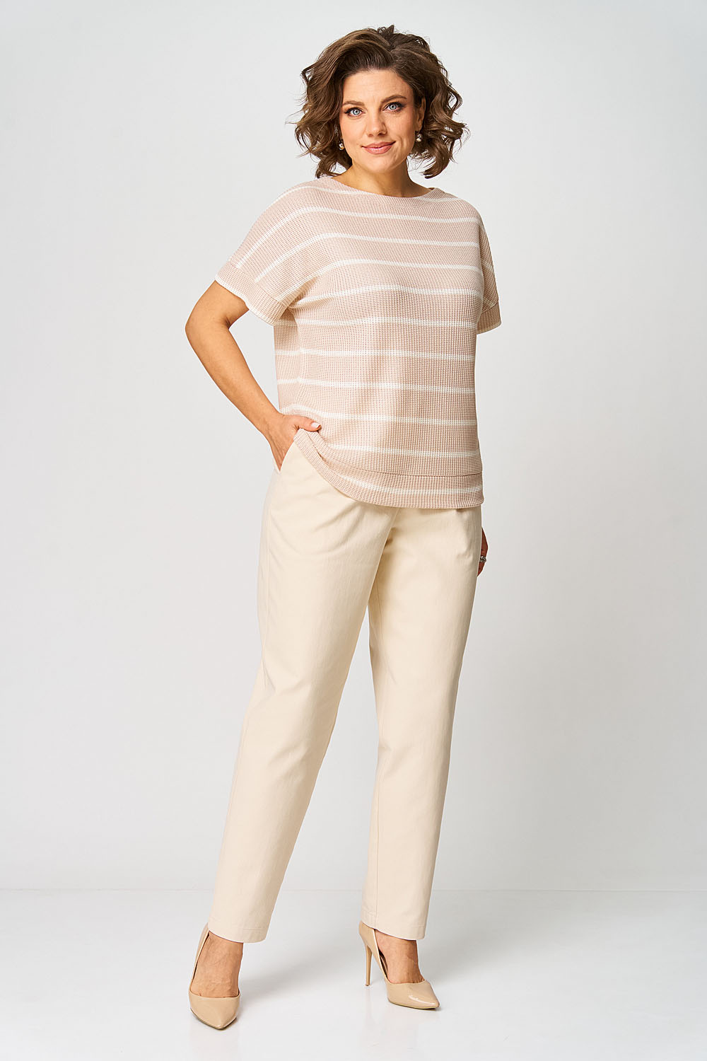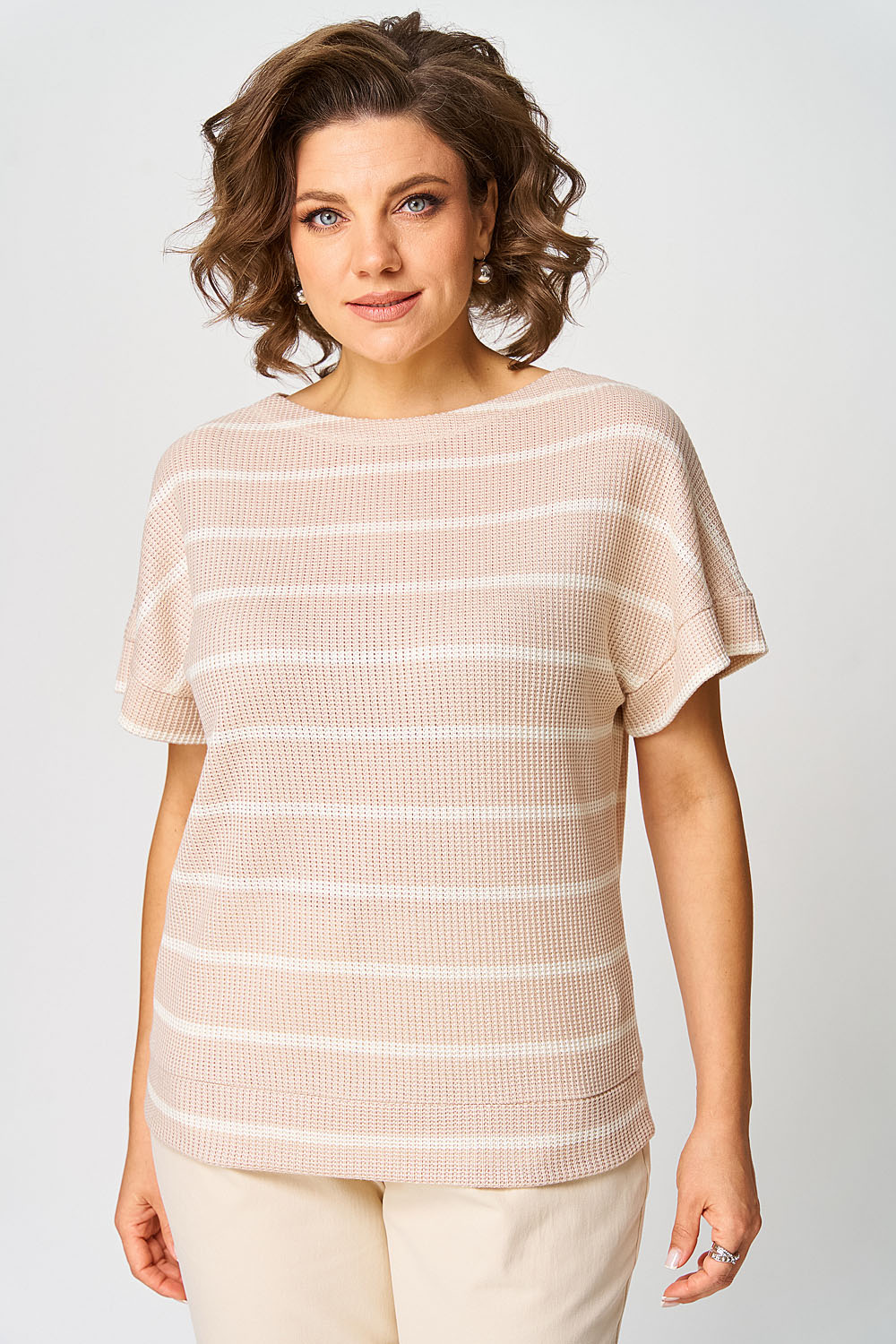 Джемпер женский из трикотажной ткани. Свободного силуэта. Спущенное плечо, оформлено притачной манжетой. Низ джемпера оформлен притачным поясом. Вырез горловины по спинке треугольный.
