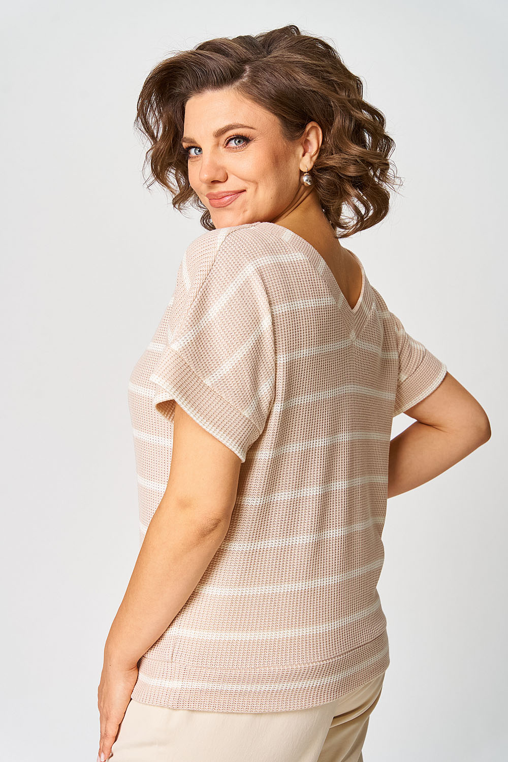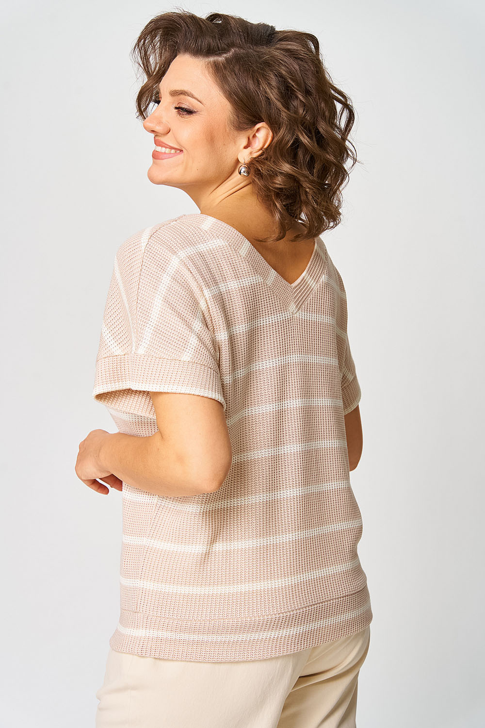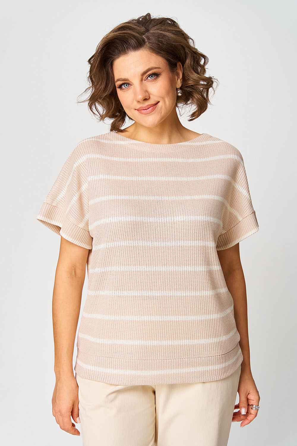 Джемпер женский из трикотажной ткани. Свободного силуэта. Спущенное плечо, оформлено притачной манжетой. Низ джемпера оформлен притачным поясом. Вырез горловины по спинке треугольный.