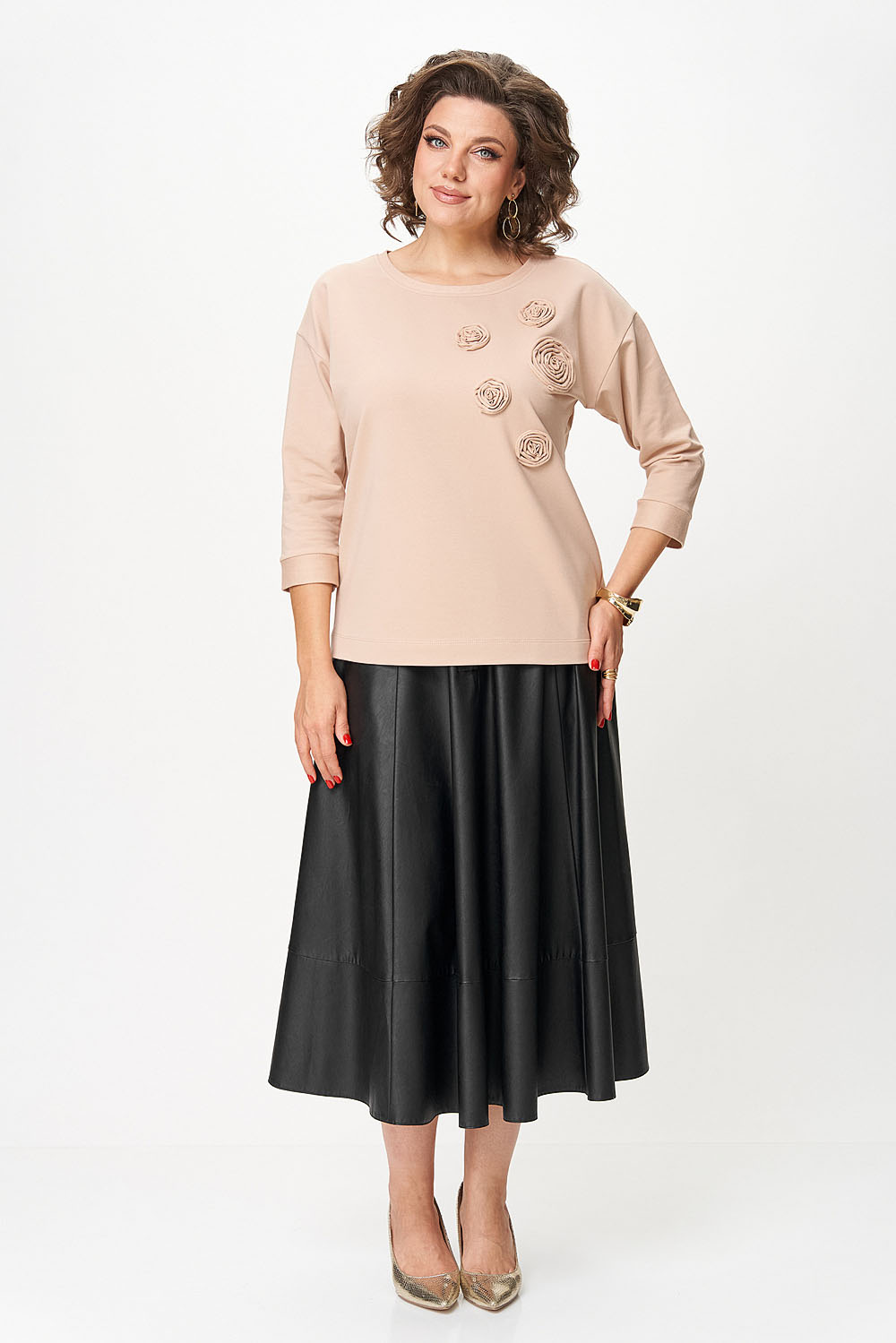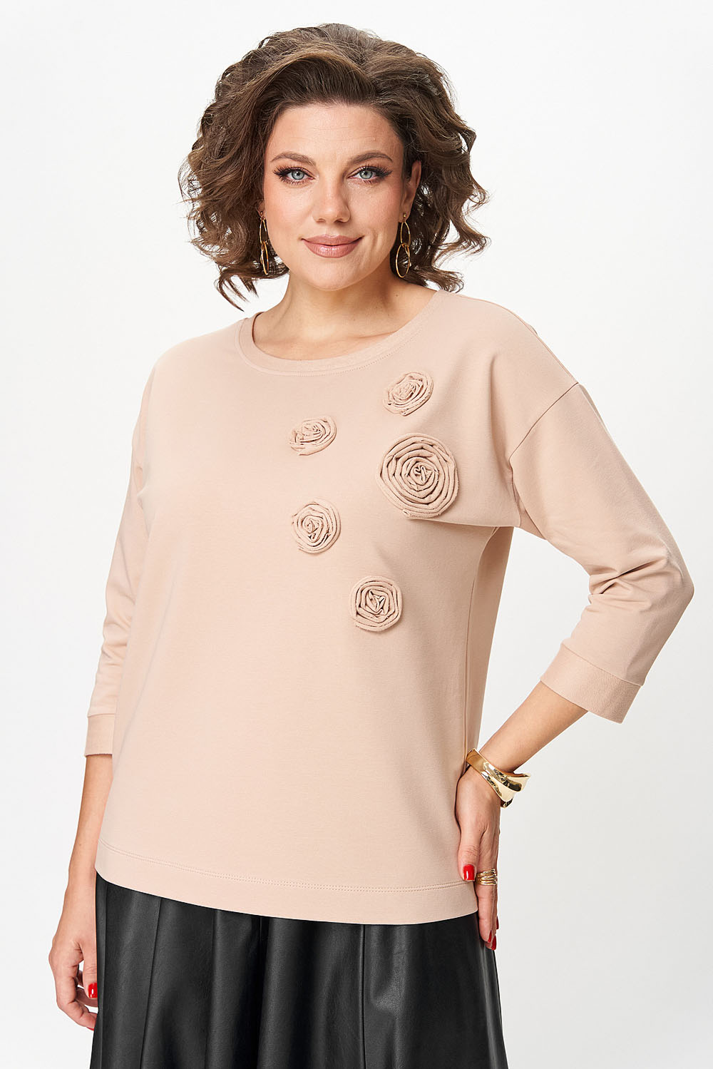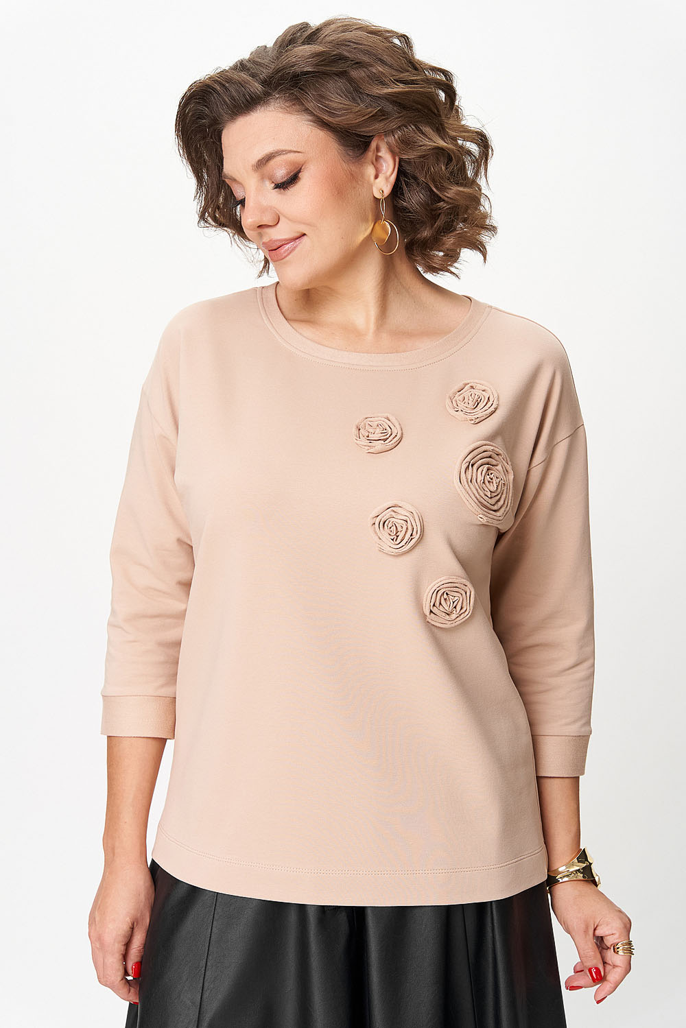 Джемпер женский из трикотажной хлопковой ткани (двунитка). По переду джемпера расположены декоративные элементы. Спущенное плечо, рукав 3/4. Низ рукава обработан манжетой. Вырез горловины круглый, оформлен бейкой.