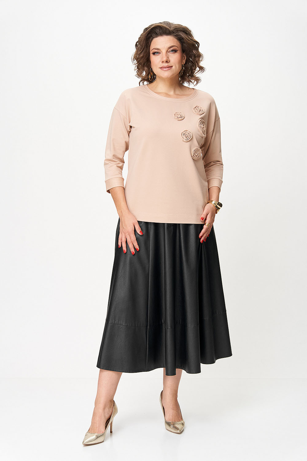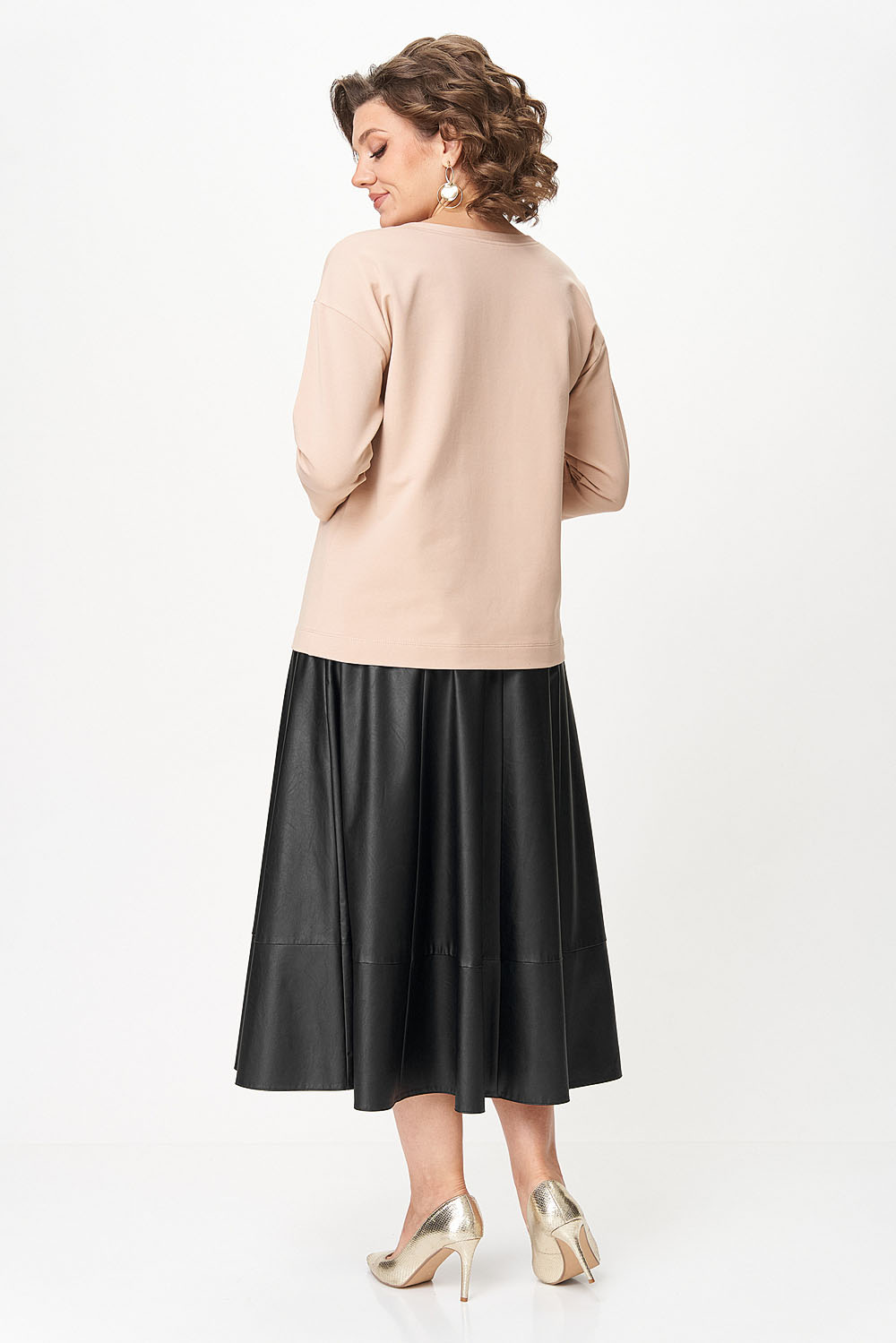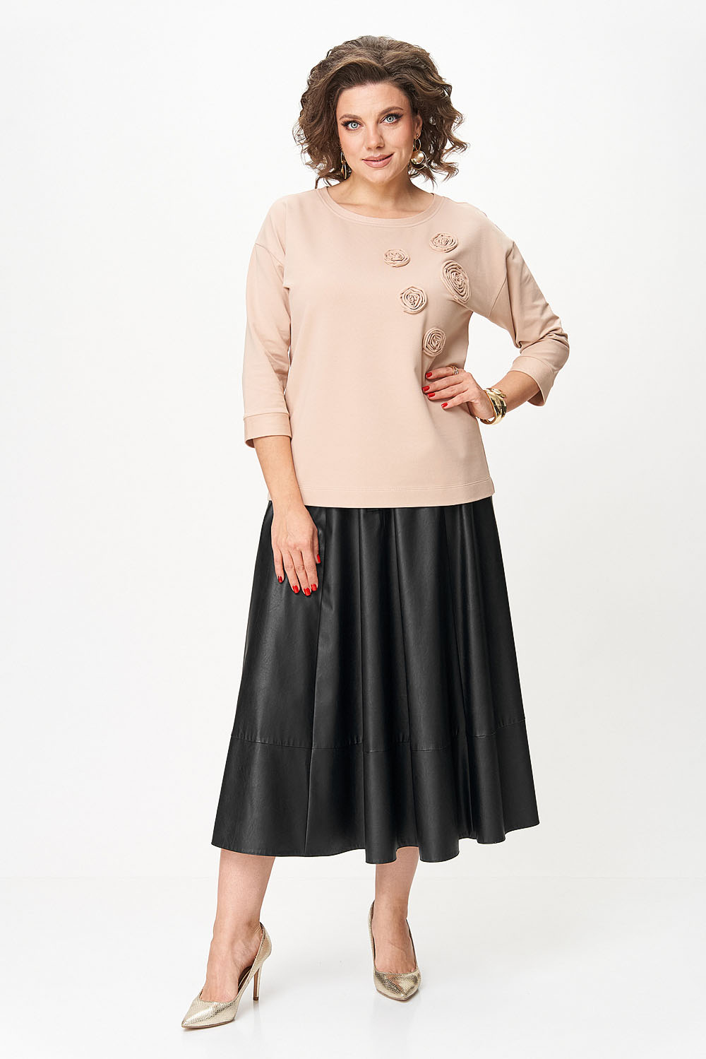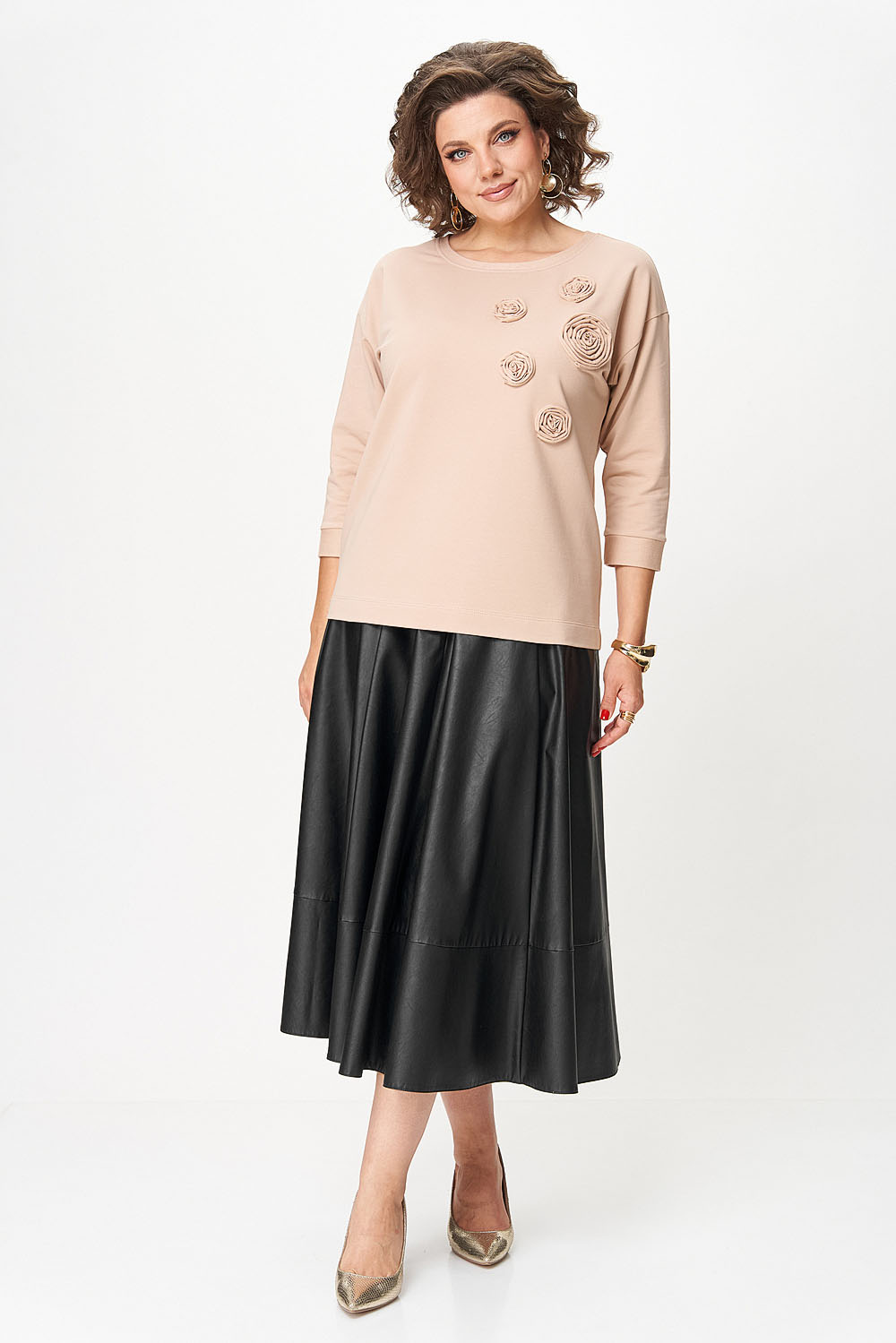 Джемпер женский из трикотажной хлопковой ткани (двунитка). По переду джемпера расположены декоративные элементы. Спущенное плечо, рукав 3/4. Низ рукава обработан манжетой. Вырез горловины круглый, оформлен бейкой.