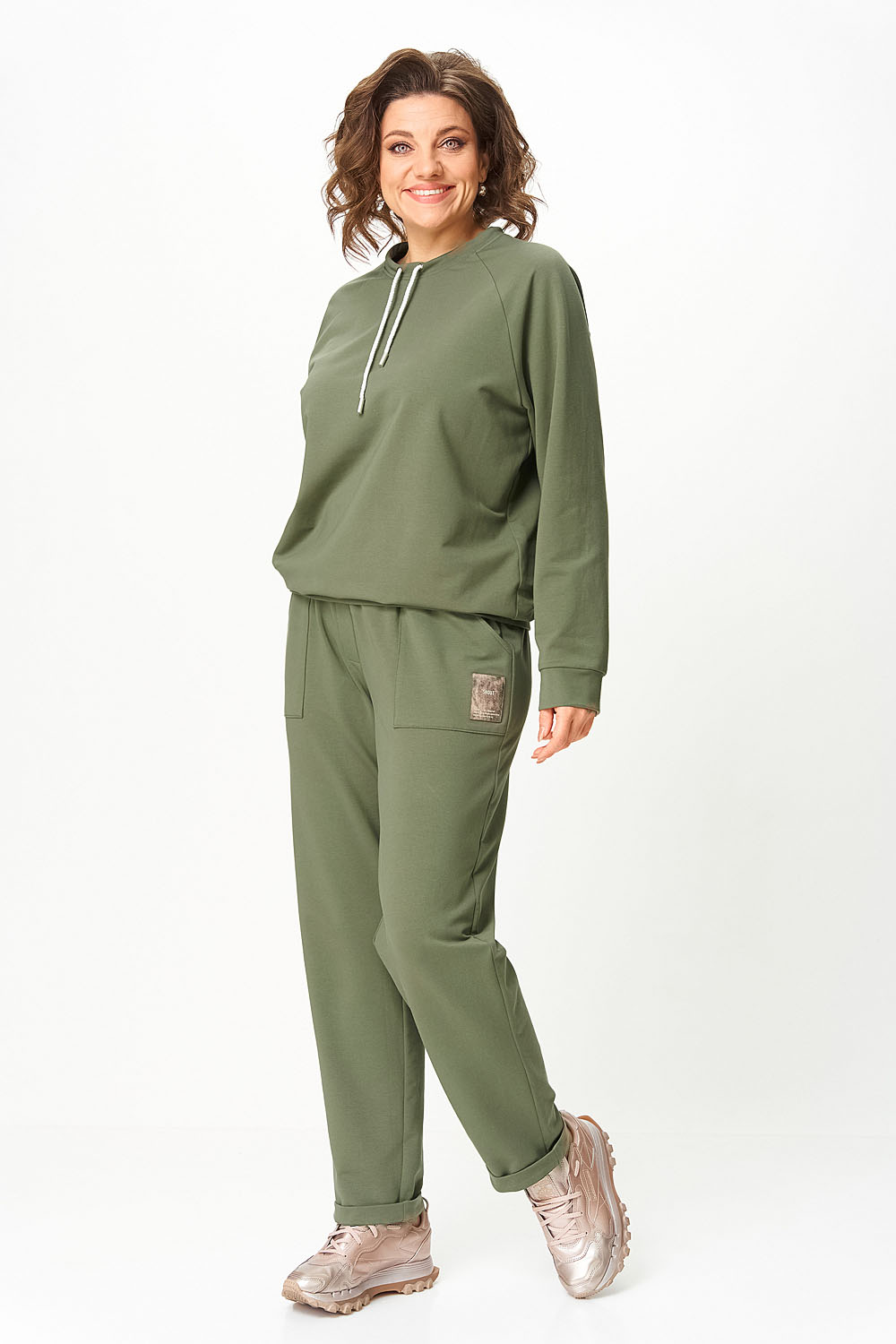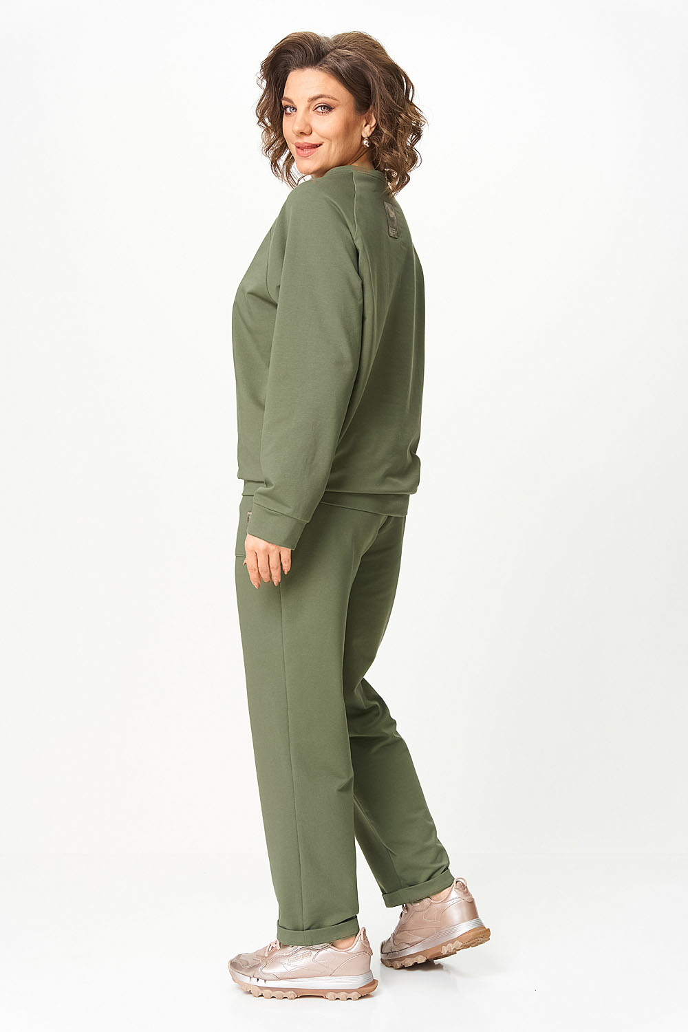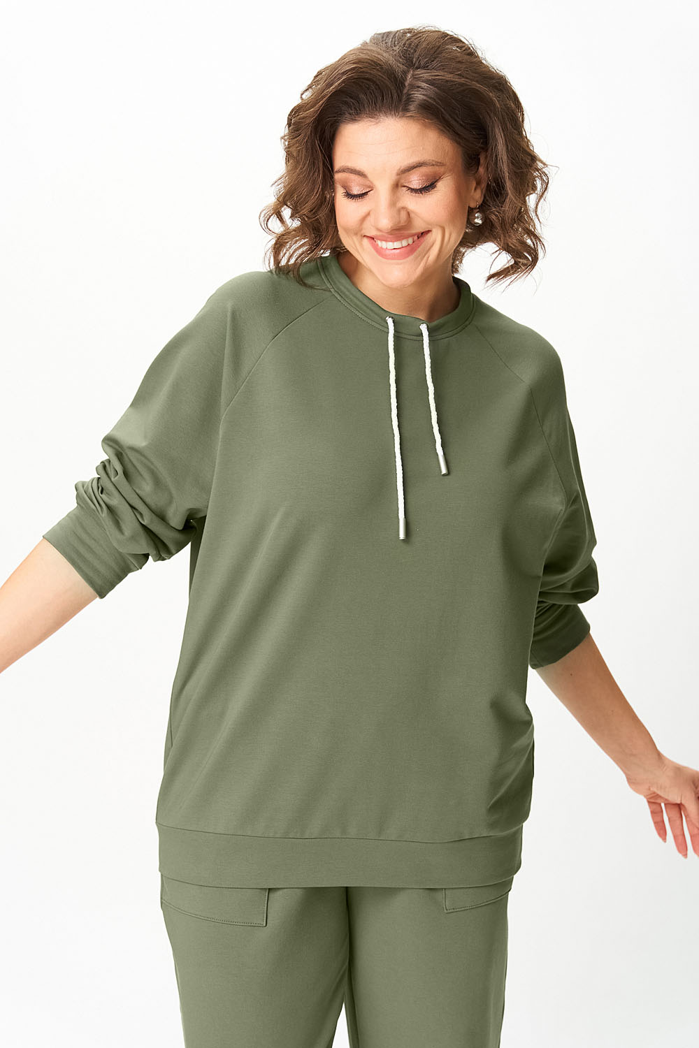 Джемпер женский из трикотажной хлопковой ткани (двунитка). Рукав реглан. Низ рукава обработан притачной манжетой. Низ изделия оформлен притачным поясом. На спинке настрочен декоративный элемент. Вырез горловины круглый, обработан бейкой со шнуром.