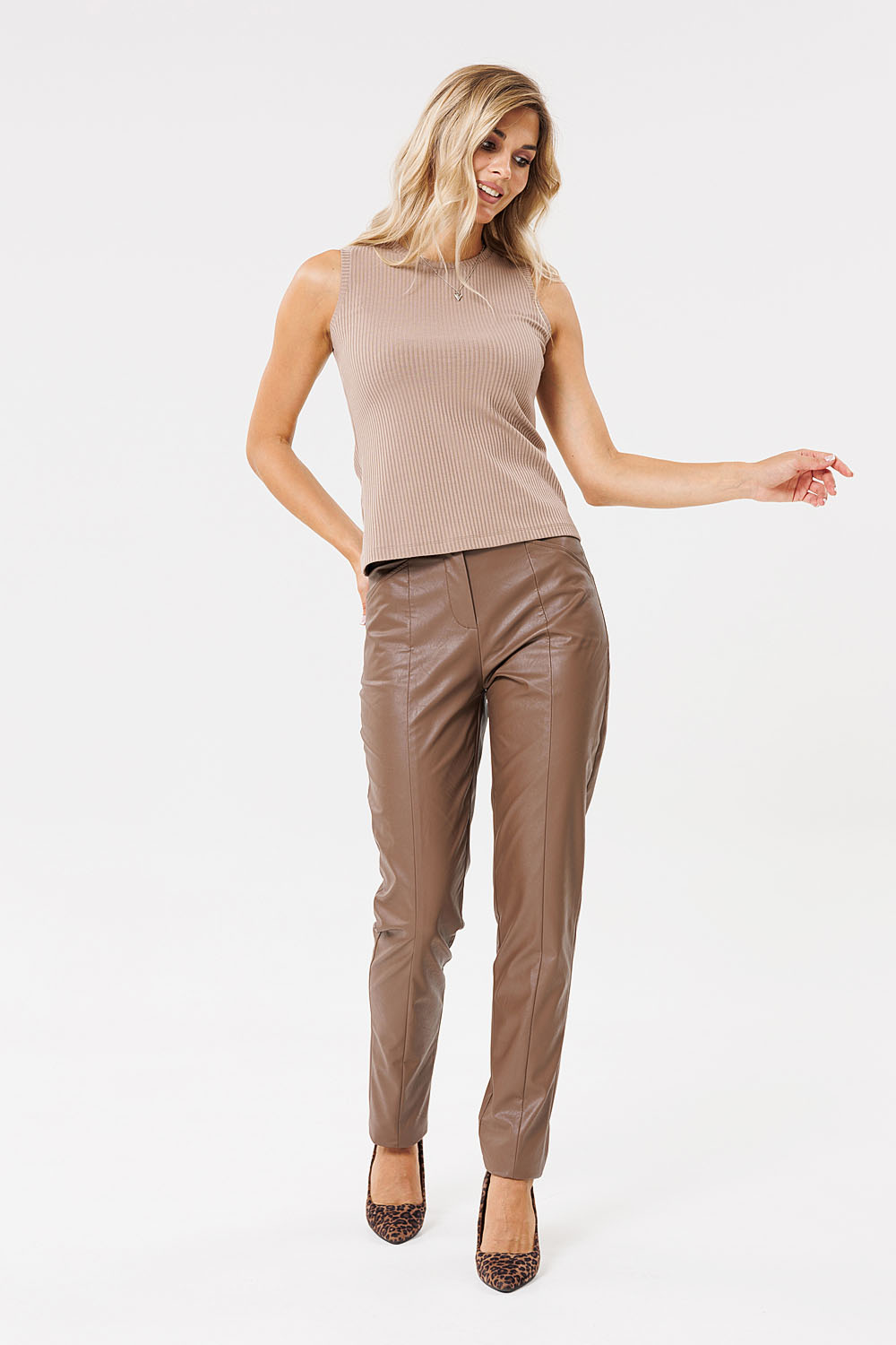 Топ женский полуприлегающего силуэта из трикотажной ткани. Горловина и проймы обработаны бейкой.