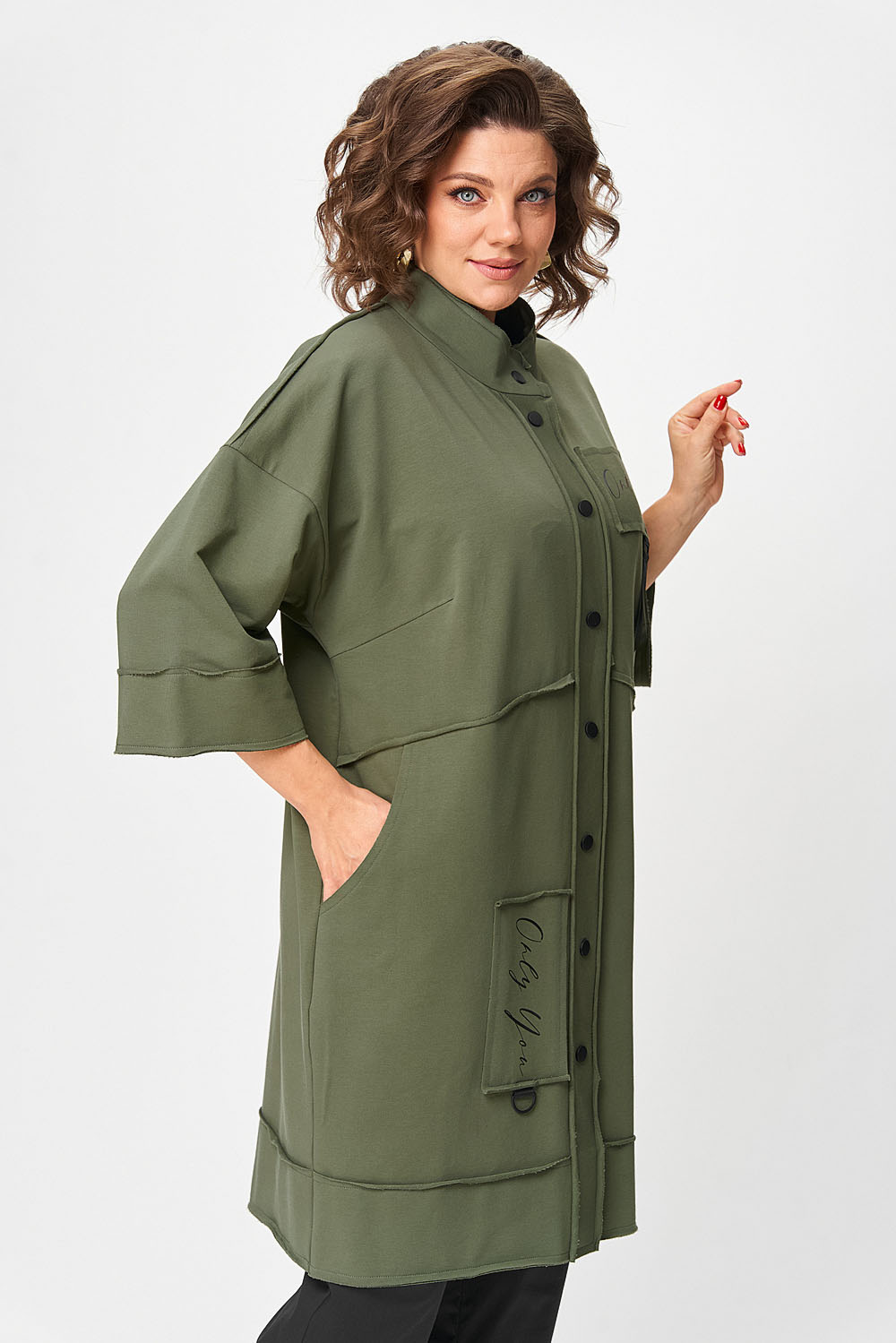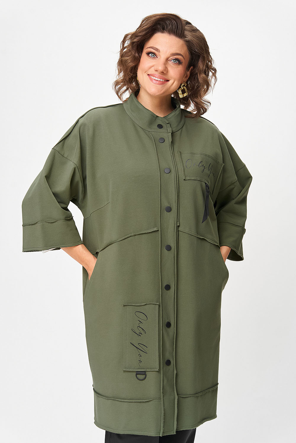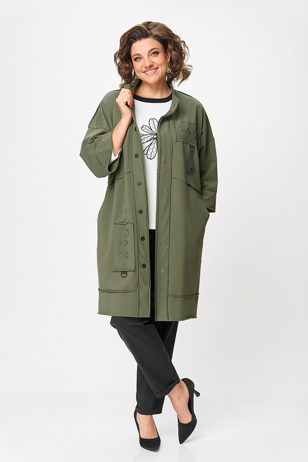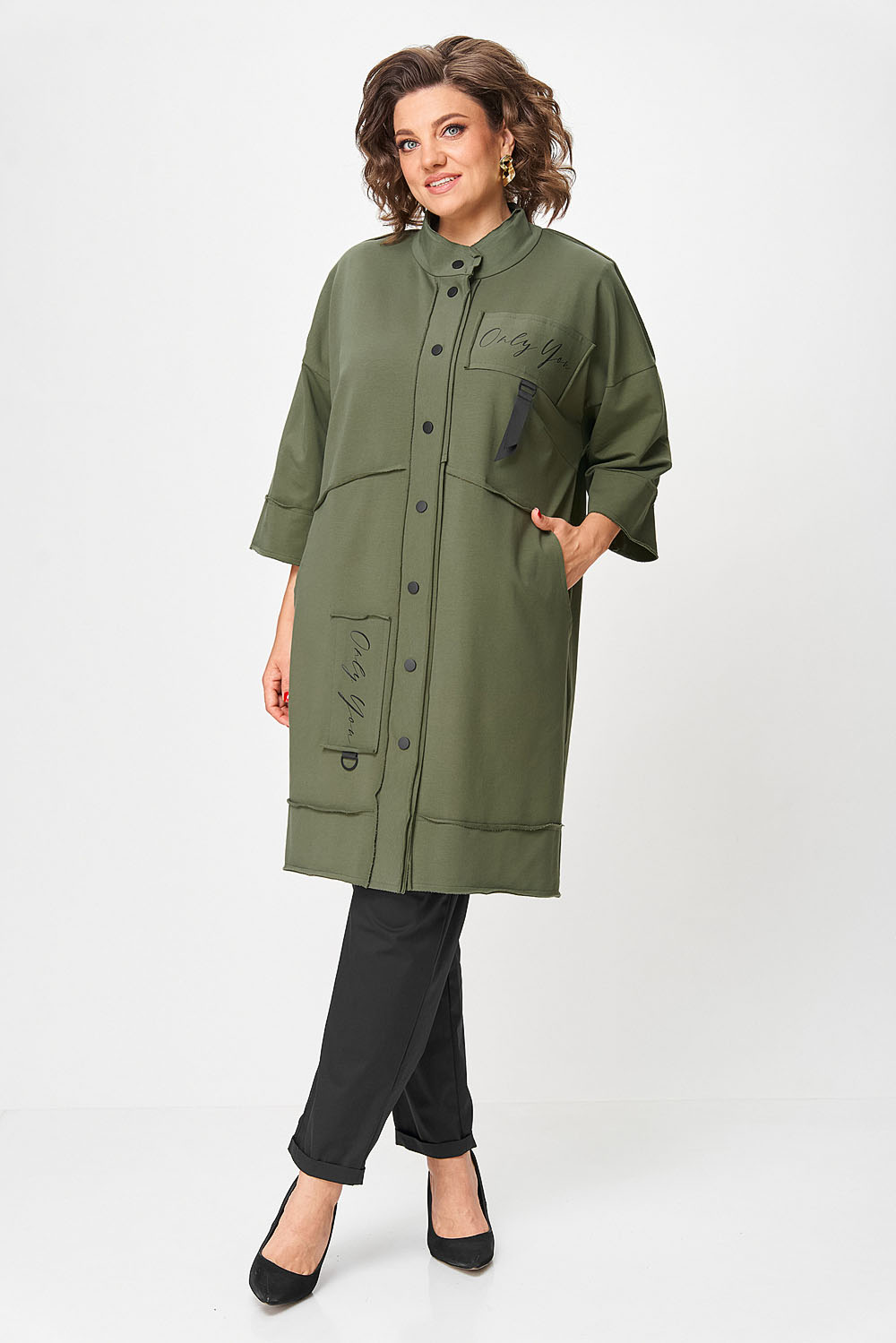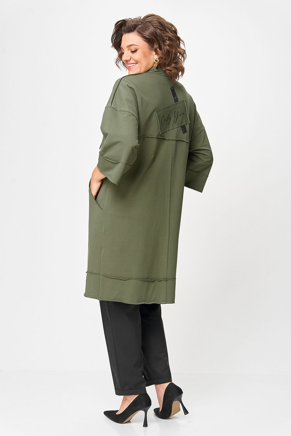 Кардиган женский прямого силуэта из трикотажной ткани (двунитка-футер). На полочке и спинке расположены декоративные, необработанные швы. В верхней и нижней части переда есть настрочные элементы с печатью и тесьмой. По переду изделия карманы. Спинка со средним швом и кокеткой. На кокетке расположен элемент с печатью и тесьмой. Рукав спущенный с манжетой. Вырез горловины оформлен стойкой. По переду изделия планка с кнопками.