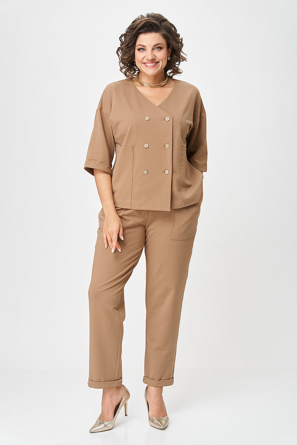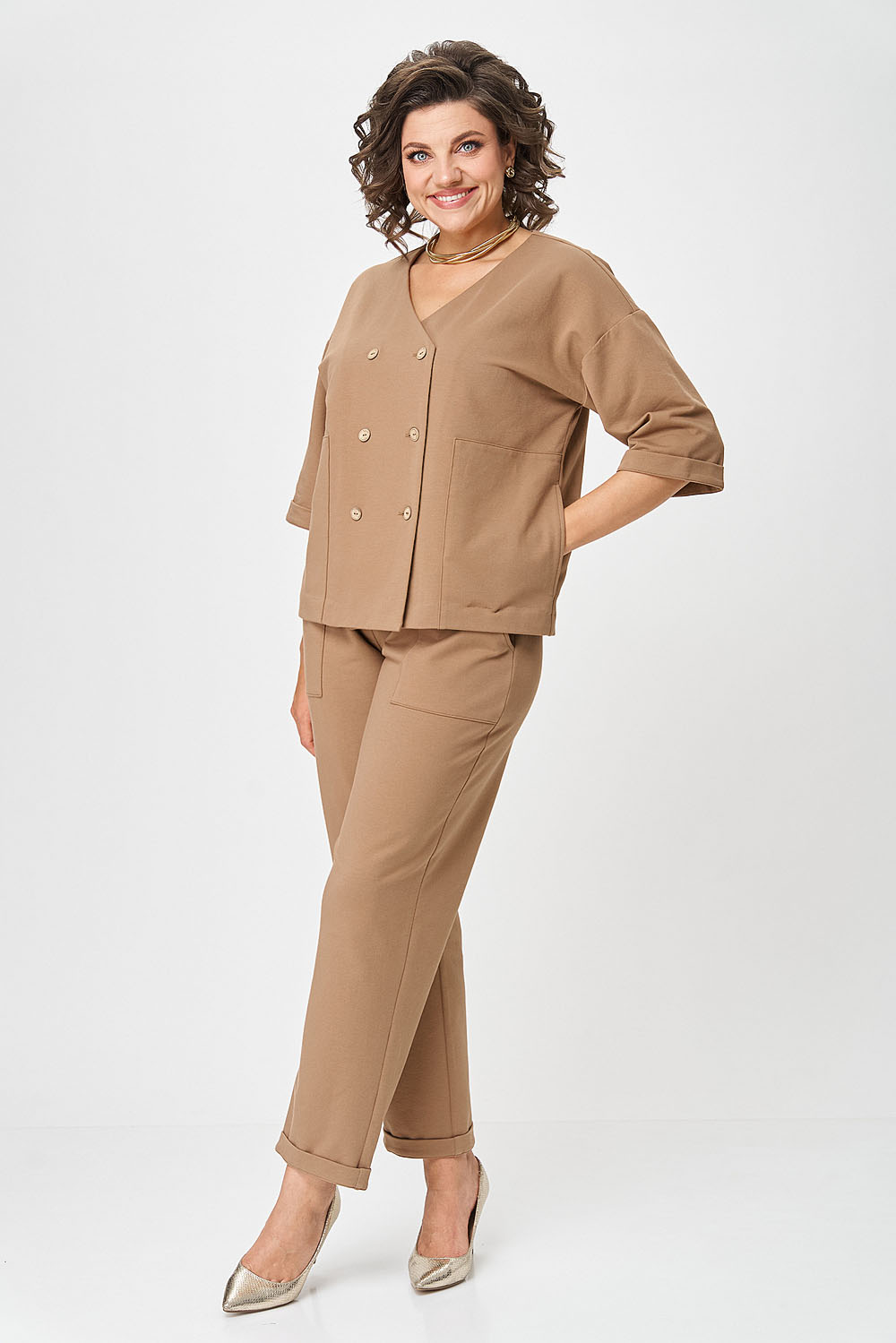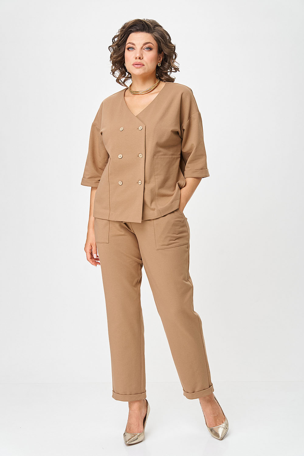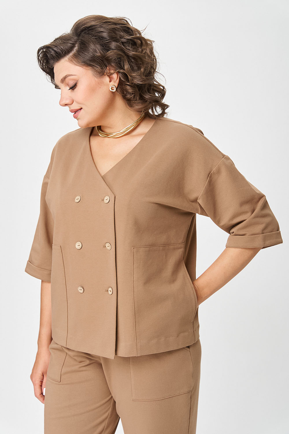 Костюм женский из трикотажной ткани. Джемпер женский из трикотажной ткани, прямого силуэта. По переду джемпера расположены настрочные карманы. Спинка прямая. Спущенное плечо. Рукав 3/4. Вырез горловины треугольный. Застежка двубортная на петлях-пуговицах.