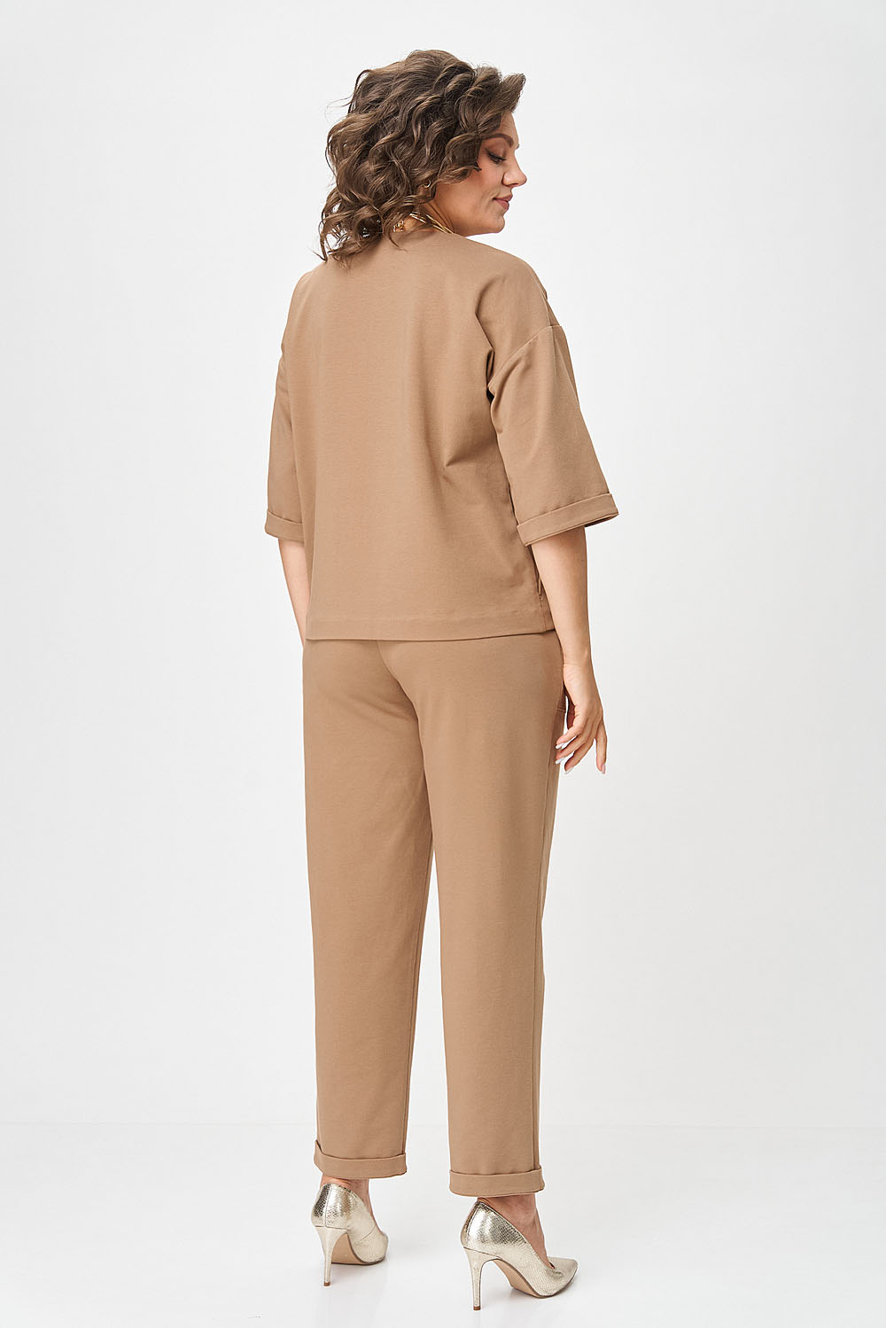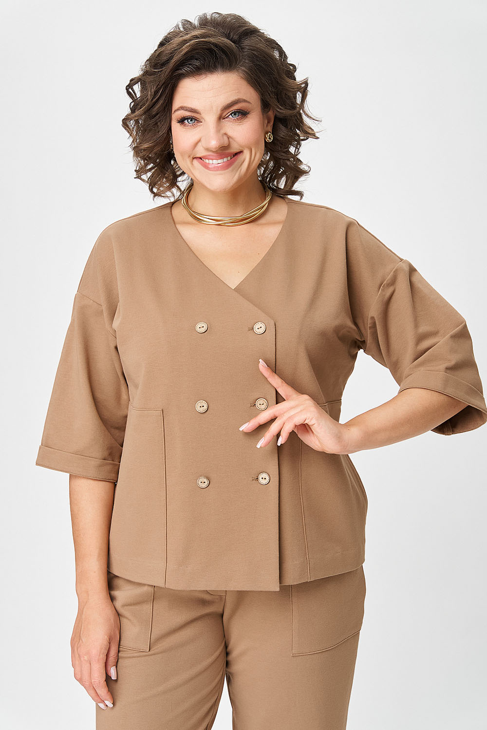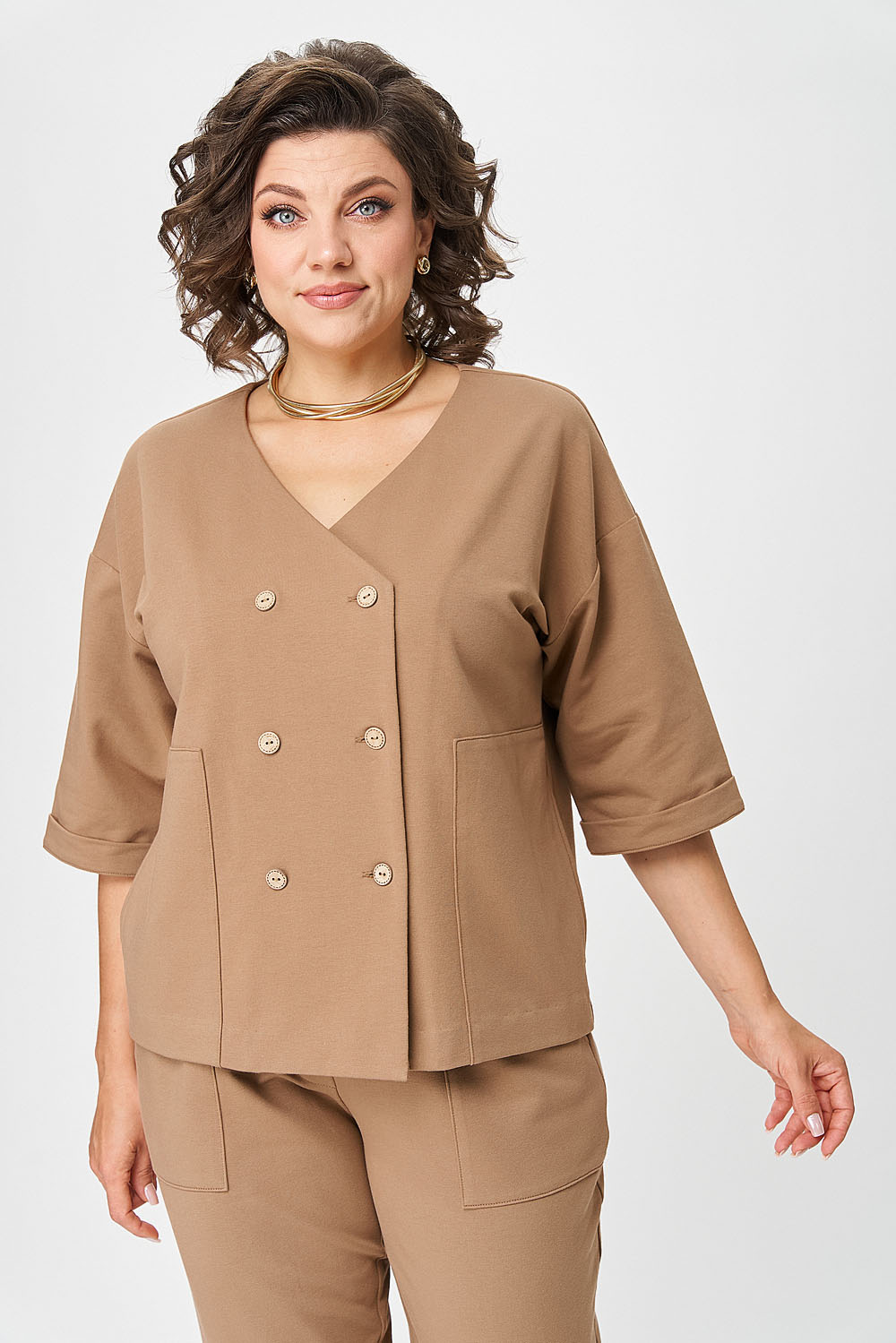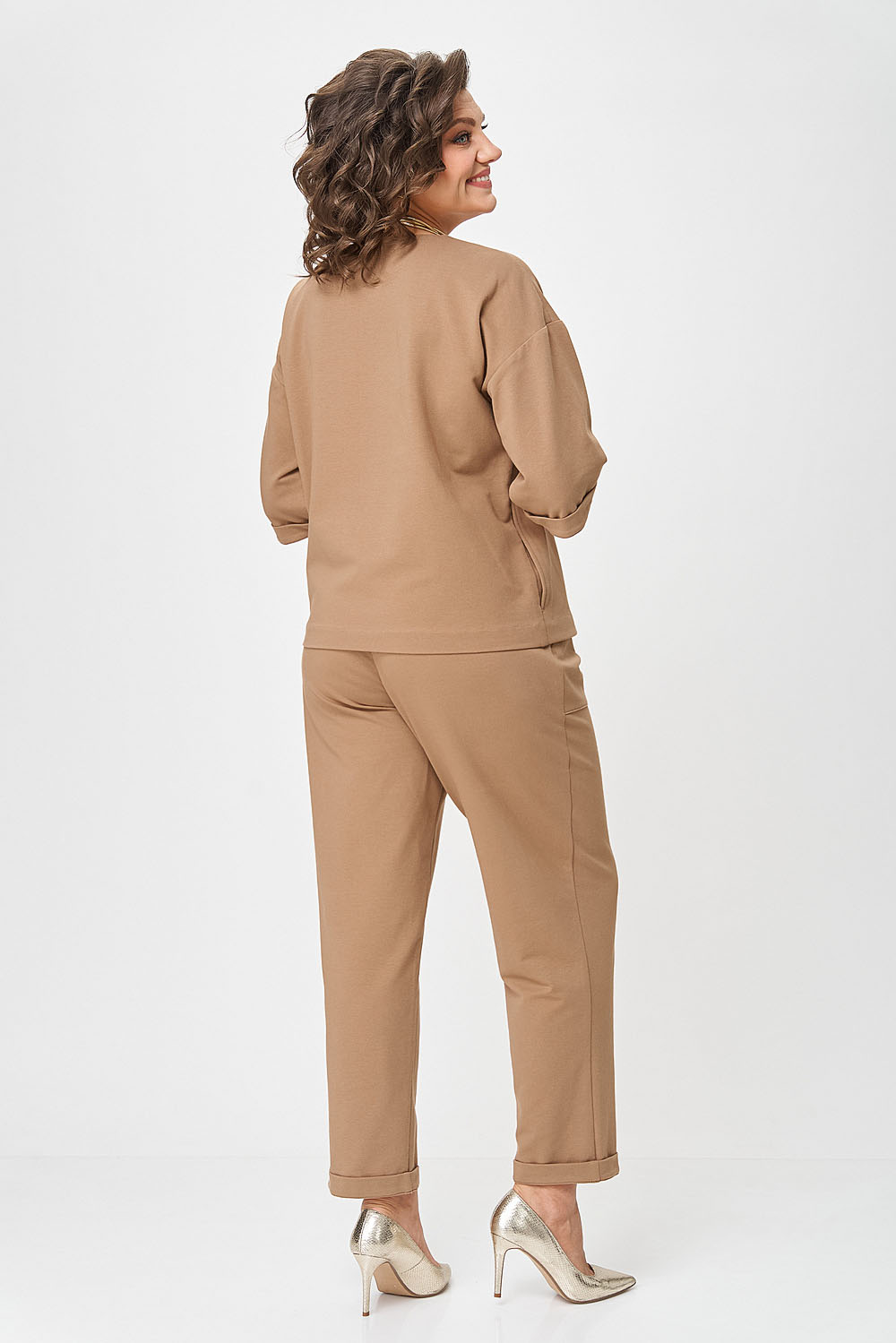 Костюм женский из трикотажной ткани. Джемпер женский из трикотажной ткани, прямого силуэта. По переду джемпера расположены настрочные карманы. Спинка прямая. Спущенное плечо. Рукав 3/4. Вырез горловины треугольный. Застежка двубортная на петлях-пуговицах.