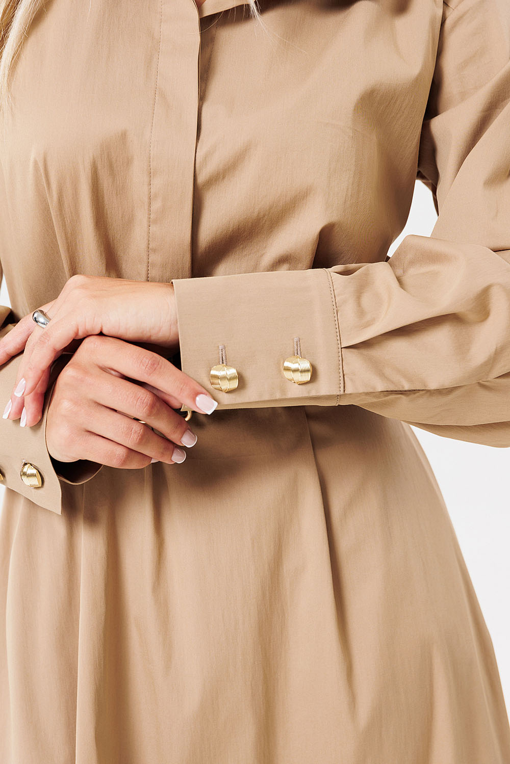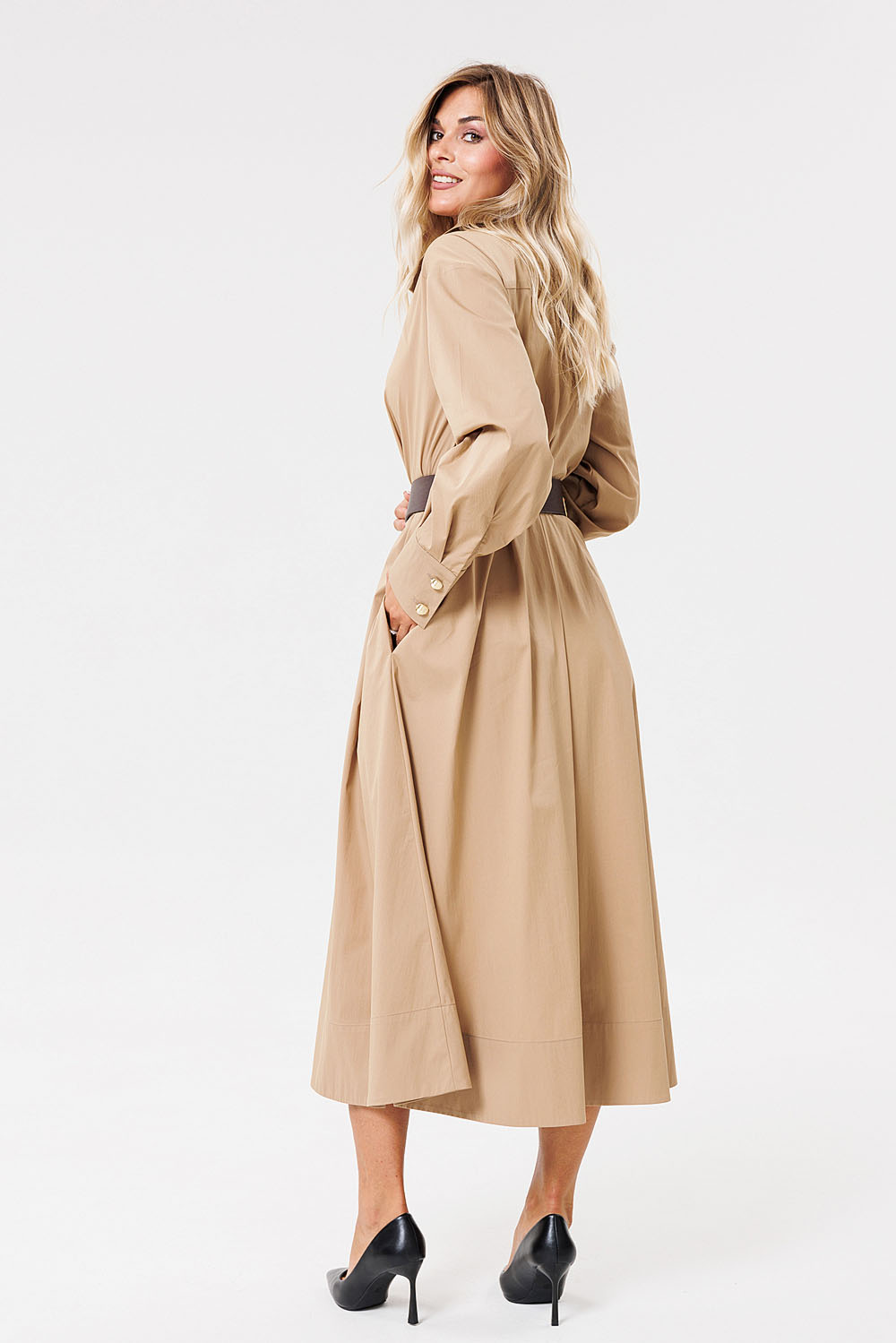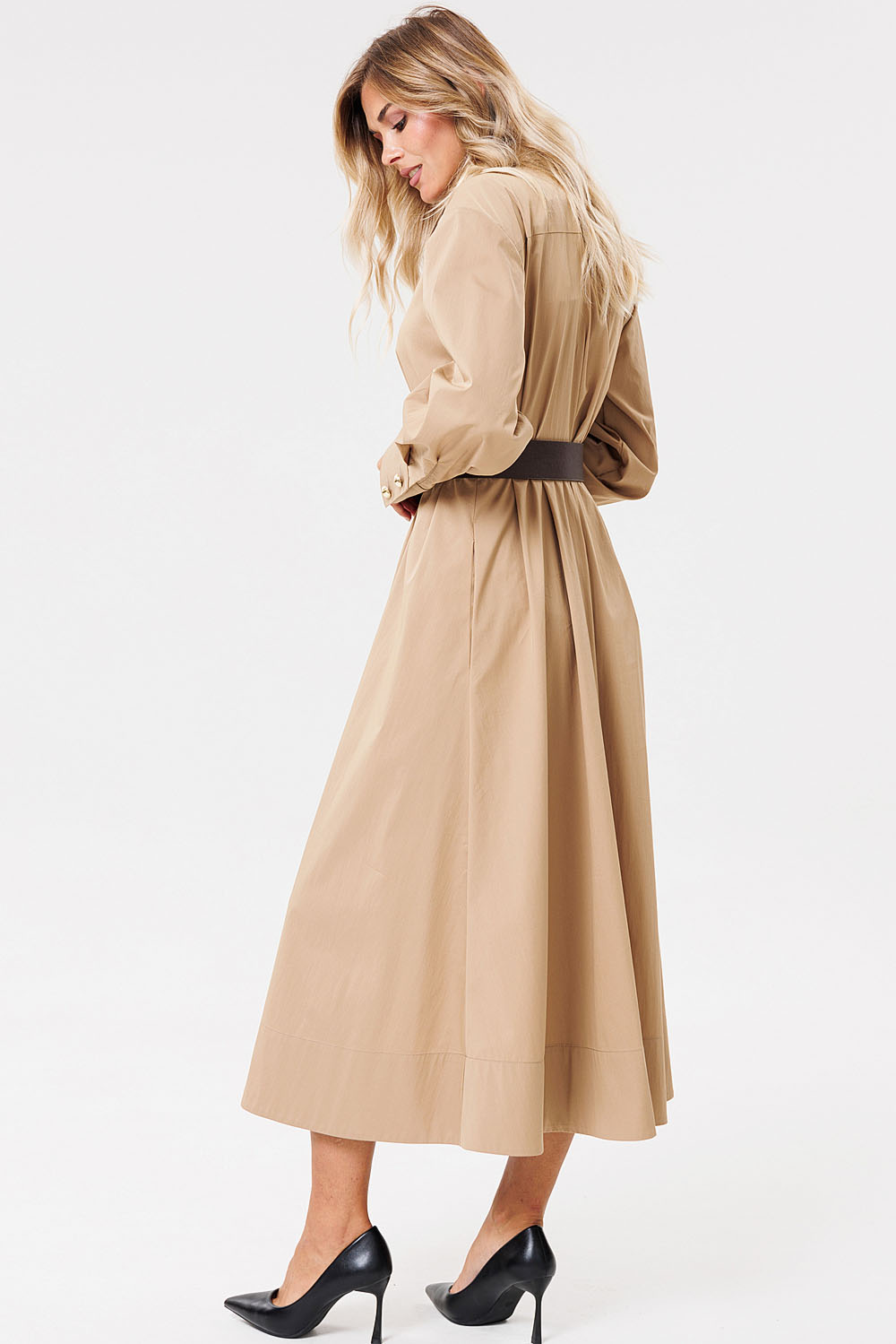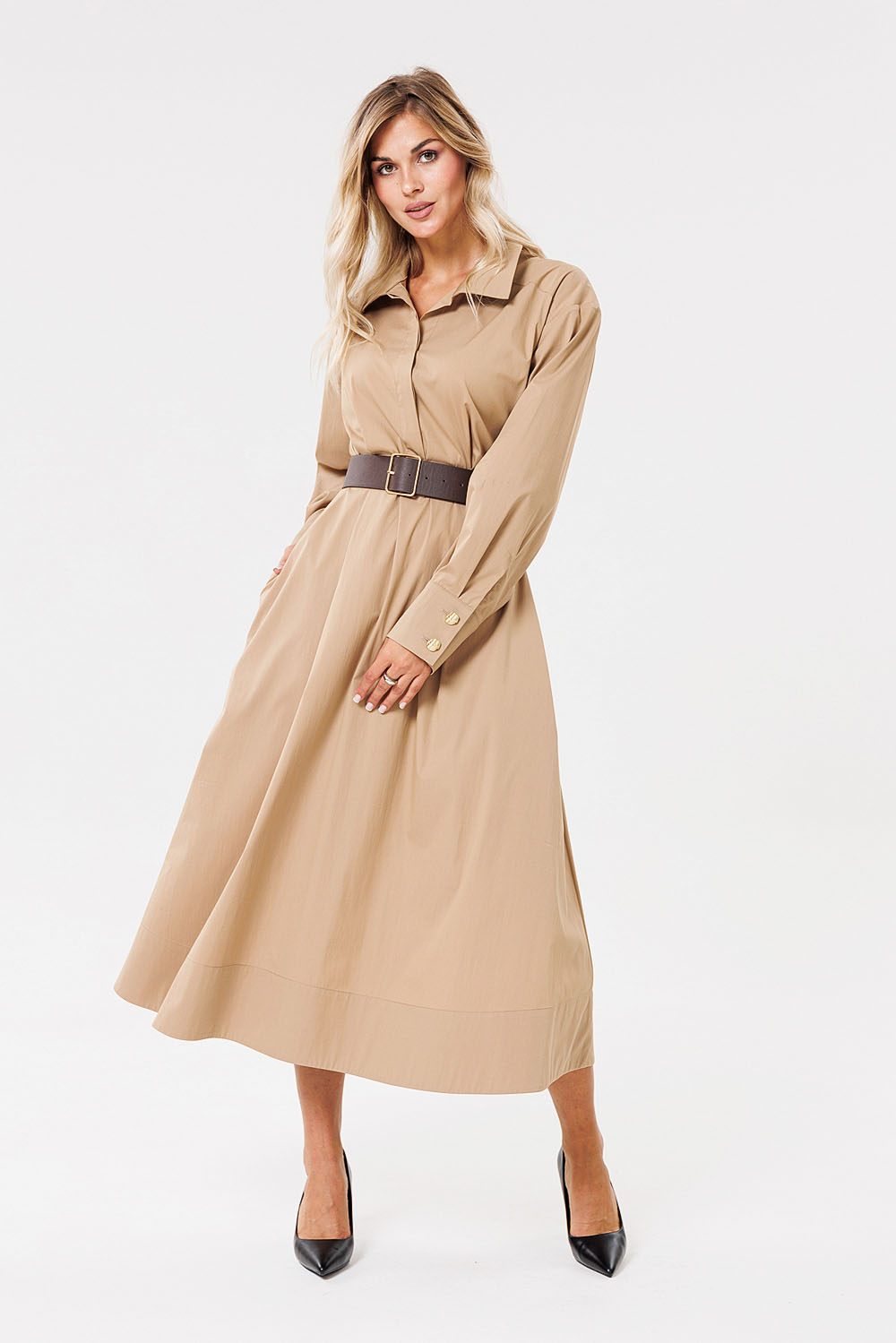 Платье женское из текстильной ткани, отрезное по линии талии, расширенное к низу. По юбке спереди и сзади заложены складки. В боковых швах расположены карманы. По центру лифа есть потайная застежка на петлях-пуговицах. Верхняя часть спинки с кокеткой. Рукав одношовный, низ рукава обработан манжетой на петлях-пуговицах. В платье спущенное плечо. Вырез горловины обработан воротником со стойкой. Платье свободное. Низ платья обработан широкой обтачкой с закрытым швом. Пояс в комплект не входит.