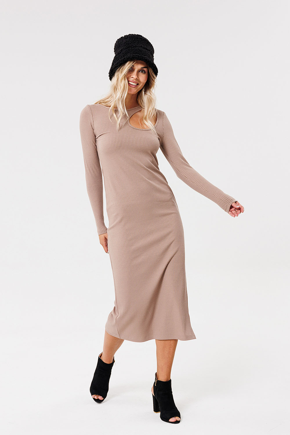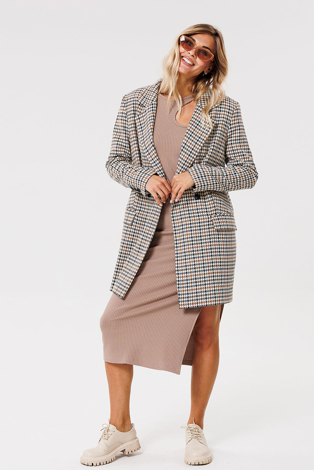 Платье женское прилегающего силуэта из трикотажной ткани. В боковом шве расположен разрез. Горловина оформлена декоративным вырезом. Рукав прямой одношовный.
