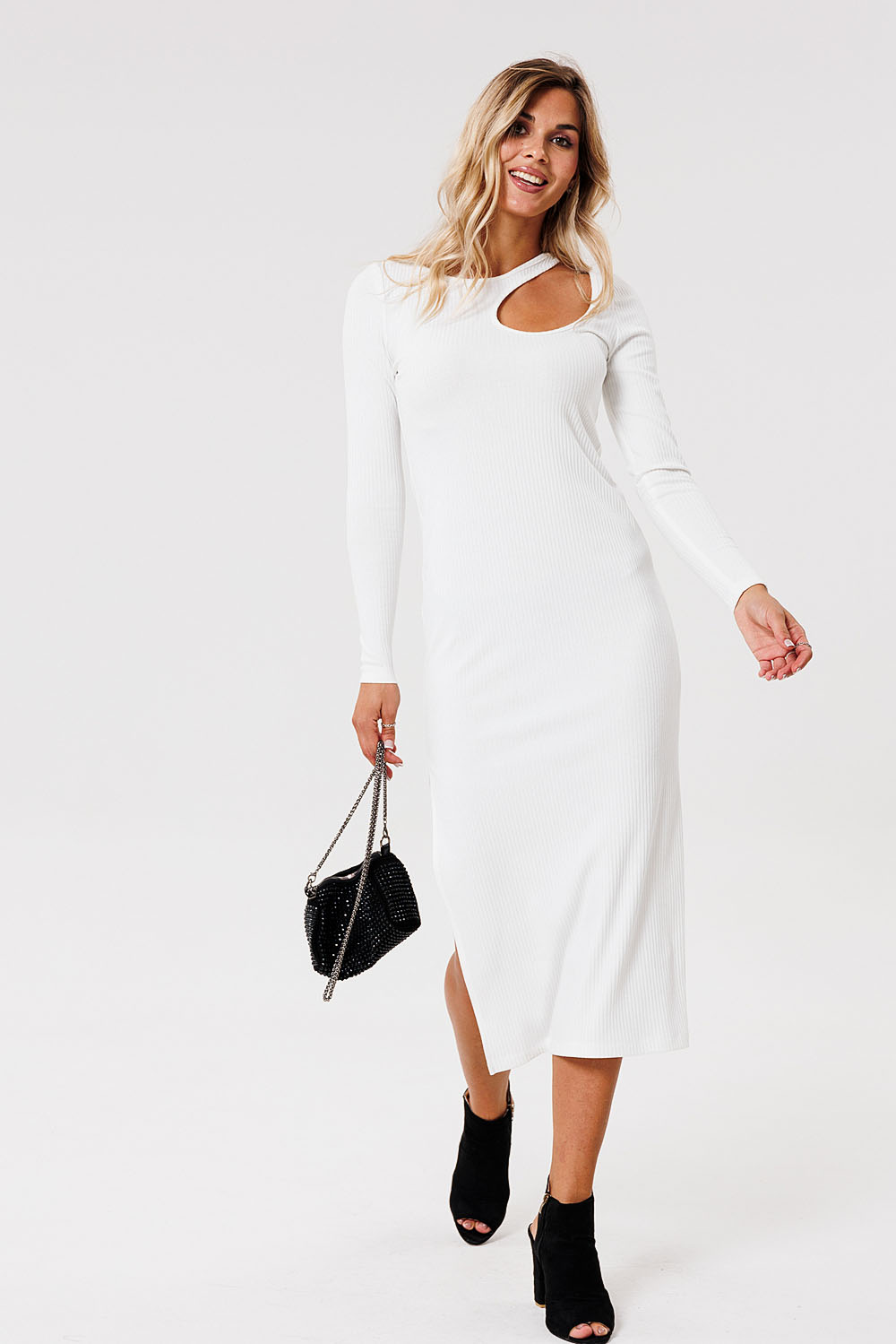 Платье женское прилегающего силуэта из трикотажной ткани. В боковом шве расположен разрез. Горловина оформлена декоративным вырезом. Рукав прямой одношовный.