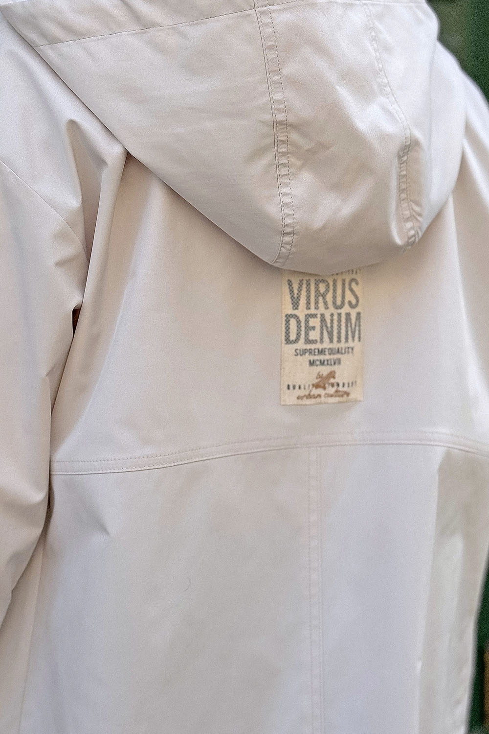 Куртка женская из текстильной ткани (водоотталкивающая) прямого силуэта. По переду расположены декоративные подрезы с прорезными карманами. Спинка состоит из 2-ух частей. На верхней части расположена кокетка и настрочной элемент. Нижняя часть со средним швом. Спущенное плечо, рукав прямой. Вырез горловины оформлен капюшоном с блочками и шнуром. Куртка с планкой, застегивается на молнию и кнопки. По низу изделия расположен шнур с наконечниками.