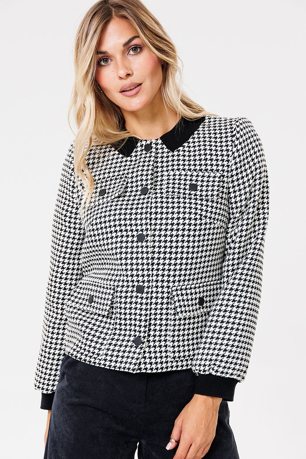 Жакет женский-бомбер на подкладке из текстильной ткани прямого силуэта. По переду расположены нагрудные вытачки, с накладными карманами и клапанами. Рукав прямой одношовный. Низ рукава со сборкой, оформлен манжетой. Вырез горловины оформлен довязом. Застежка жакета на кнопках.