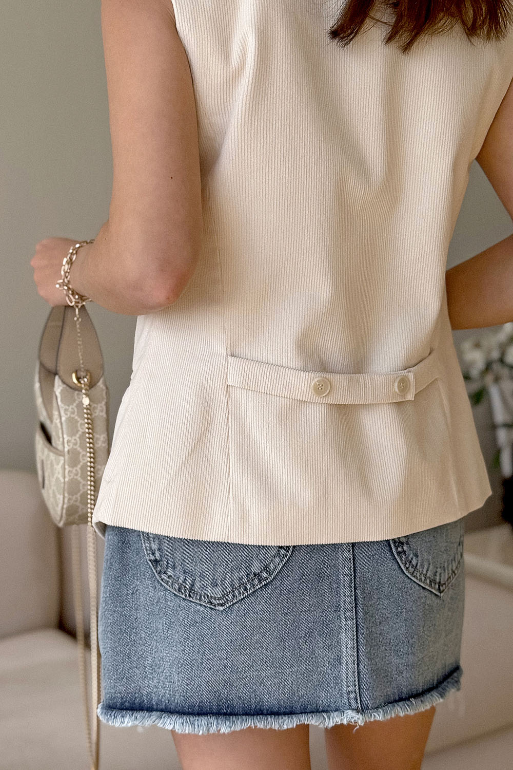Жилетка женская из текстильной ткани (вельвет-штрукс) на подкладке. По переду расположены нагрудные вытачки, прорезные карманы в “рамку”. Спинка с рельефами. По линии талии вставлен хлястик. Застежка на петлях-пуговицах. Вырез горловины V-образный.