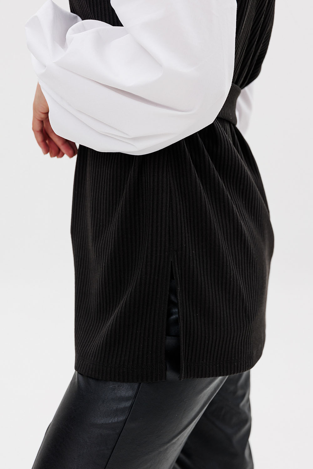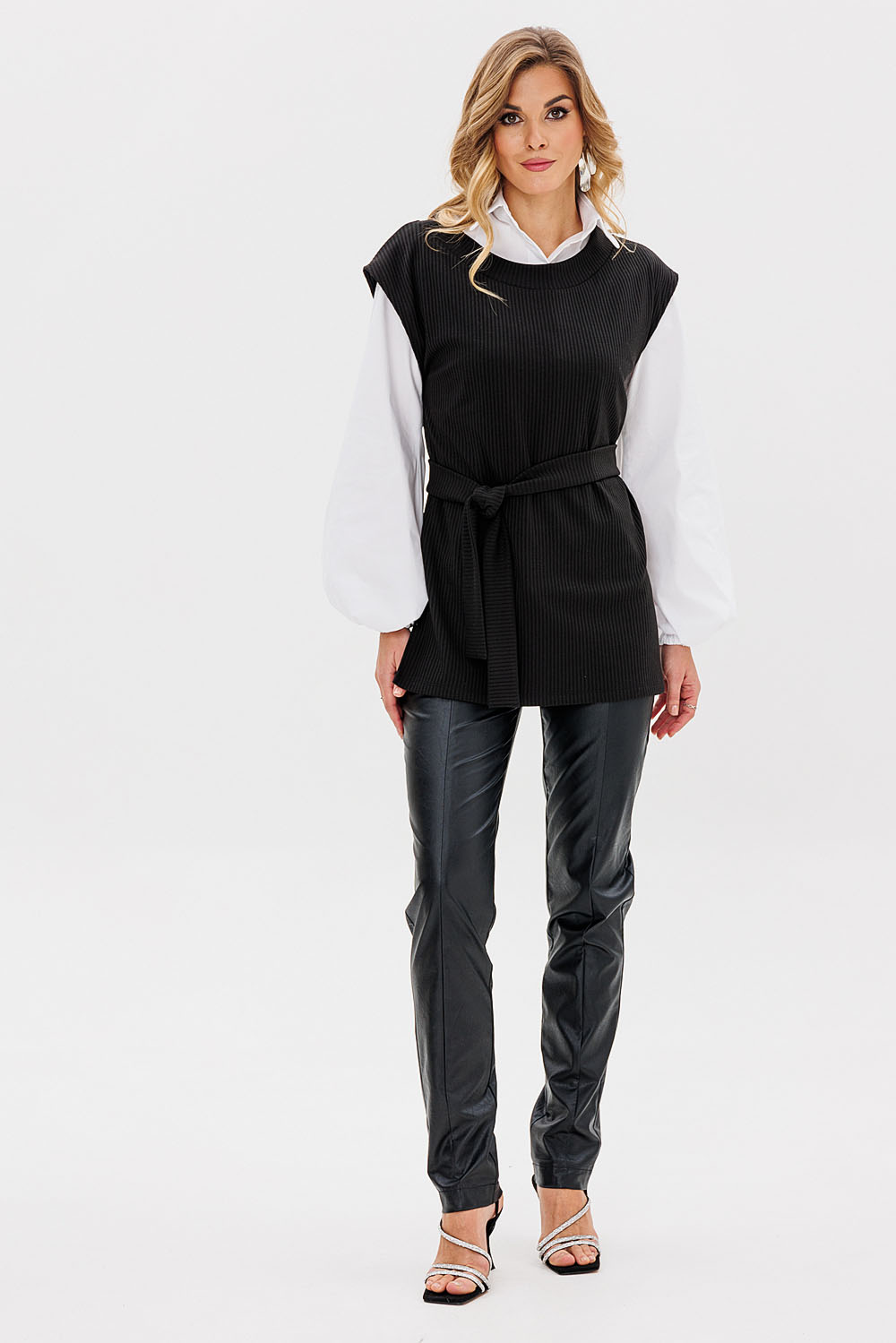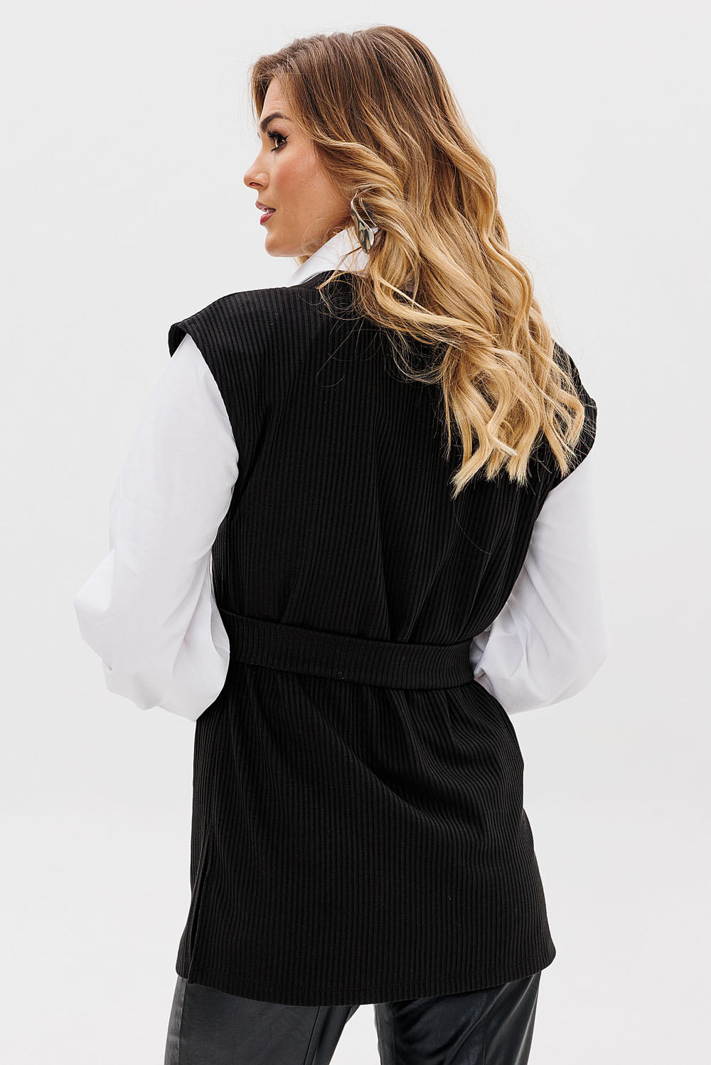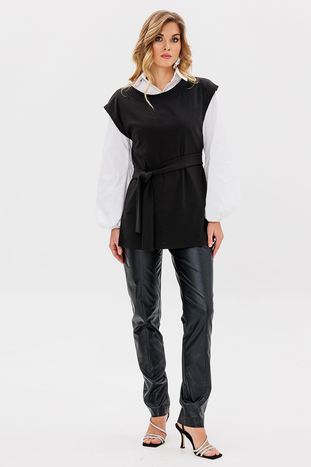 Жилетка женская из трикотажной ткани “лапша”. В боковых швах расположены разрезы. Пояс входит в комплект.