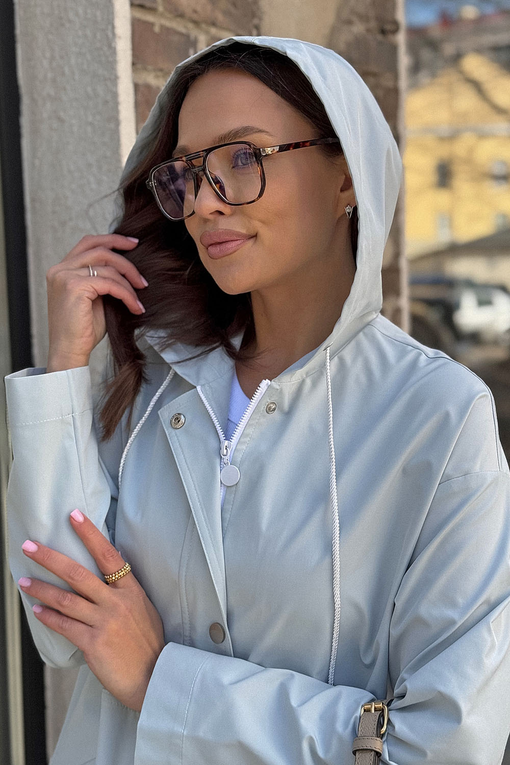 Куртка женская из текстильной ткани (водоотталкивающая) прямого силуэта. По переду расположены декоративные подрезы с прорезными карманами. Спинка состоит из 2-ух частей. На верхней части расположена кокетка и настрочной элемент. Нижняя часть со средним швом. Спущенное плечо, рукав прямой. Вырез горловины оформлен капюшоном с блочками и шнуром. Куртка с планкой, застегивается на молнию и кнопки. По низу изделия расположен шнур с наконечниками.
